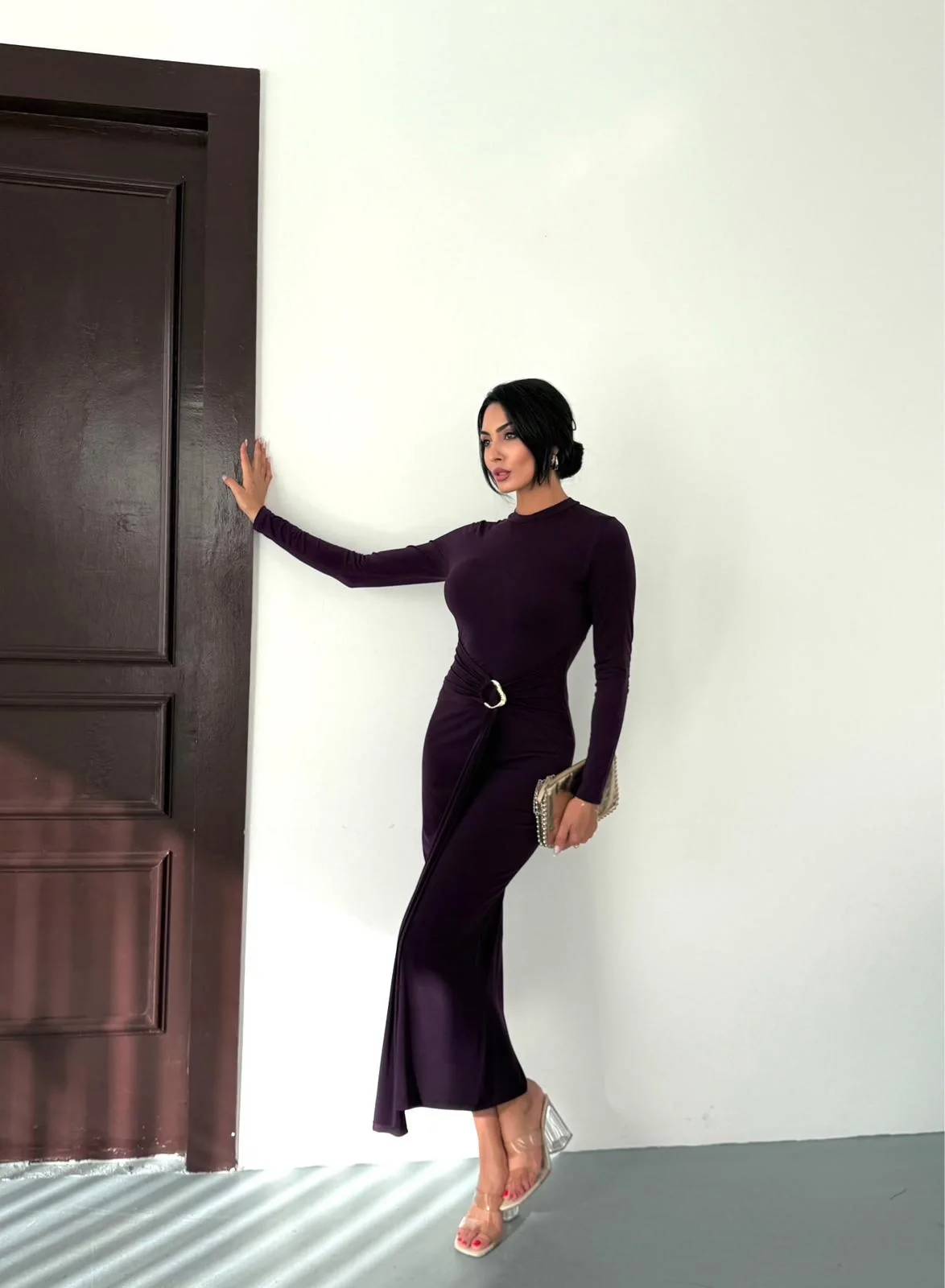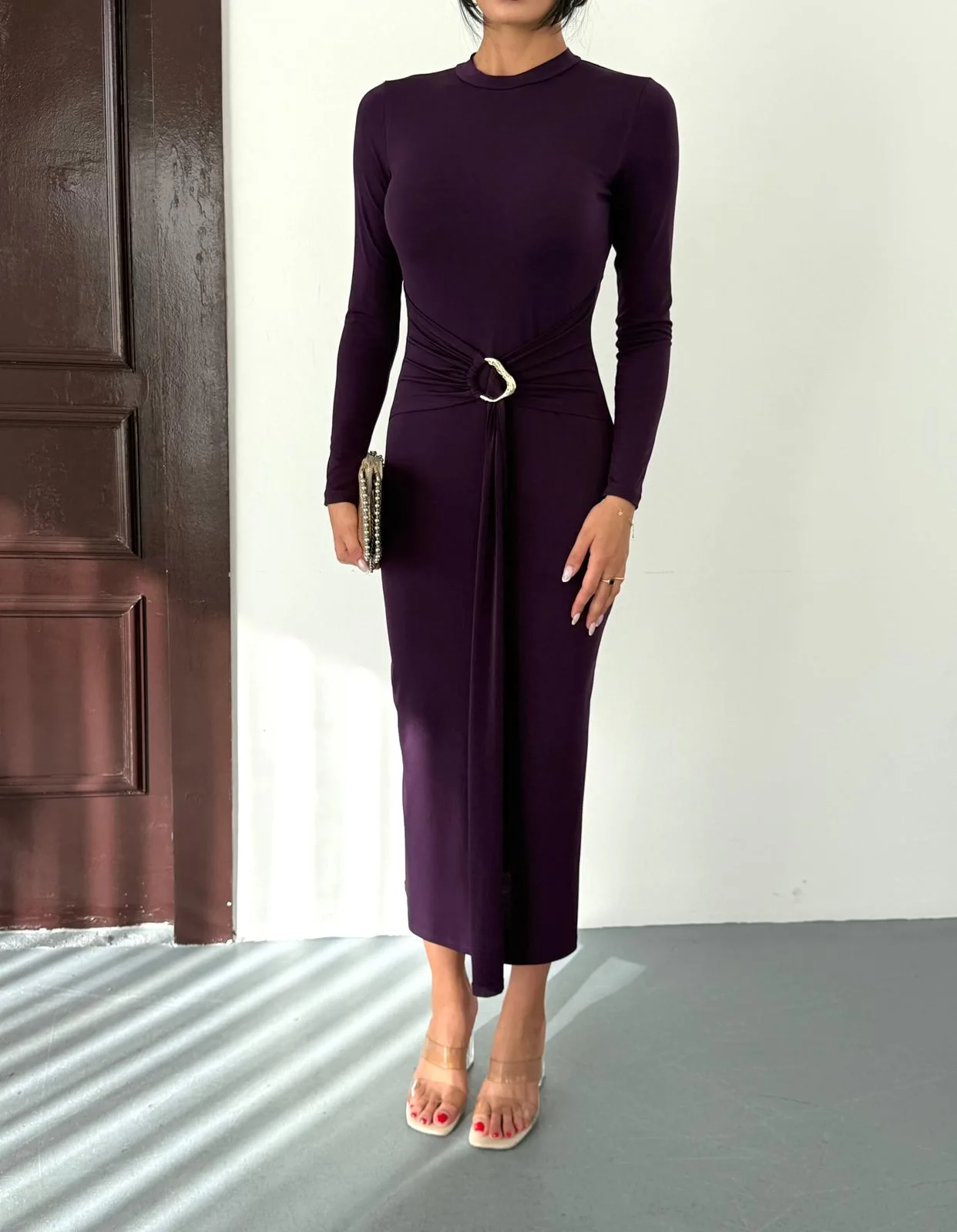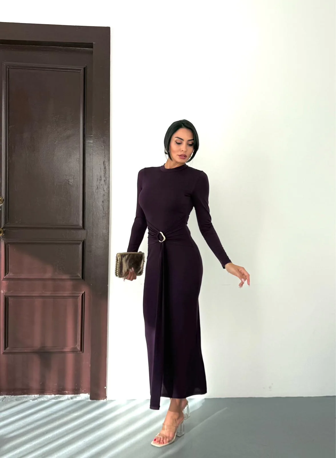 Kadın Mor Bisiklet Yaka Gold Aksesuarlı Kuşaklı Uzun Boy Vucudu Saran Elbise