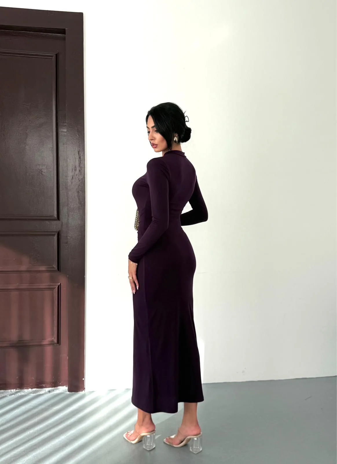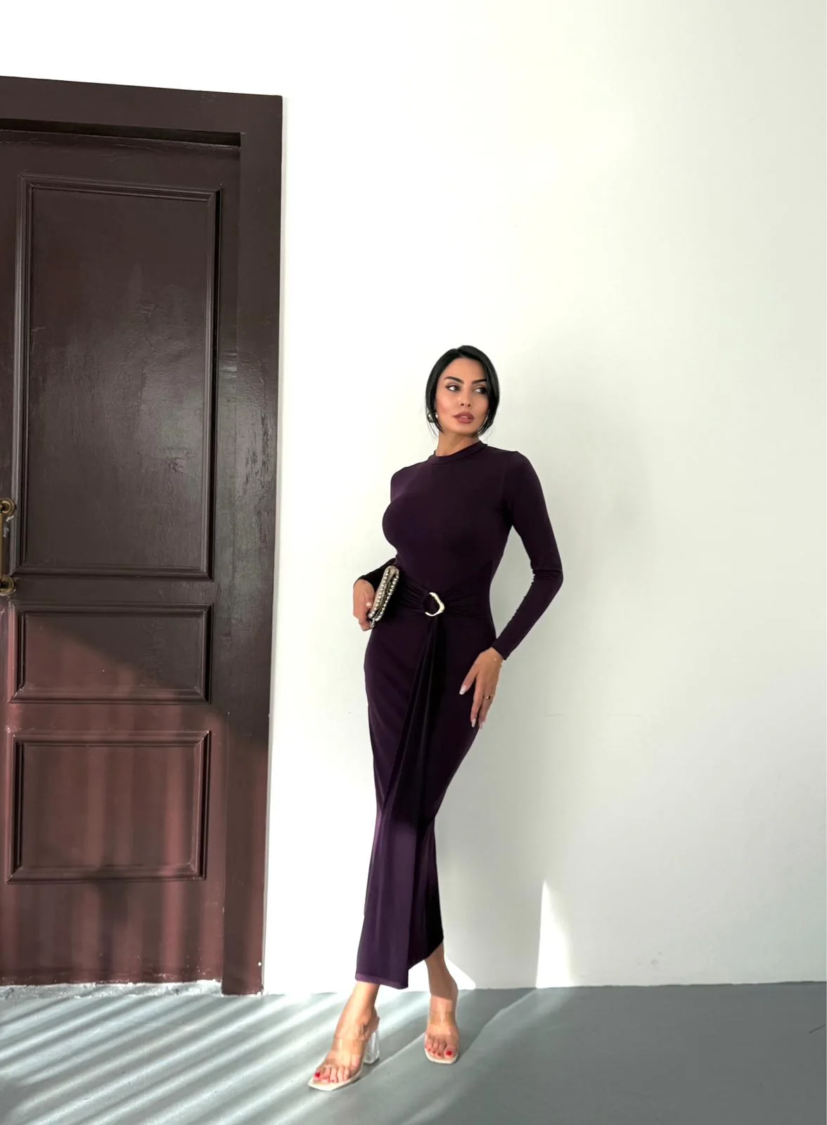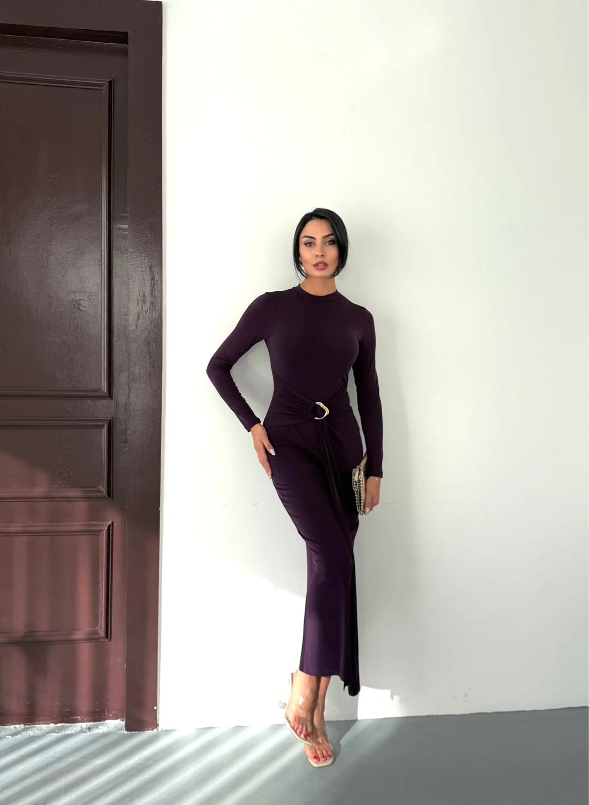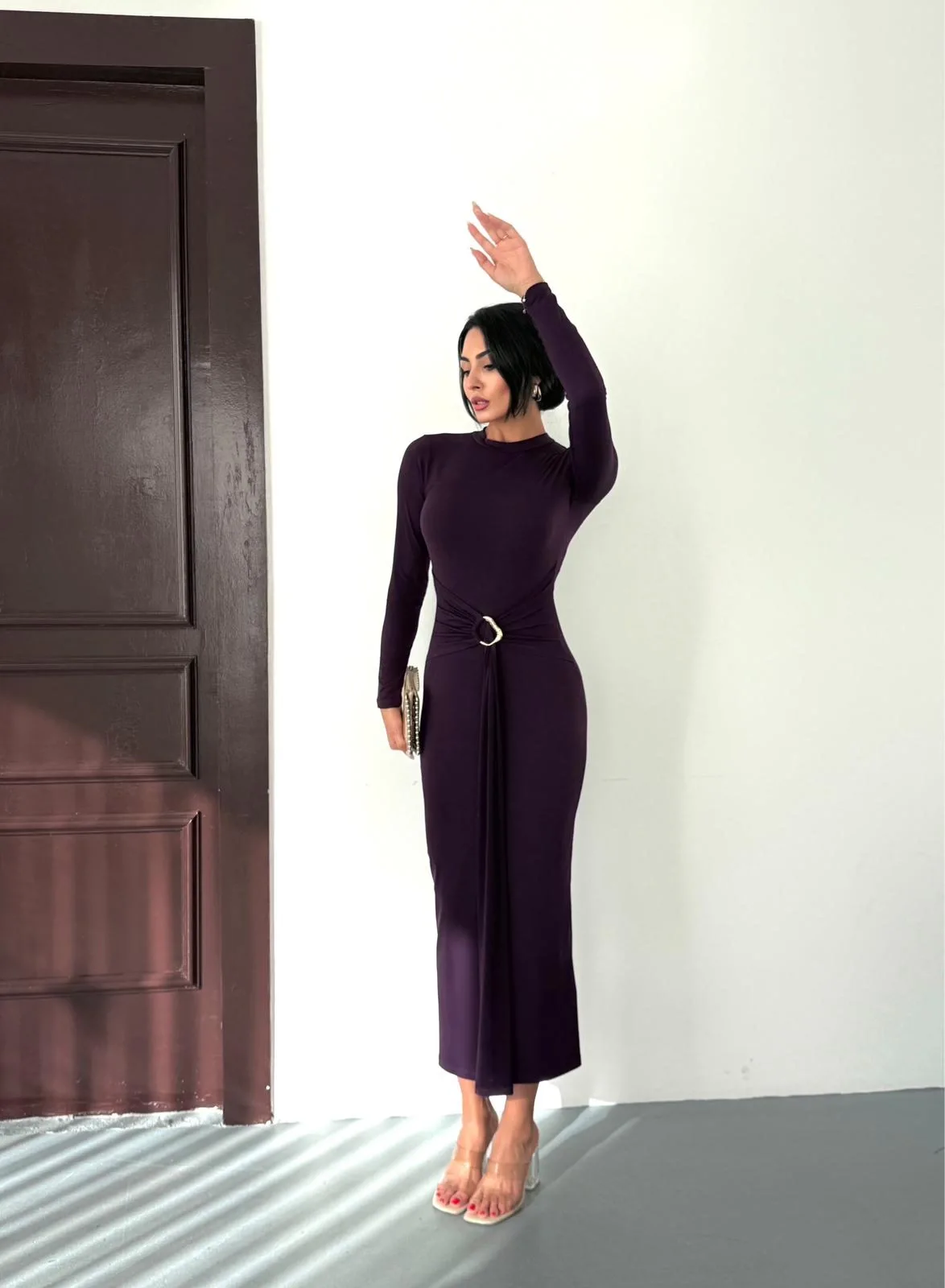 Kadın Mor Bisiklet Yaka Gold Aksesuarlı Kuşaklı Uzun Boy Vucudu Saran Elbise