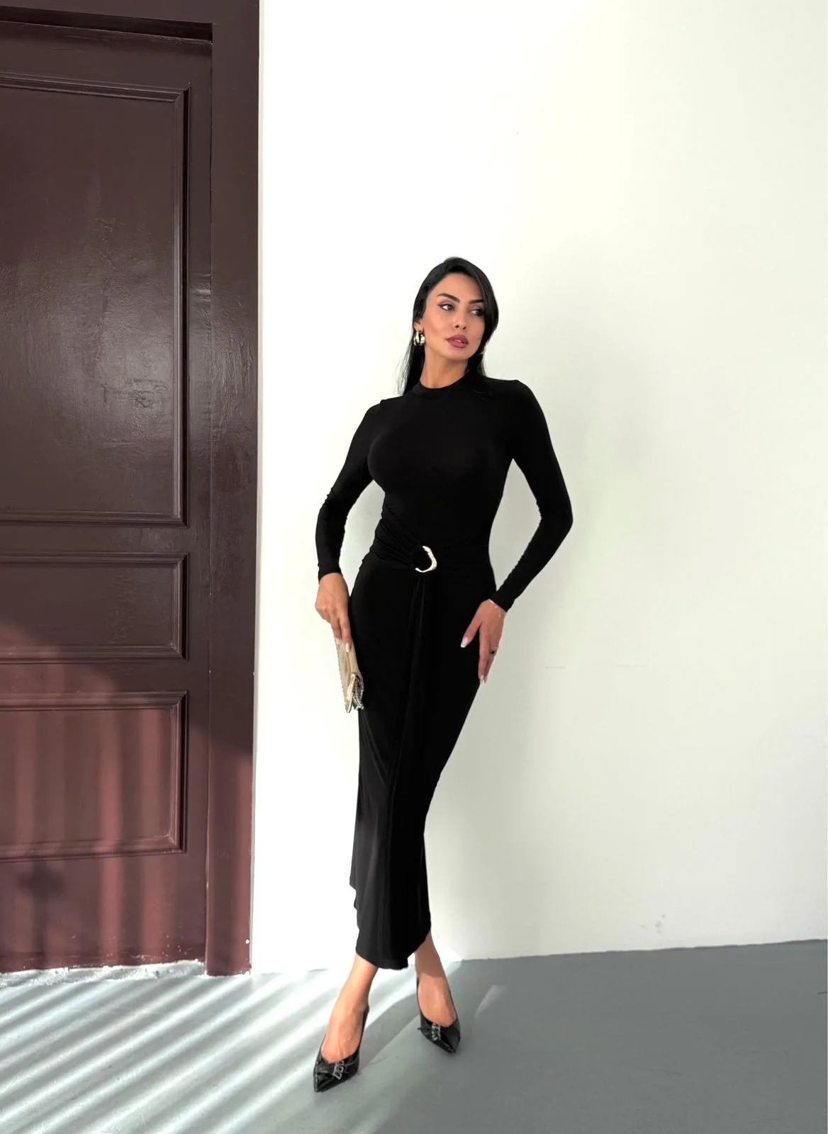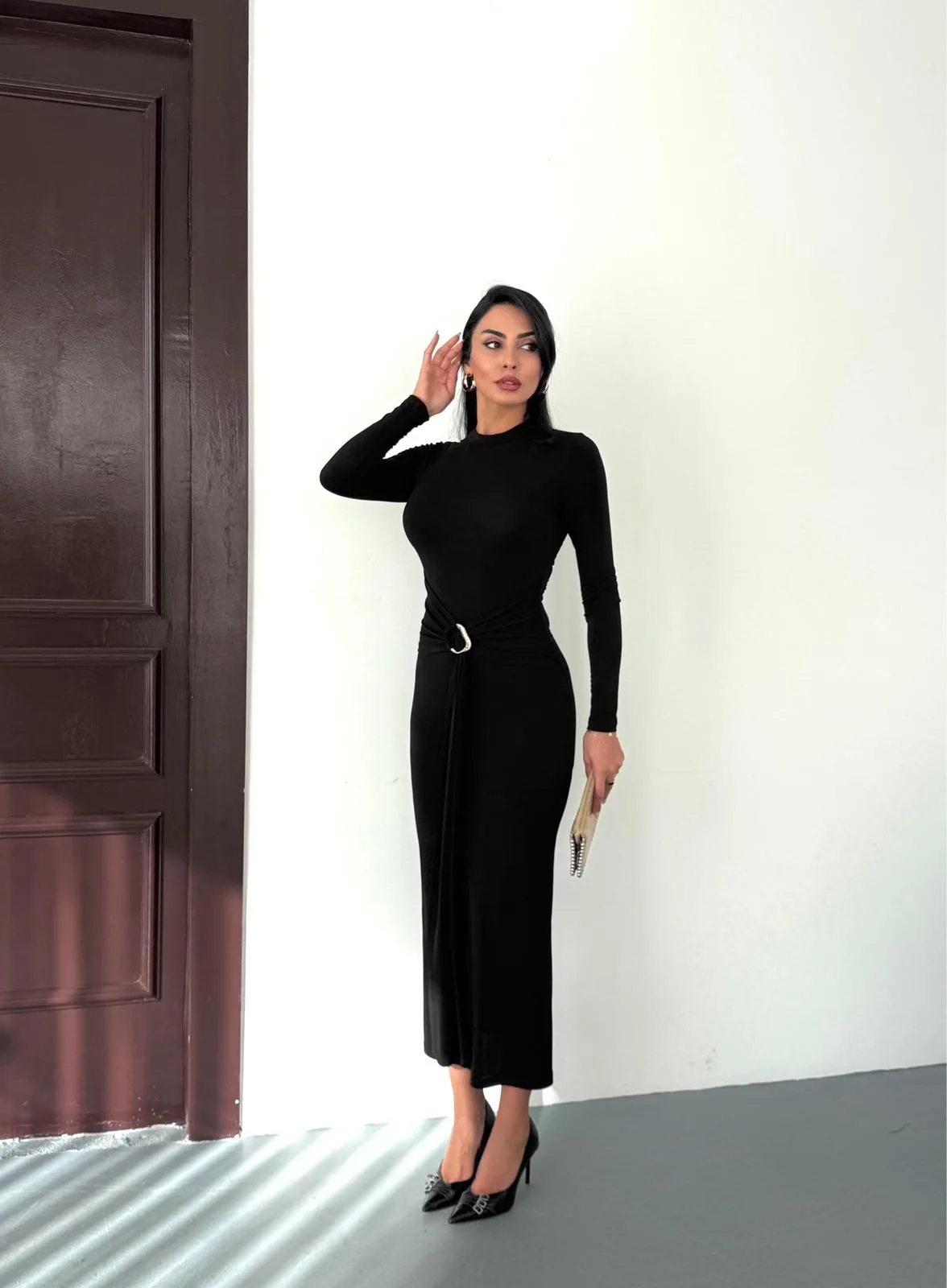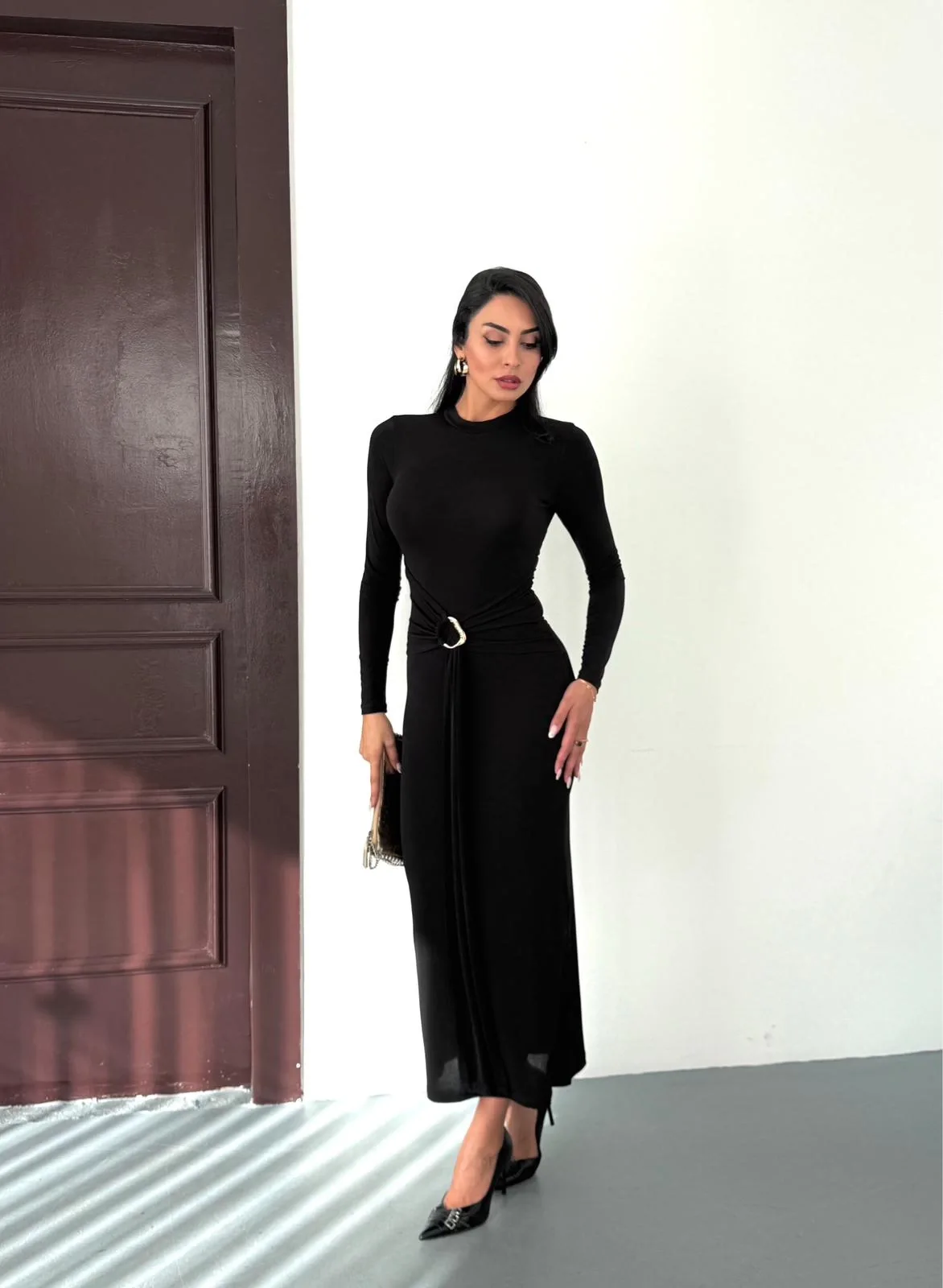 Kadın Siyah Bisiklet Yaka Gold Aksesuarlı Kuşaklı Uzun Boy Vucudu Saran Elbise