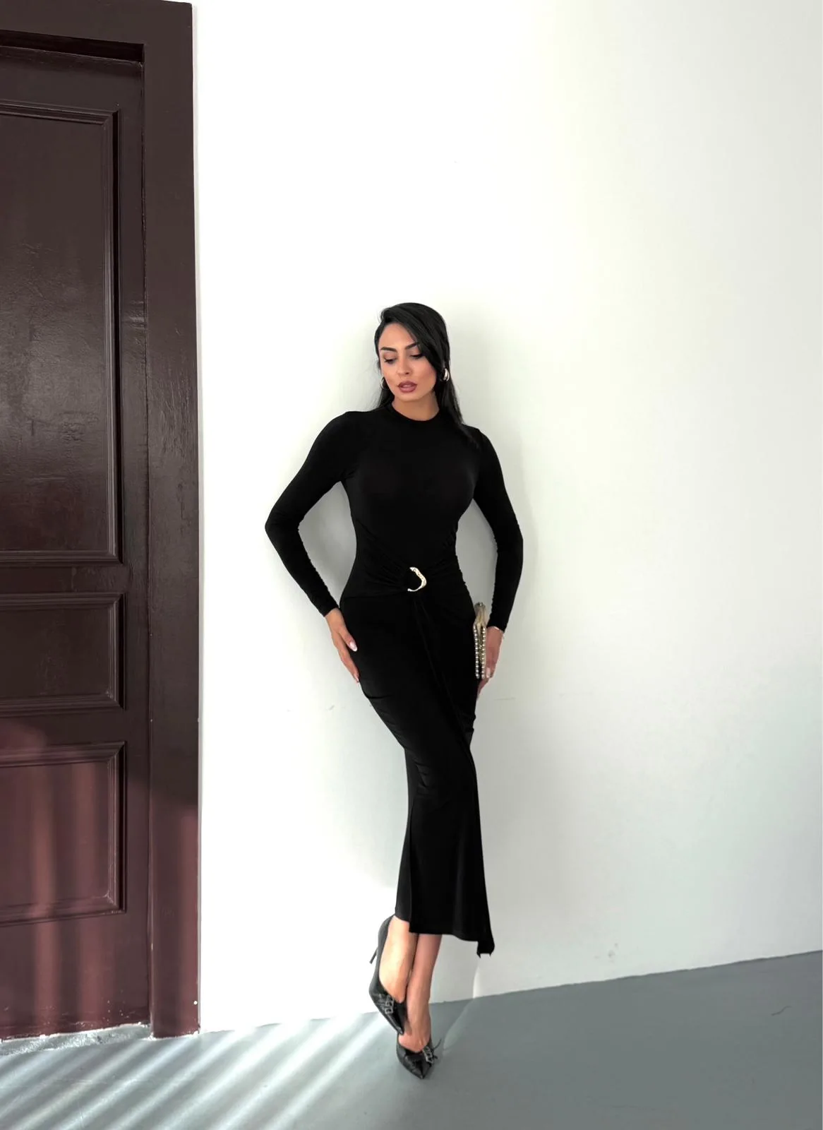Siyah Vucudu Saran Simli Parlak Büzgülü Drapeli Midi Boy Uzun Kollu Elbise