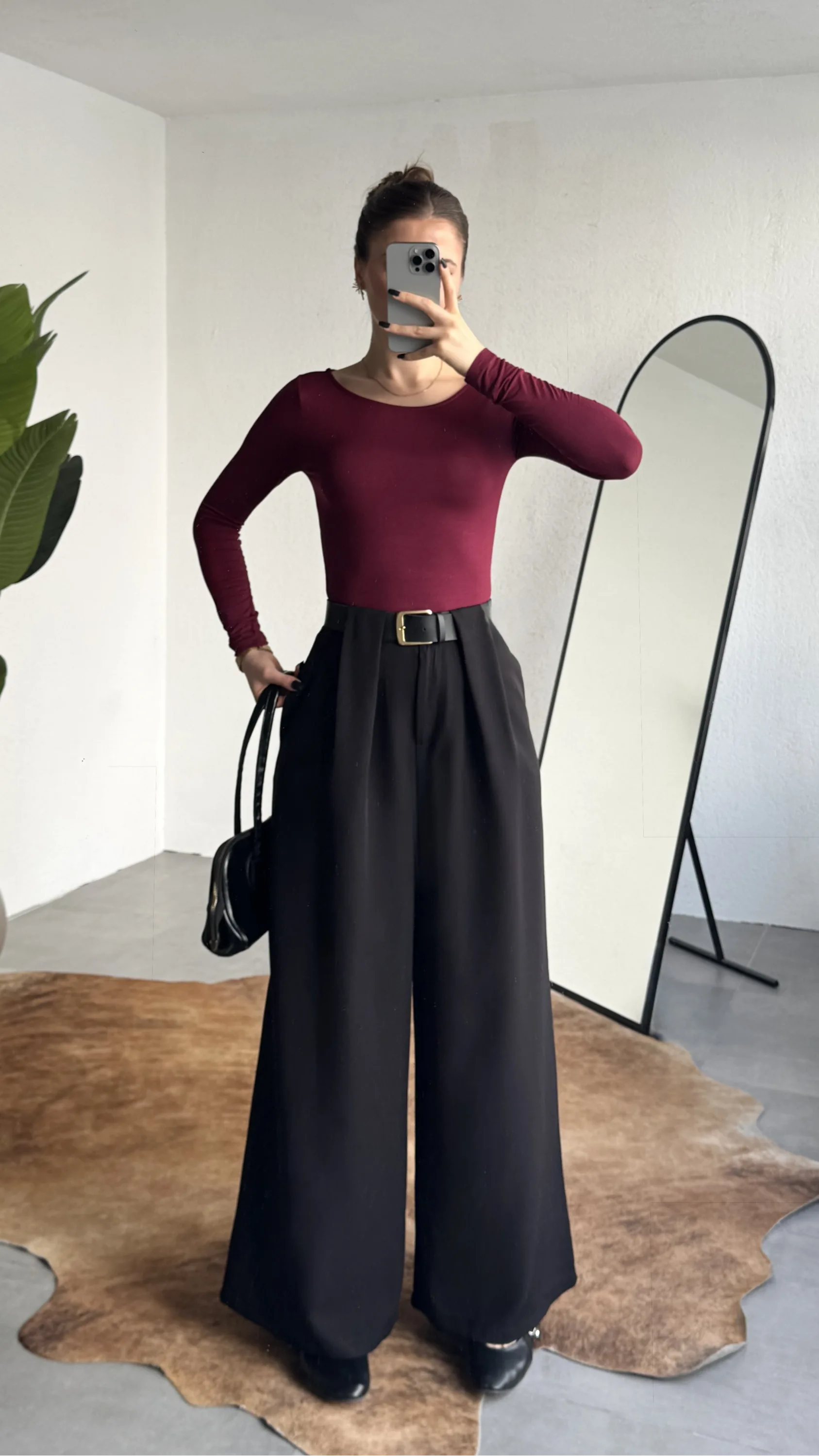 Modern kesimi ve zarif duruşu ile öne çıkan bu yüksek bel geniş paça pantolon, hem şık hem konforlu bir stil sunar.