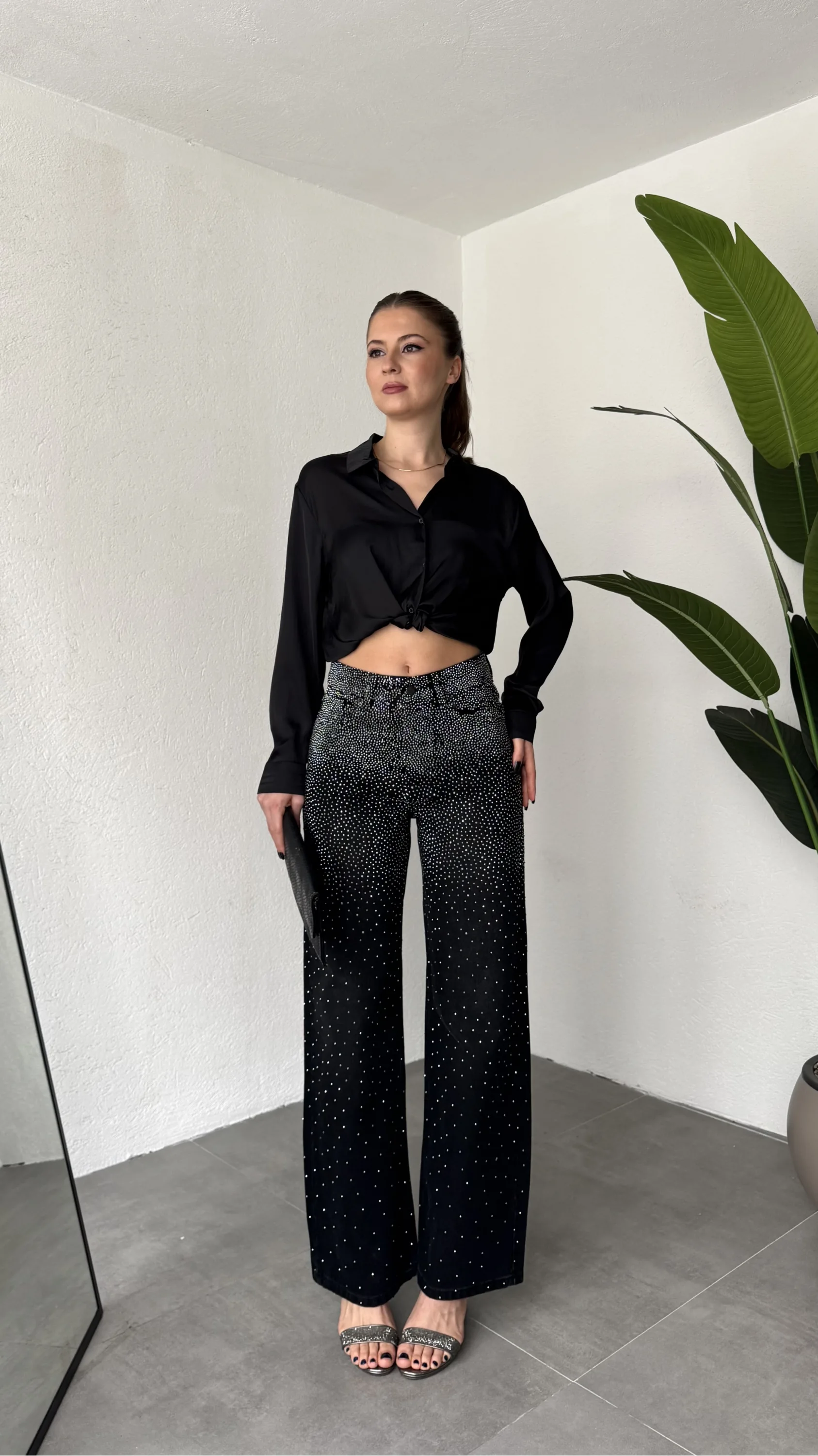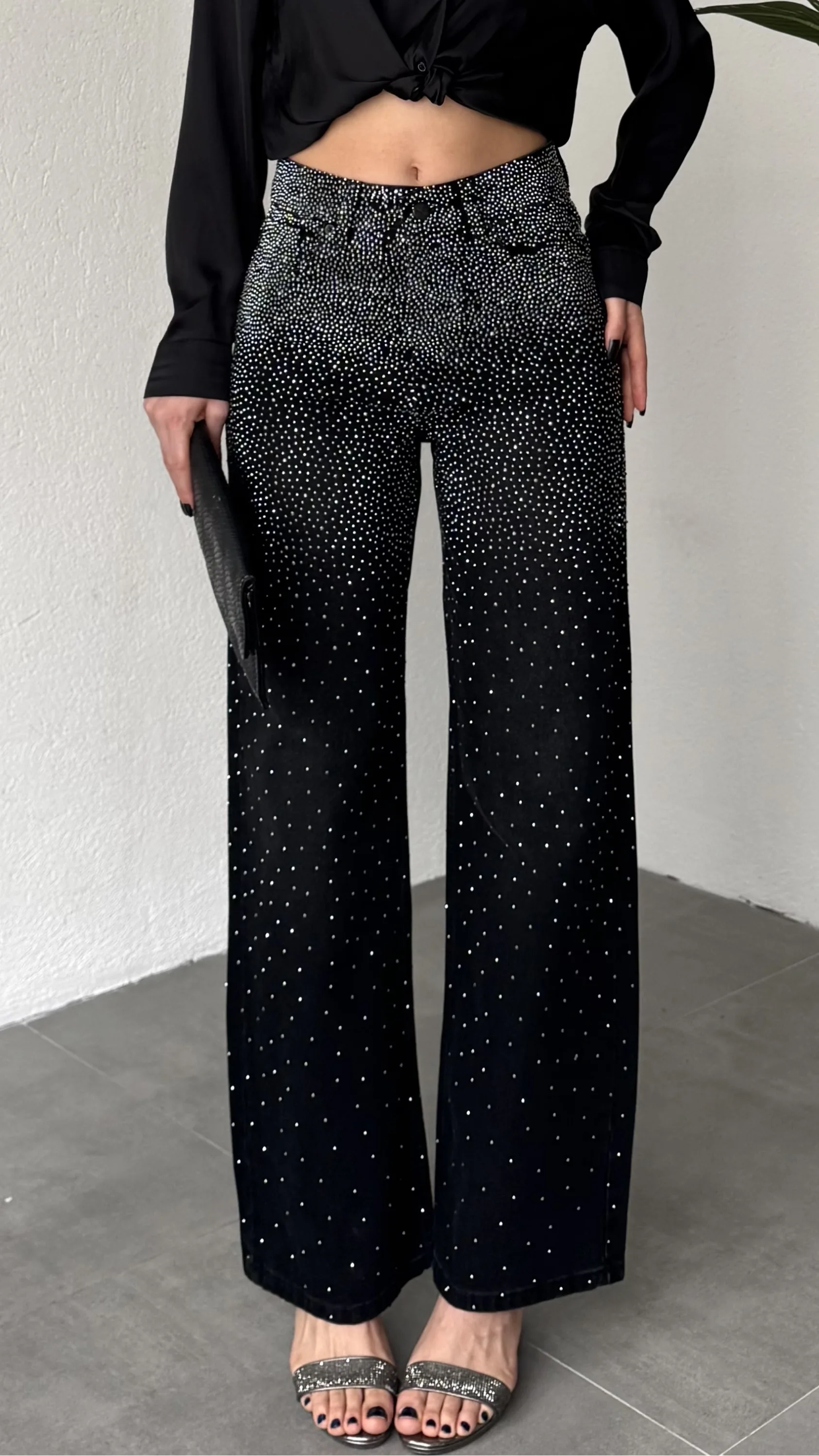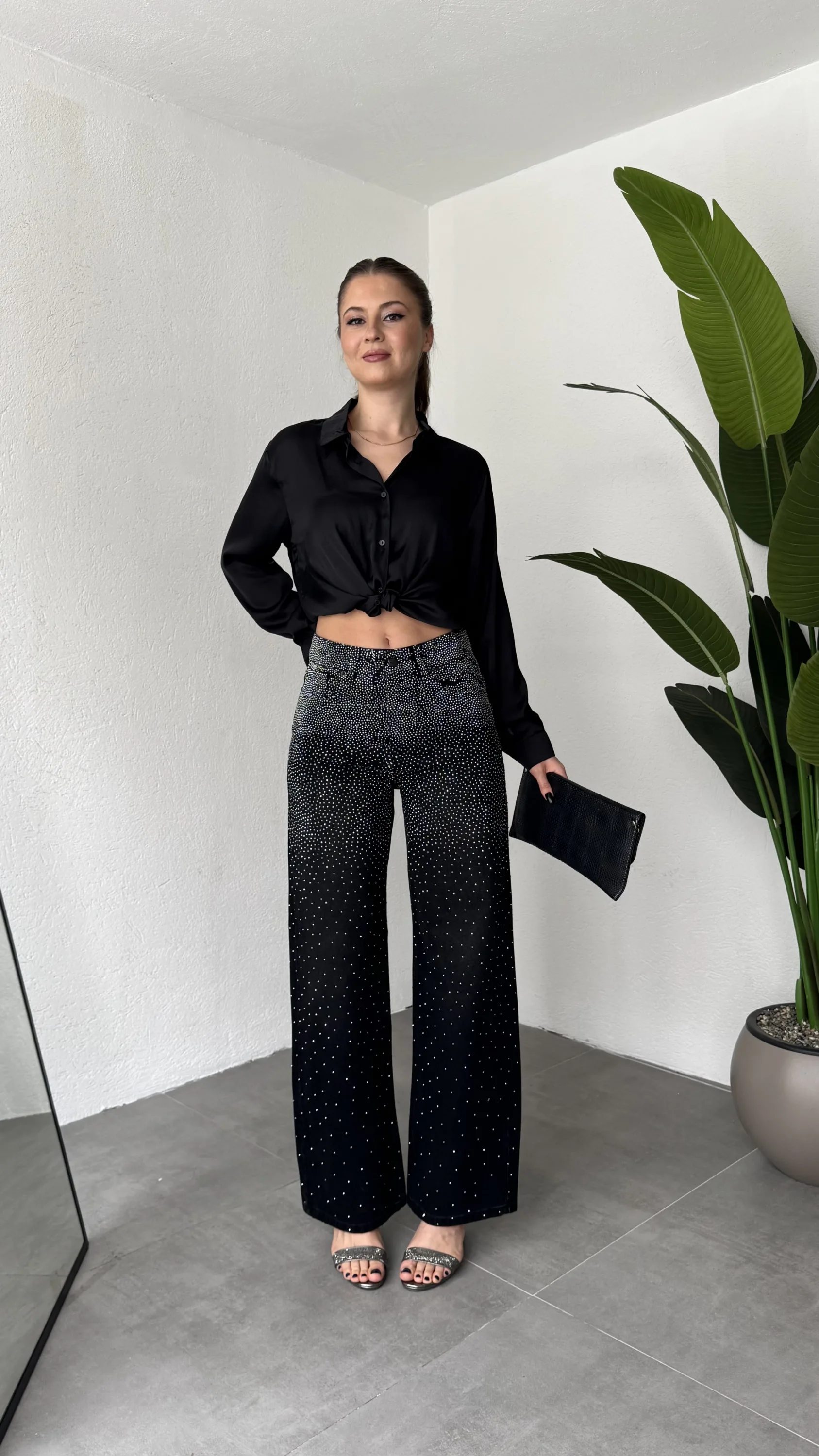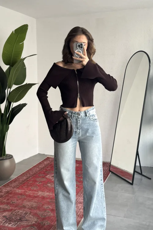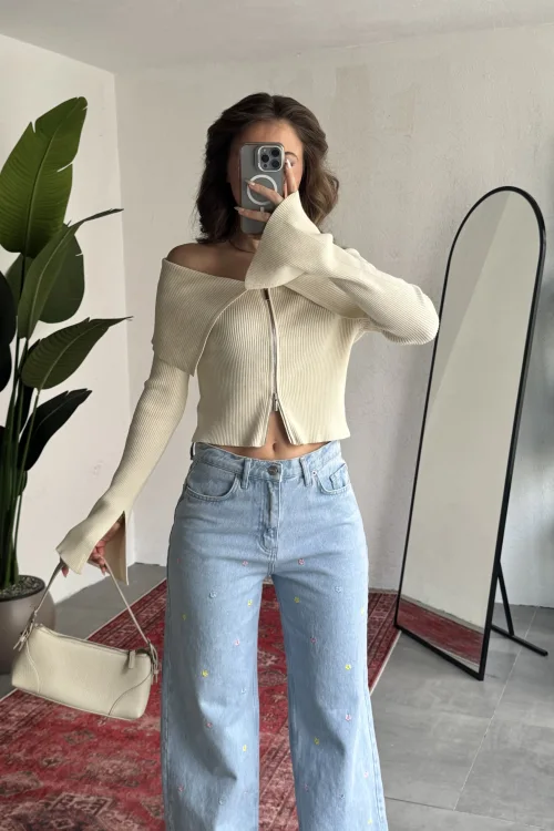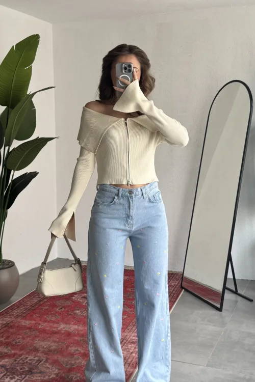 Yüksek bel ve wide leg bol paça kesimiyle hem rahat hem modern bir siluet sunan bu taş detaylı kadın jean pantolon, günlük şıklığı bir üst seviyeye taşır.