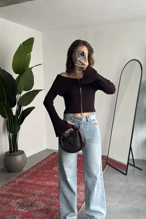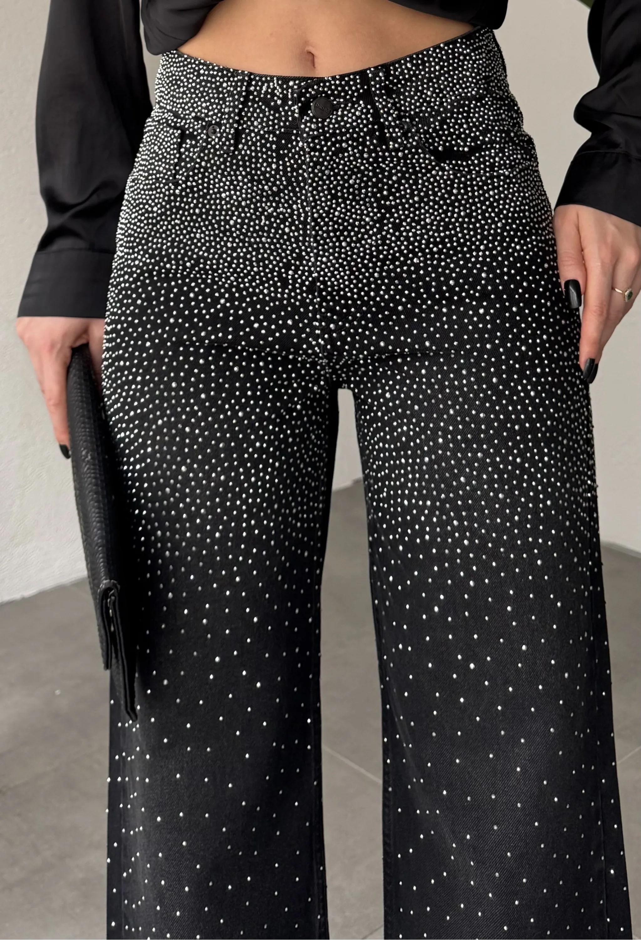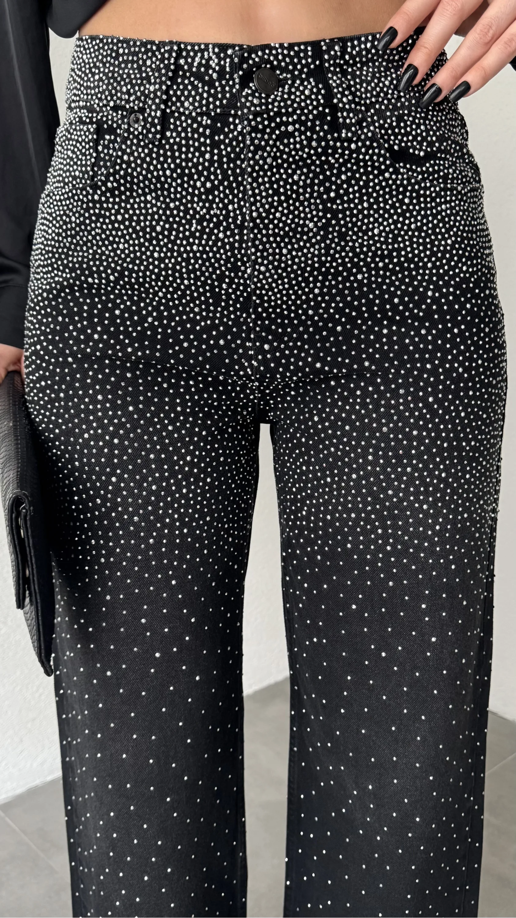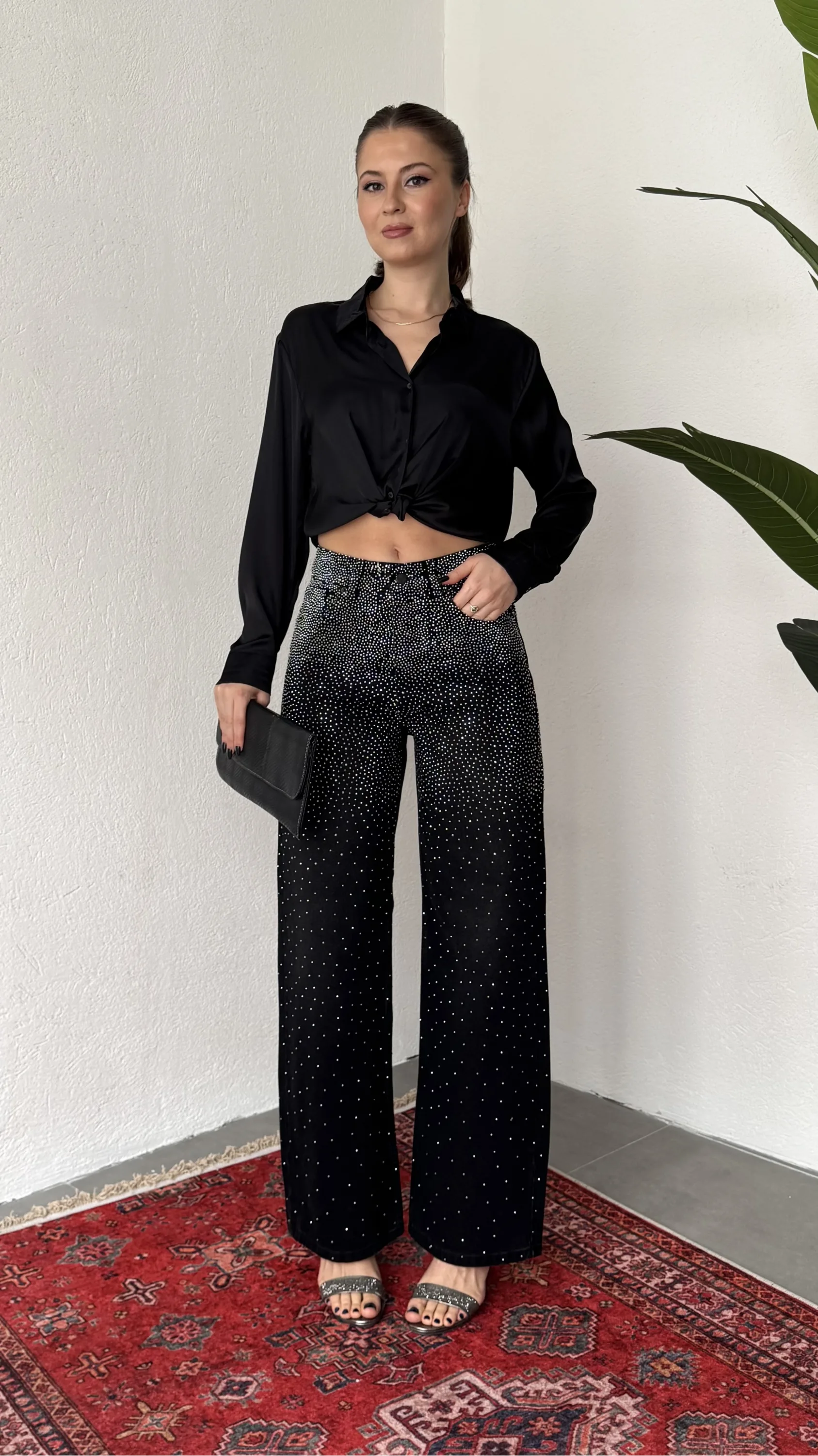Yüksek bel ve wide leg bol paça kesimiyle hem rahat hem modern bir siluet sunan bu taş detaylı kadın jean pantolon, günlük şıklığı bir üst seviyeye taşır.