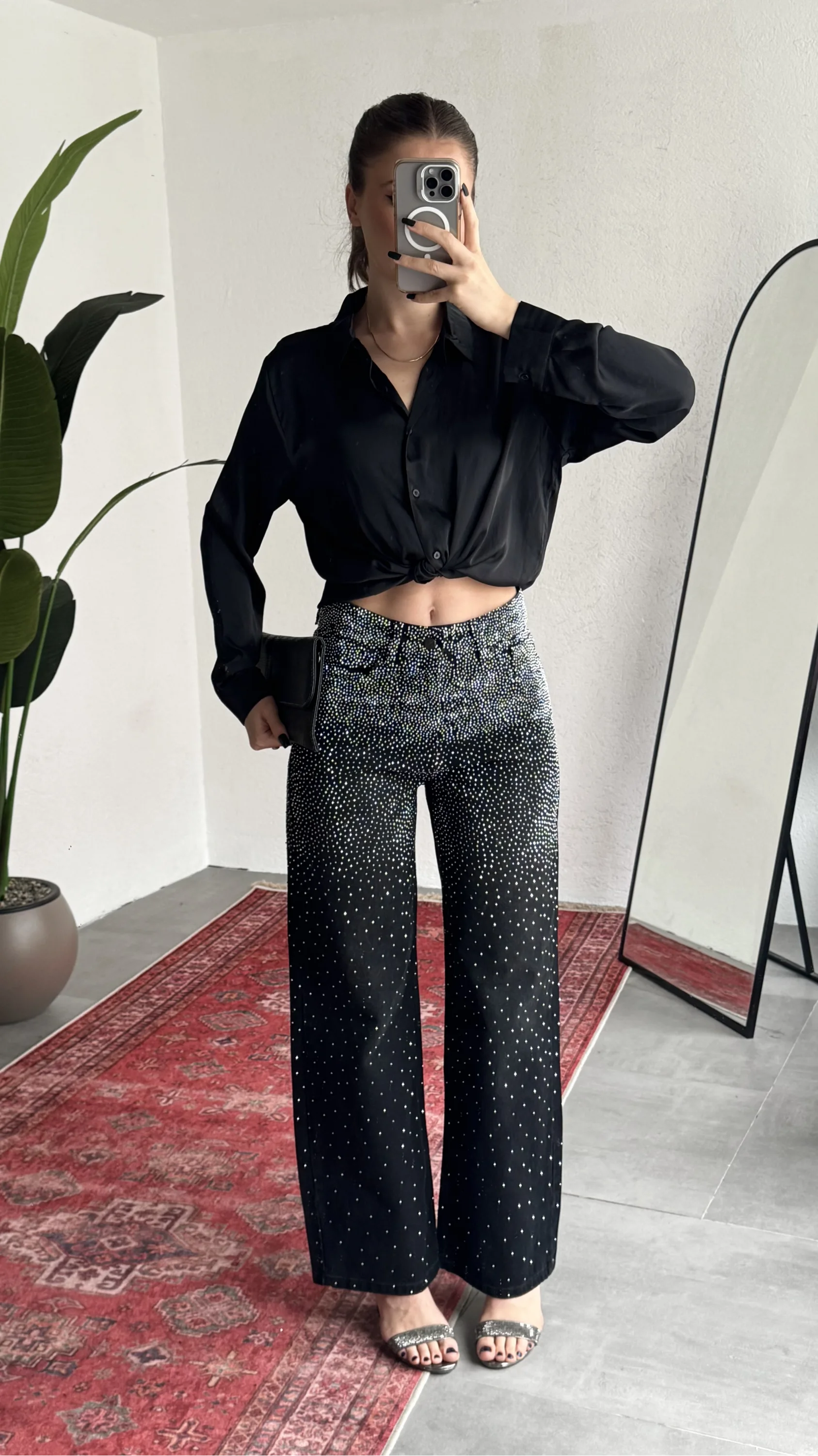 Tüm yüzeye dağılmış minimal taş detayları sayesinde hareketli ve dikkat çekici bir görünüm sağlar. Işıltılı dokusu gece kombinlerinde topuklu ayakkabı ile, gündüz kombinlerinde sneaker veya sandalet ile rahatlıkla kullanılabilir.