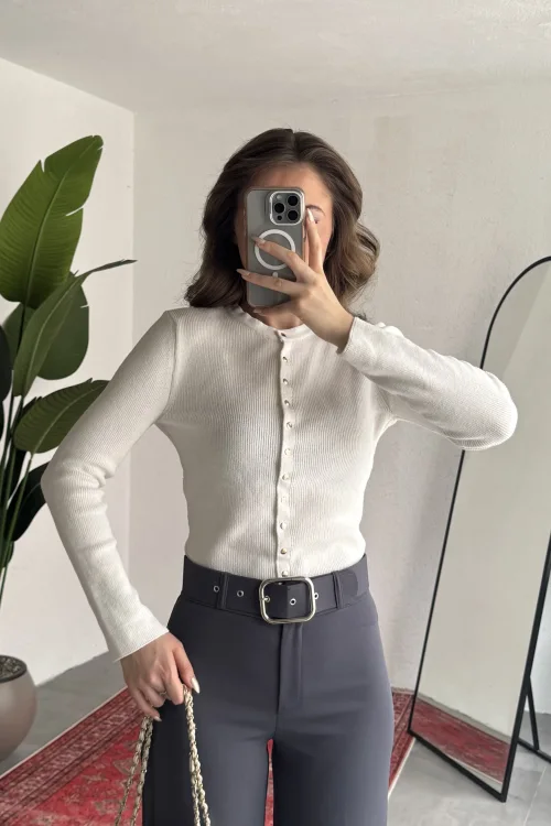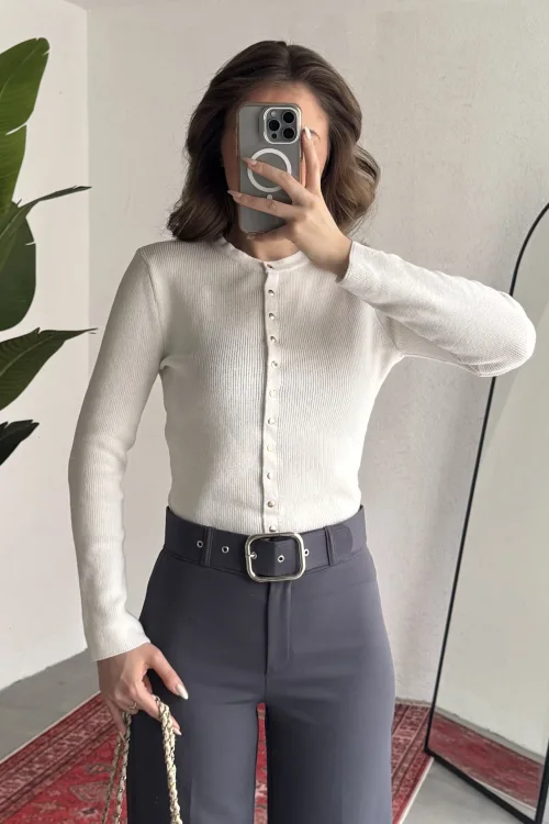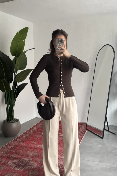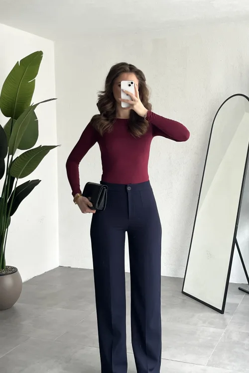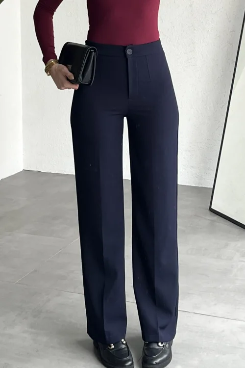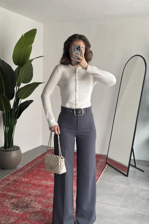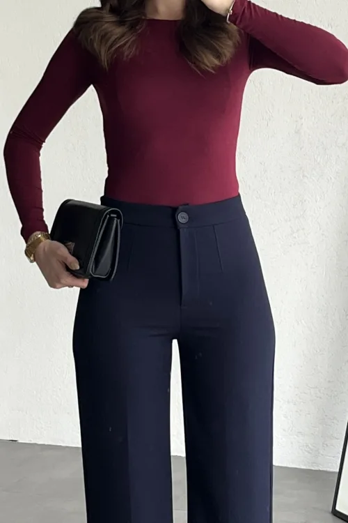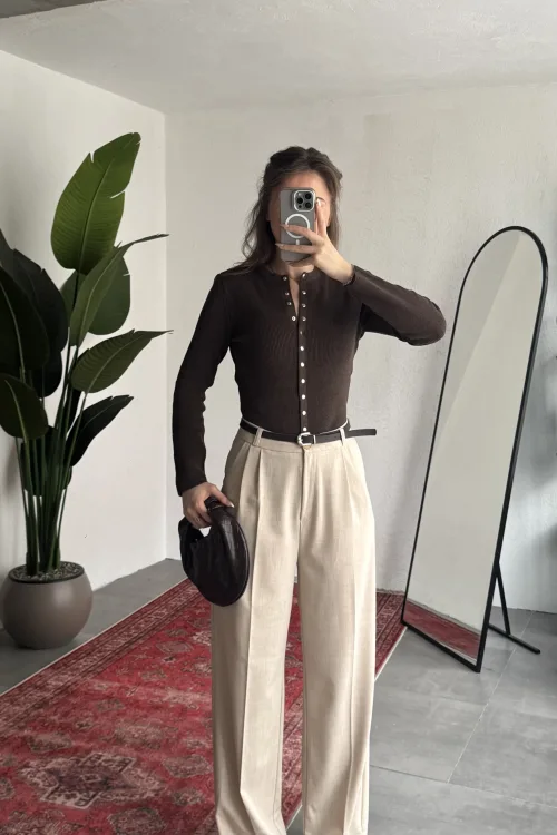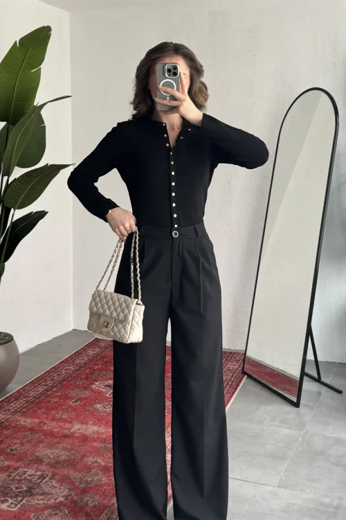 Yüksek bel formu bel hattını toparlarken, bol paça kesimi bacak boyunu daha uzun gösterir. Hem rahat hem trend bir görünüm sunar.