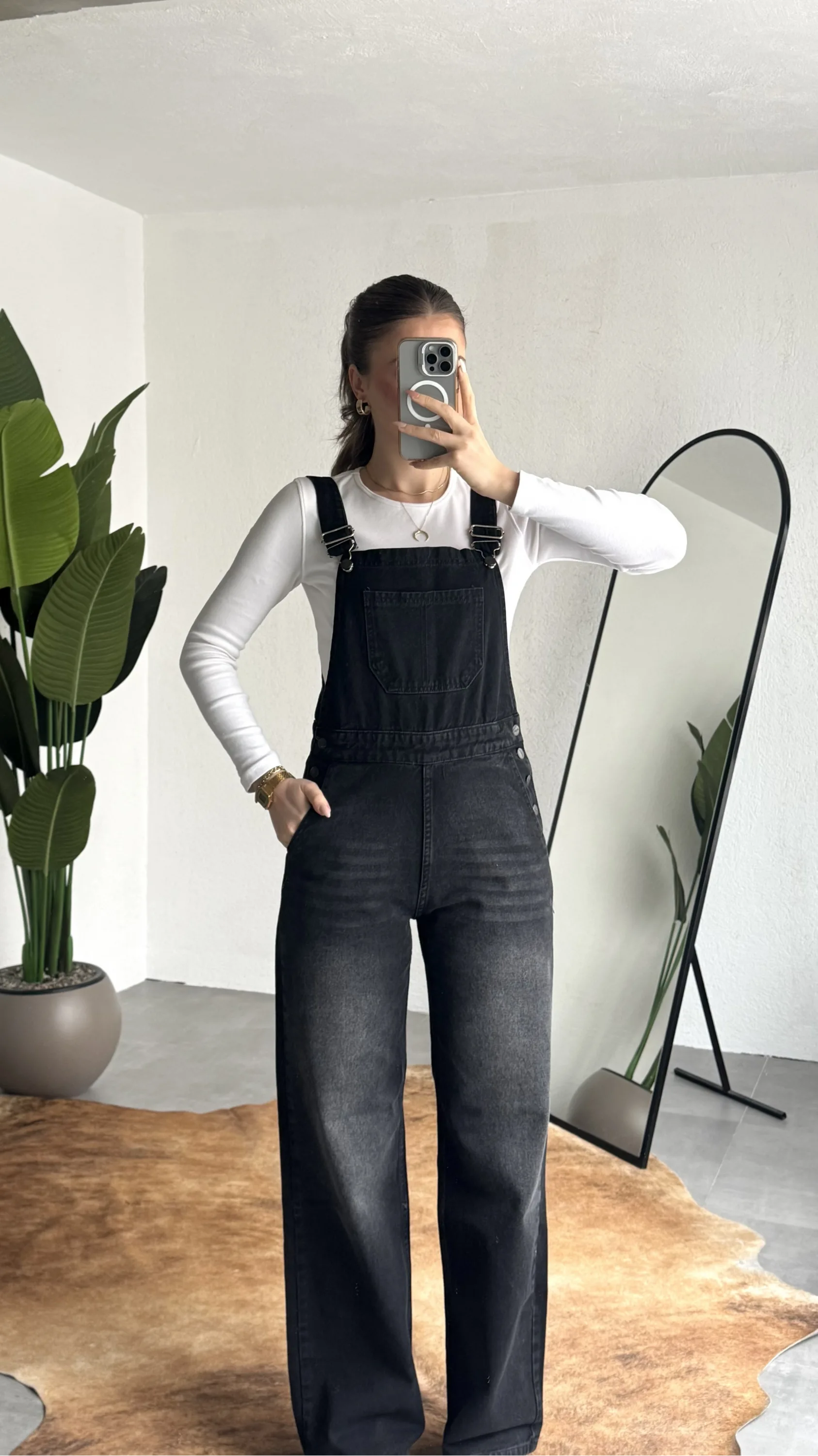 Zamansız denim şıklığını modern bir dokunuşla buluşturan askılı jean tulum, günlük stilinize cool ve rahat bir hava katar. Yumuşak ve dayanıklı kot kumaşı sayesinde gün boyu konfor sunarken, vücuda oturan üst formu ve düz paça kesimi ile dengeli bir siluet oluşturur.