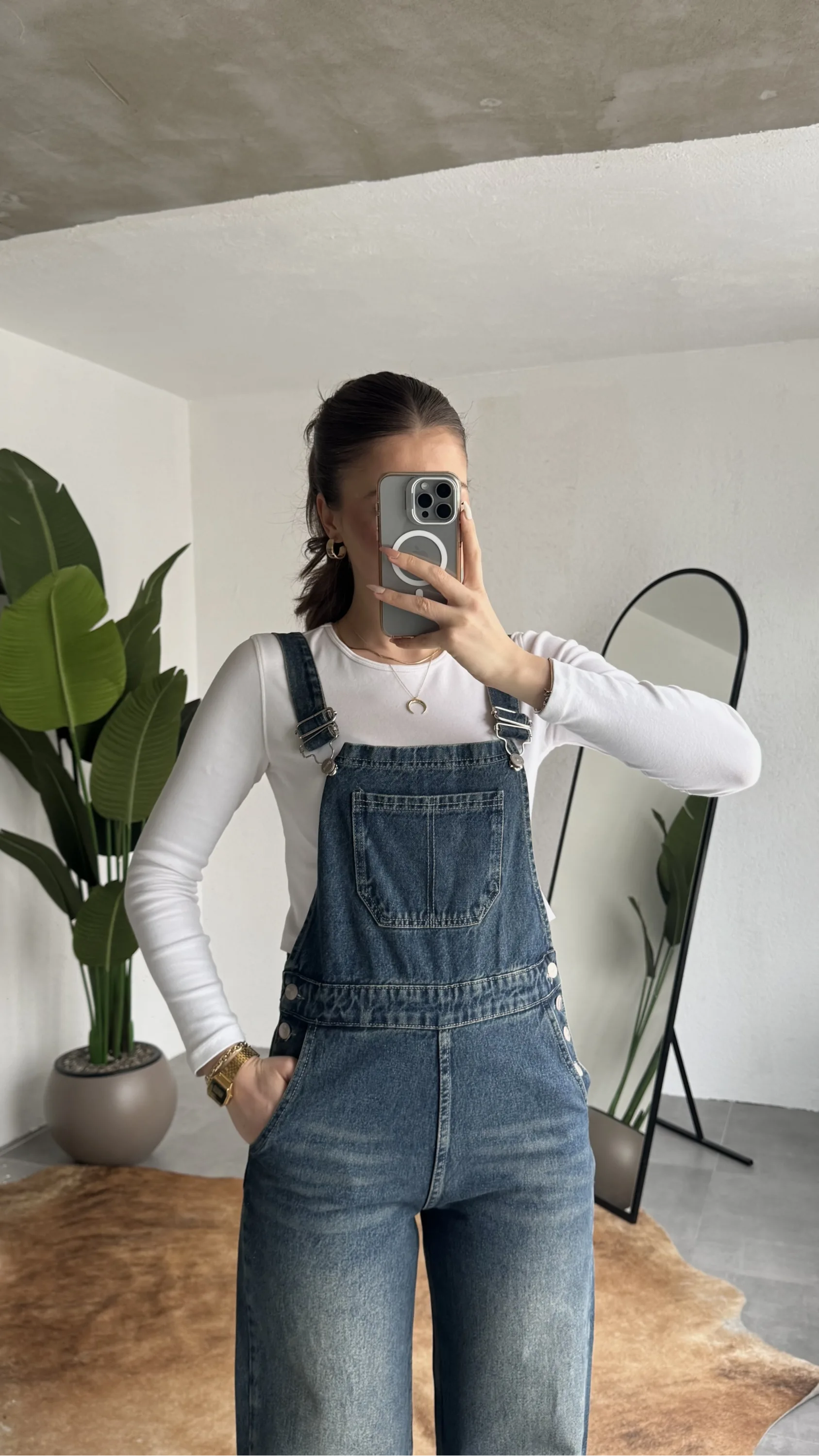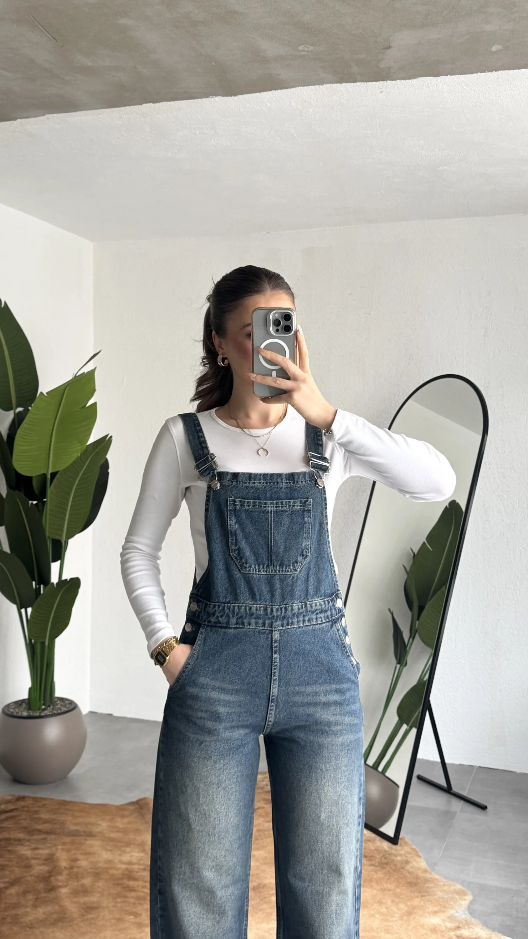 Zamansız denim şıklığını modern bir dokunuşla buluşturan askılı jean tulum, günlük stilinize cool ve rahat bir hava katar. Yumuşak ve dayanıklı kot kumaşı sayesinde gün boyu konfor sunarken, vücuda oturan üst formu ve düz paça kesimi ile dengeli bir siluet oluşturur.