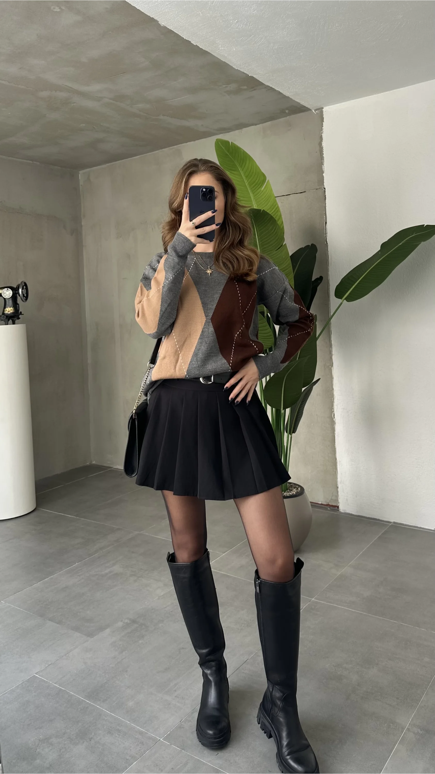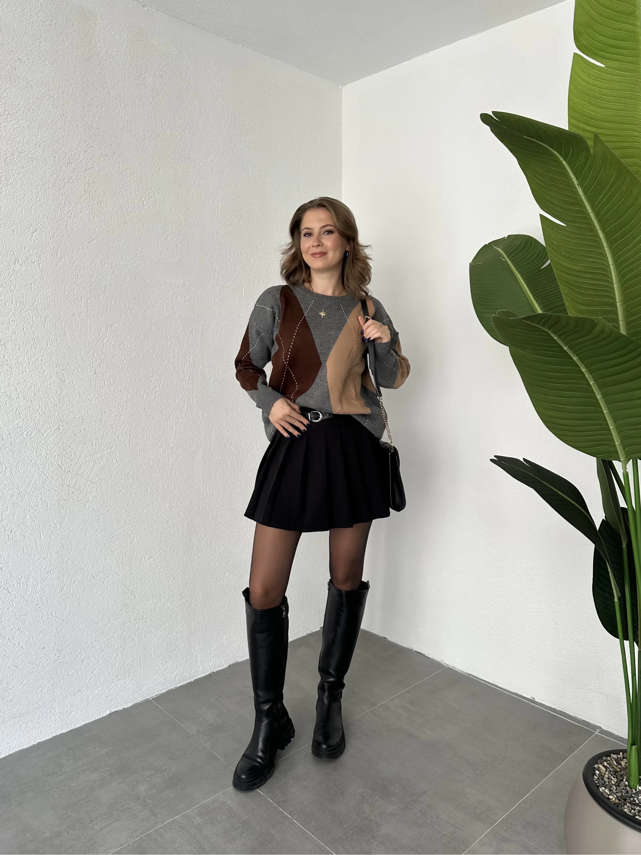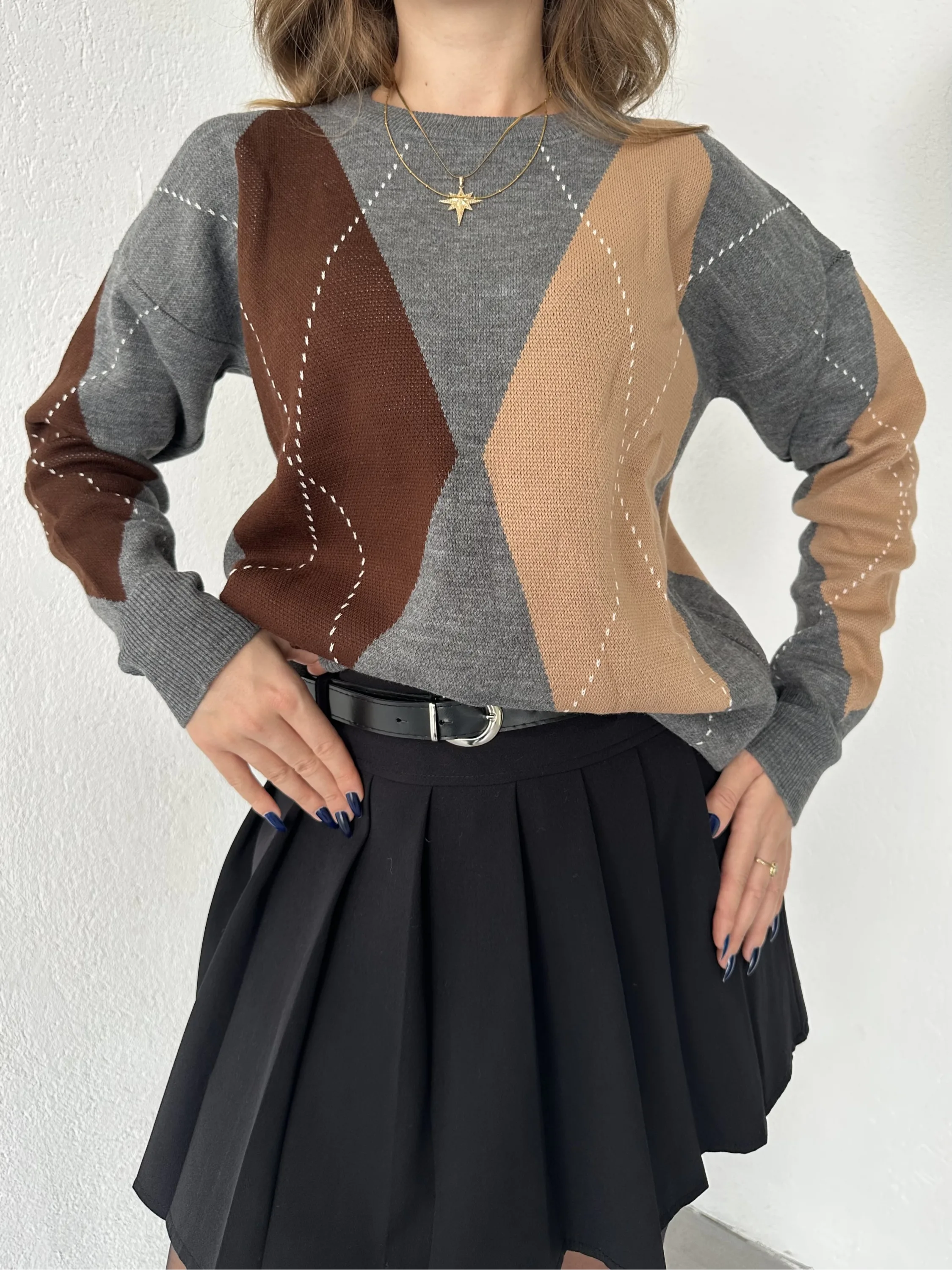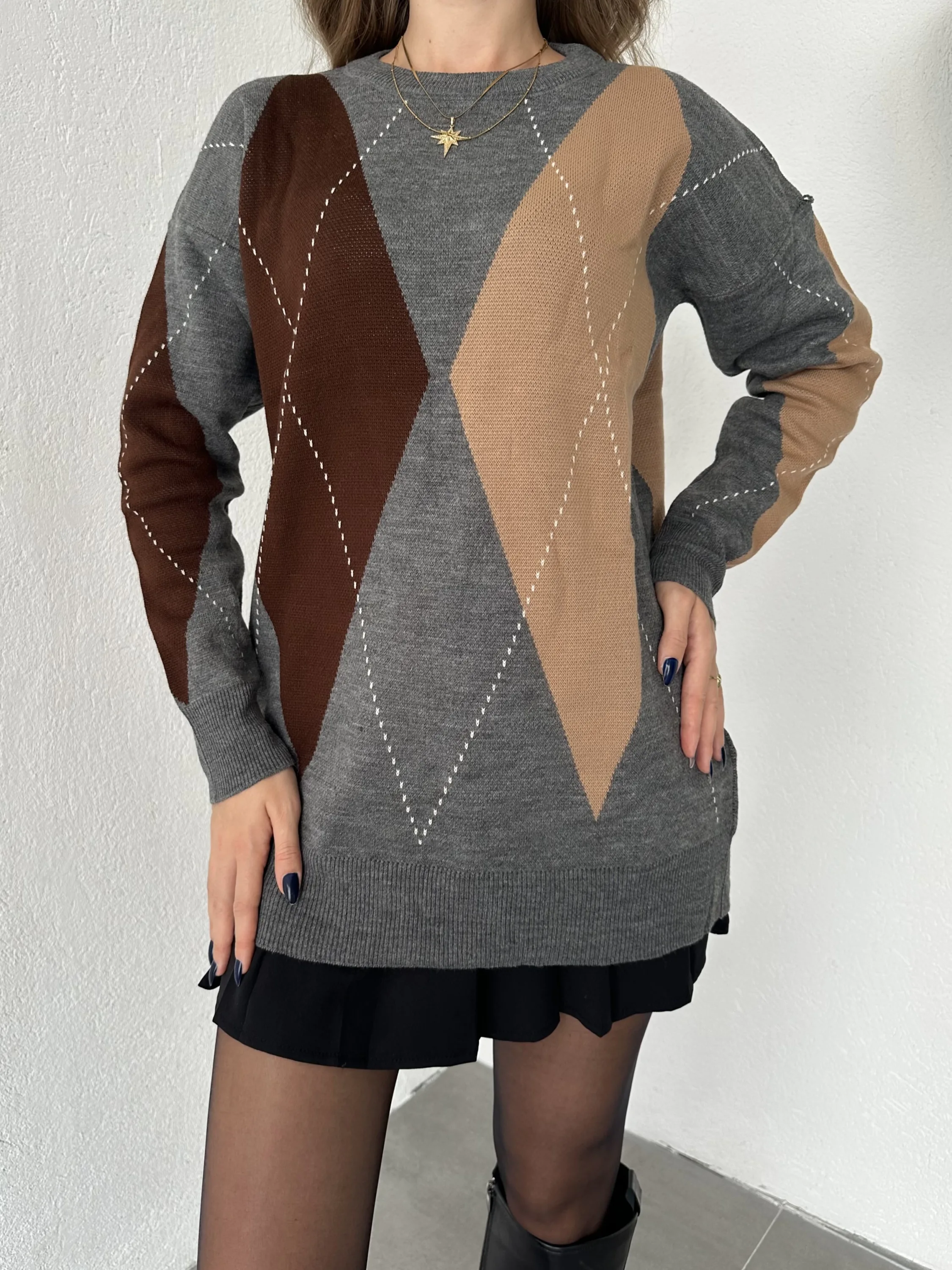 Kahveli Antrasit Bisiklet Yaka Baklava Desenli Oversize Triko Kazak