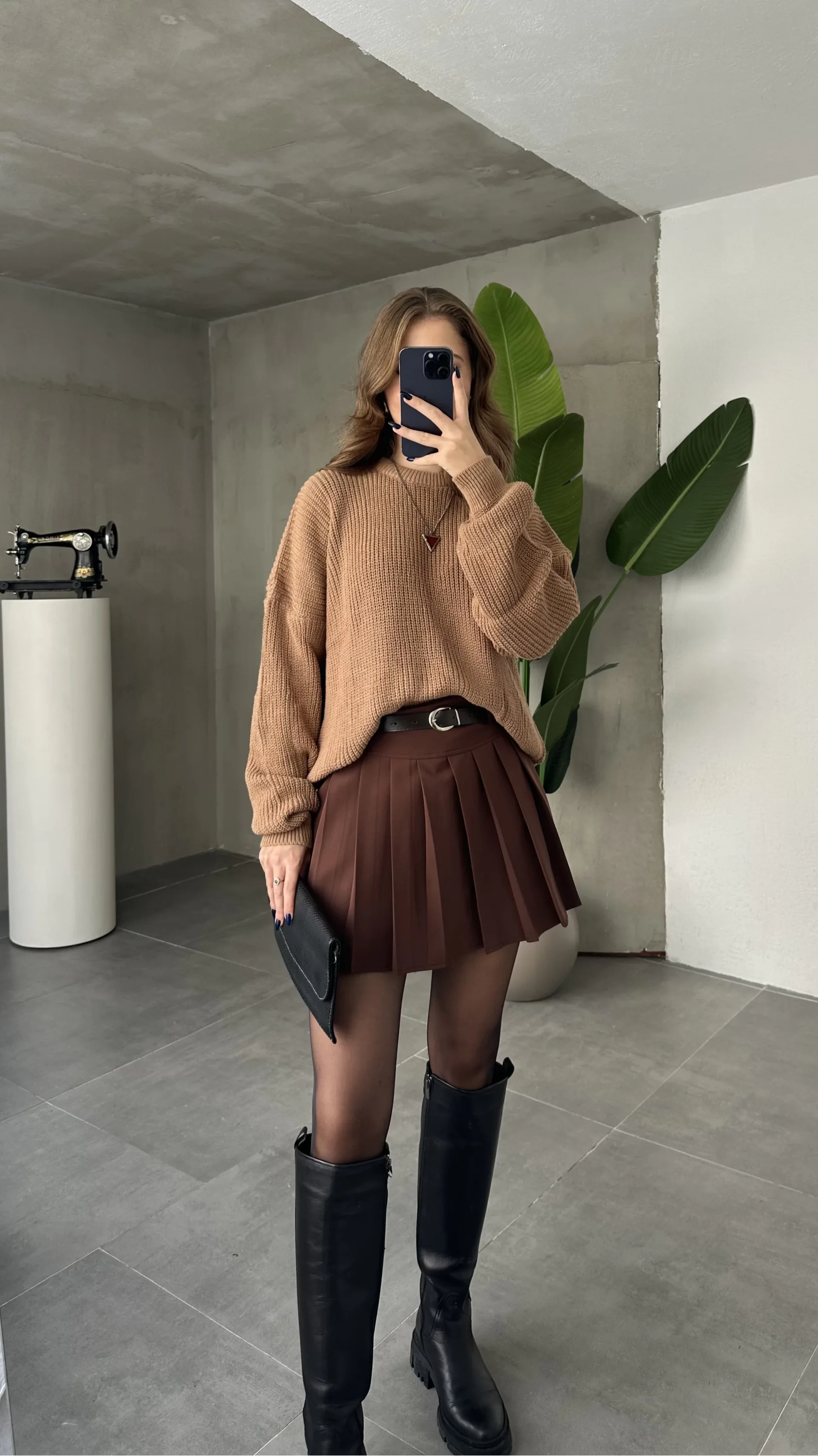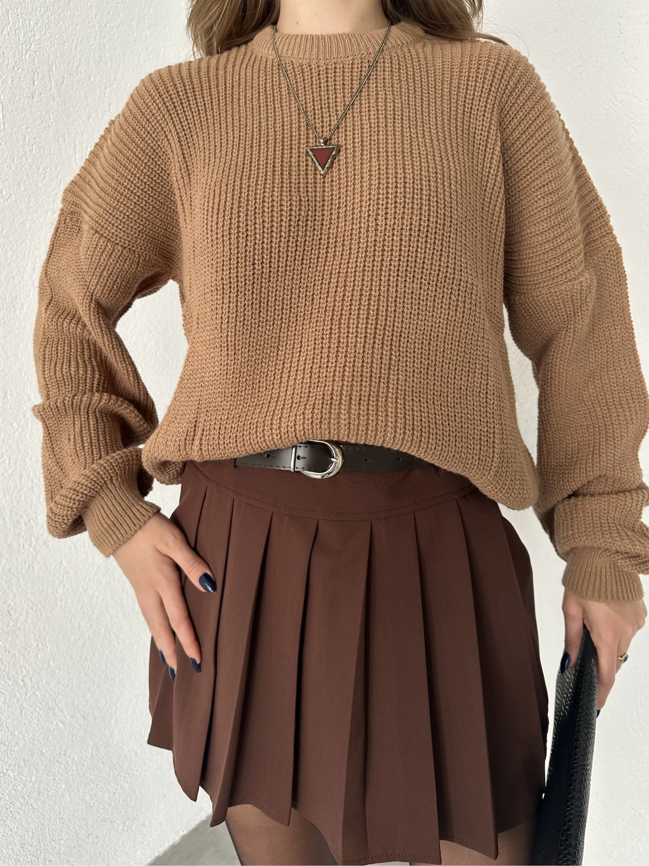 Kahverengi Bisiklet Yaka Oversize Kalın Örme Triko Kazak