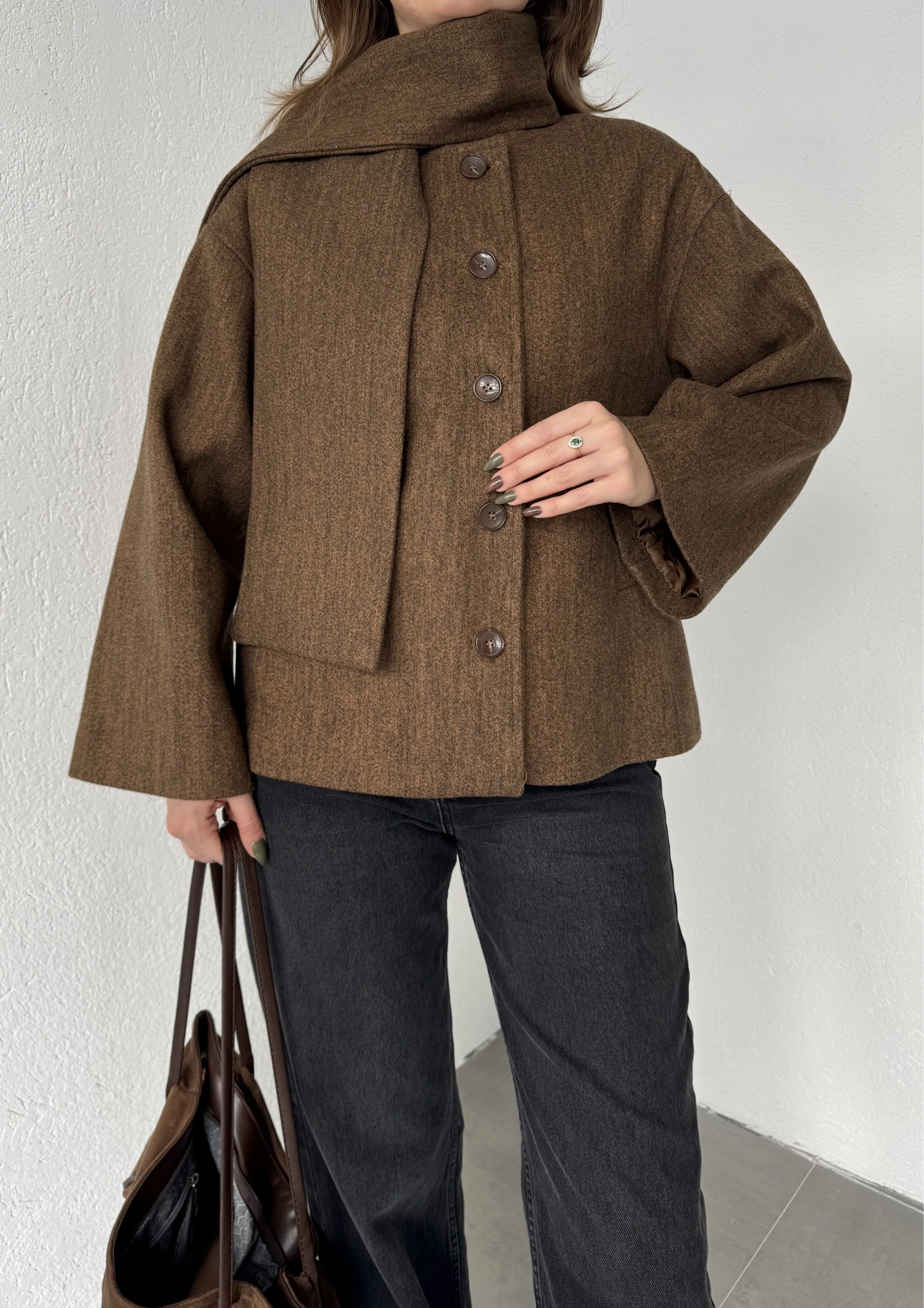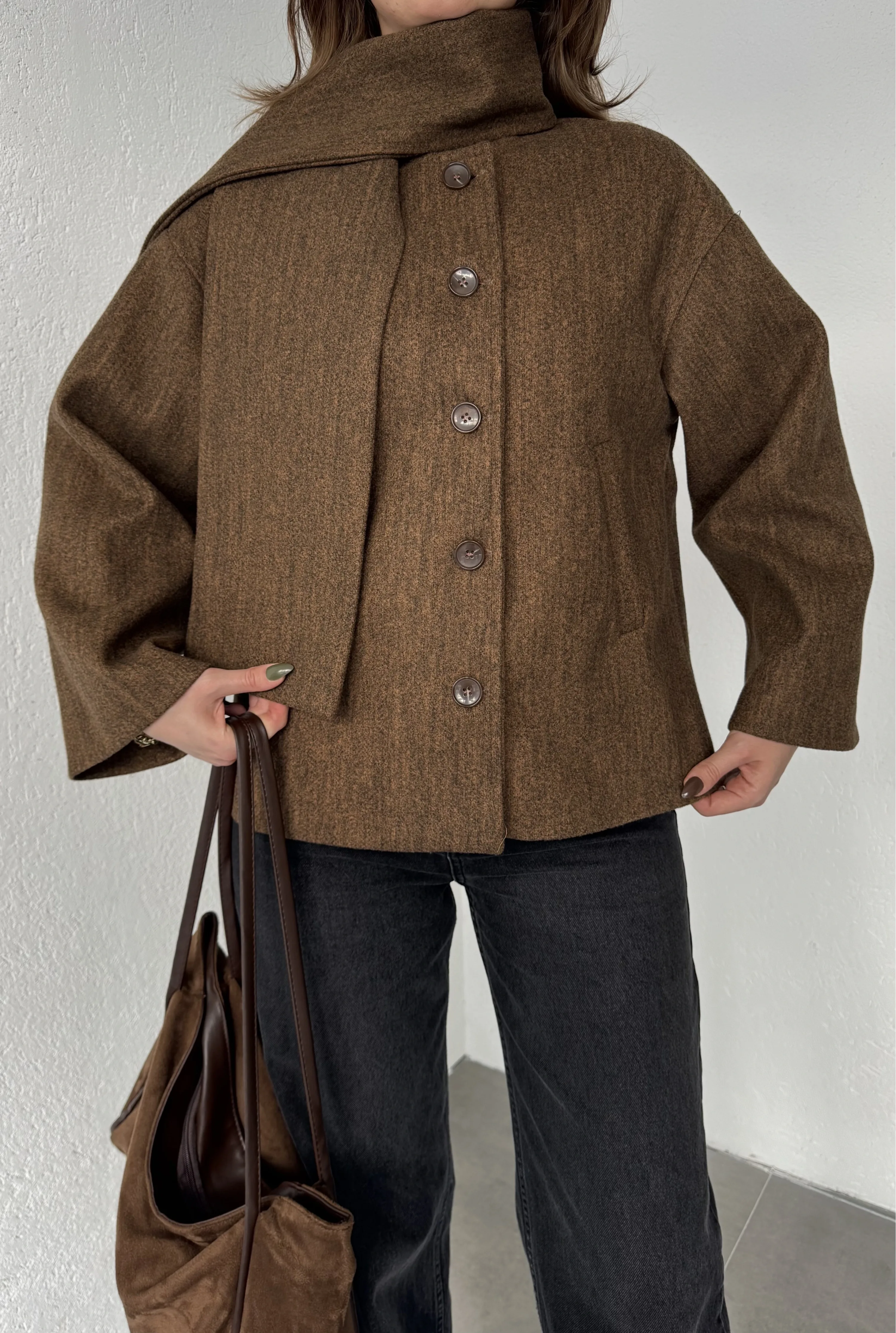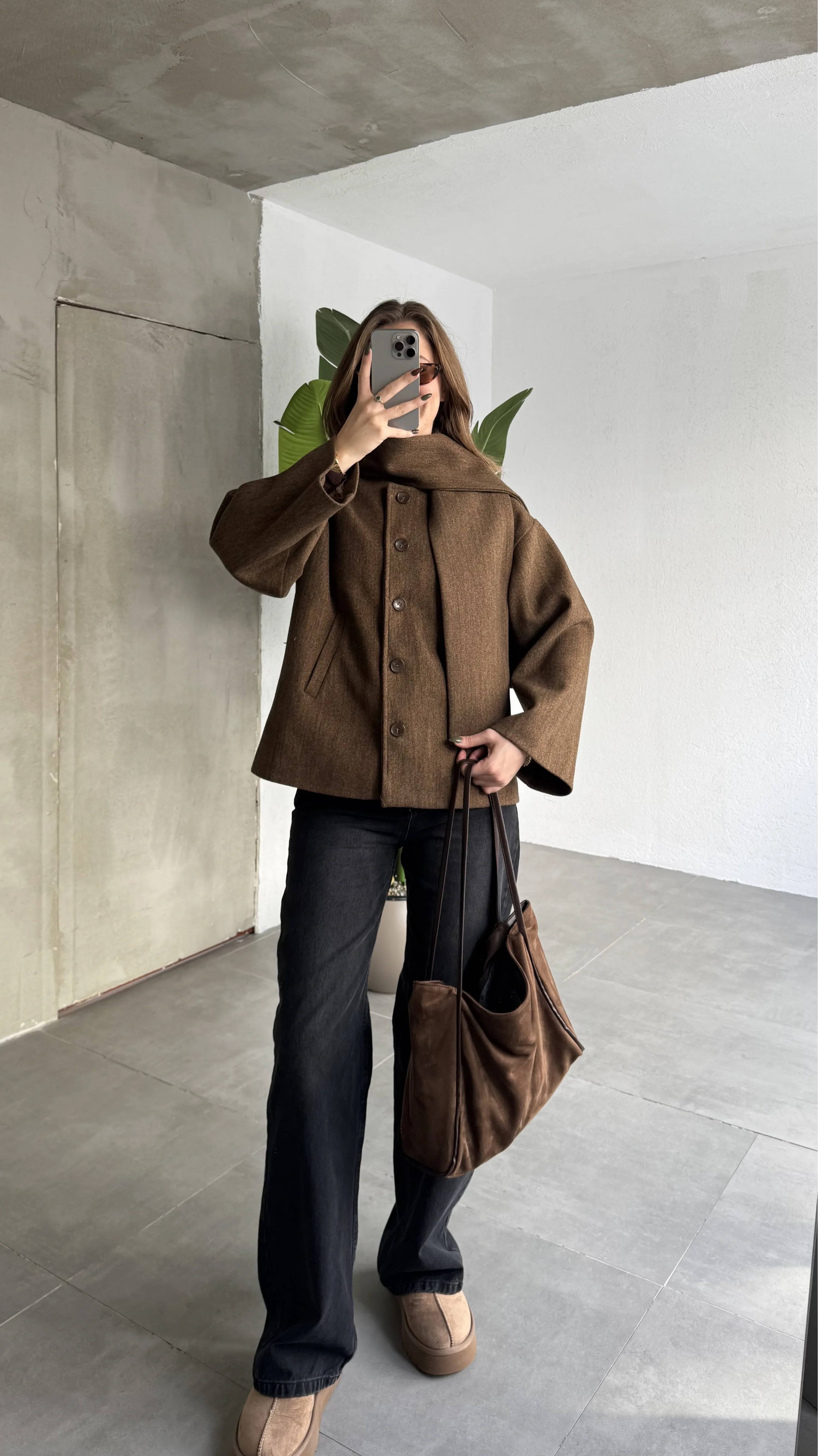 Kahverengi Bisiklet Yaka Şal Aksesurlı Düğmeli Kaşe Ceket Mont