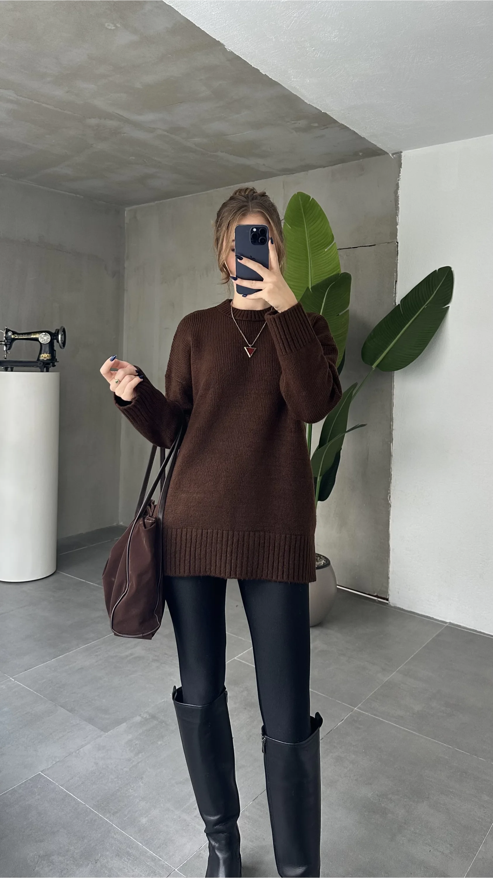 Kahverengi Bisiklet Yaka Tam Salaş Oversize Uzun Triko Kazak