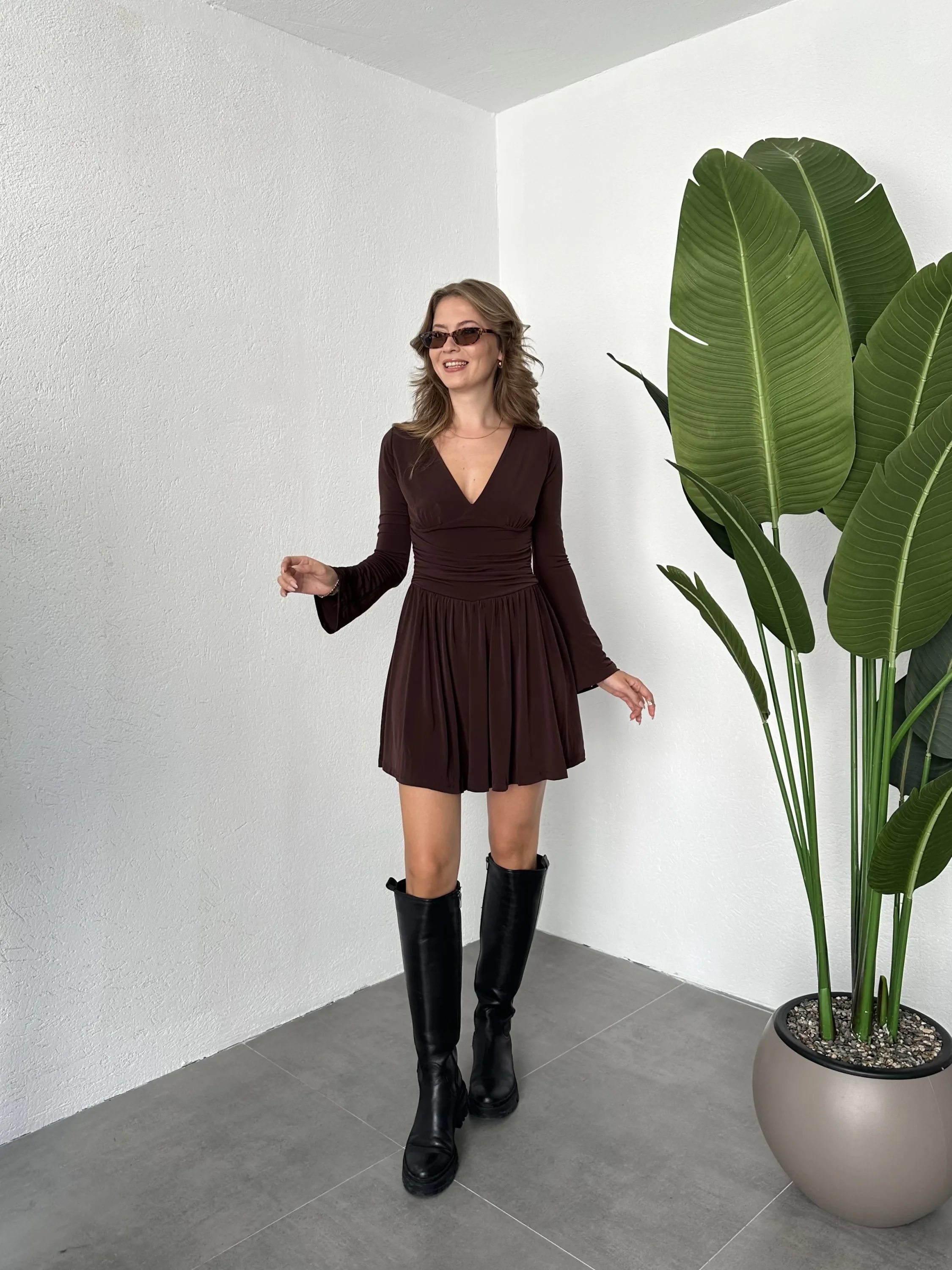 Kahverengi İçi Şortlu Uzun Kollu V Yaka Mini Candy Elbise