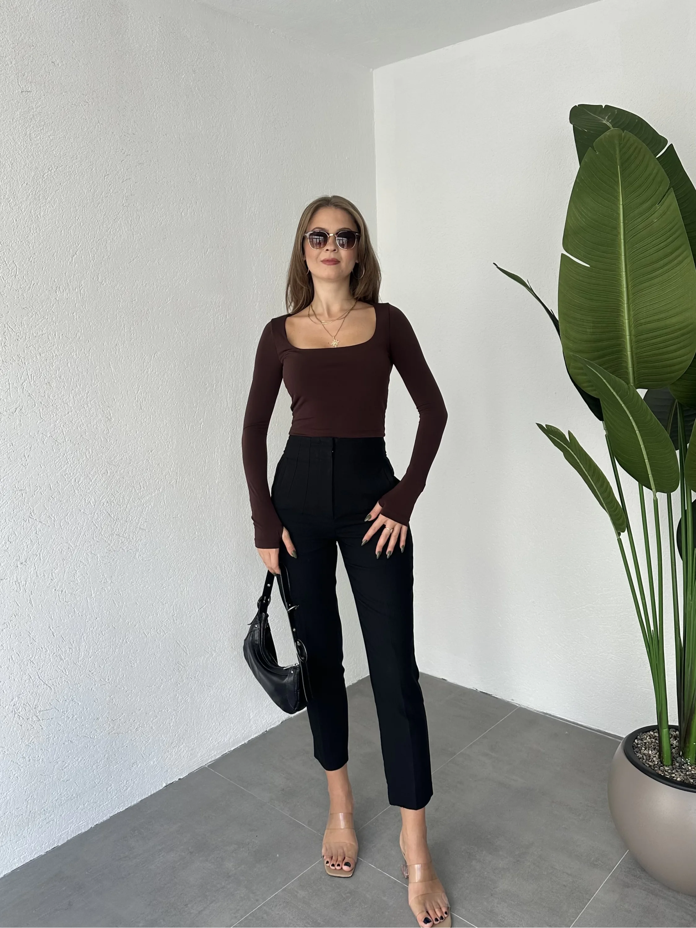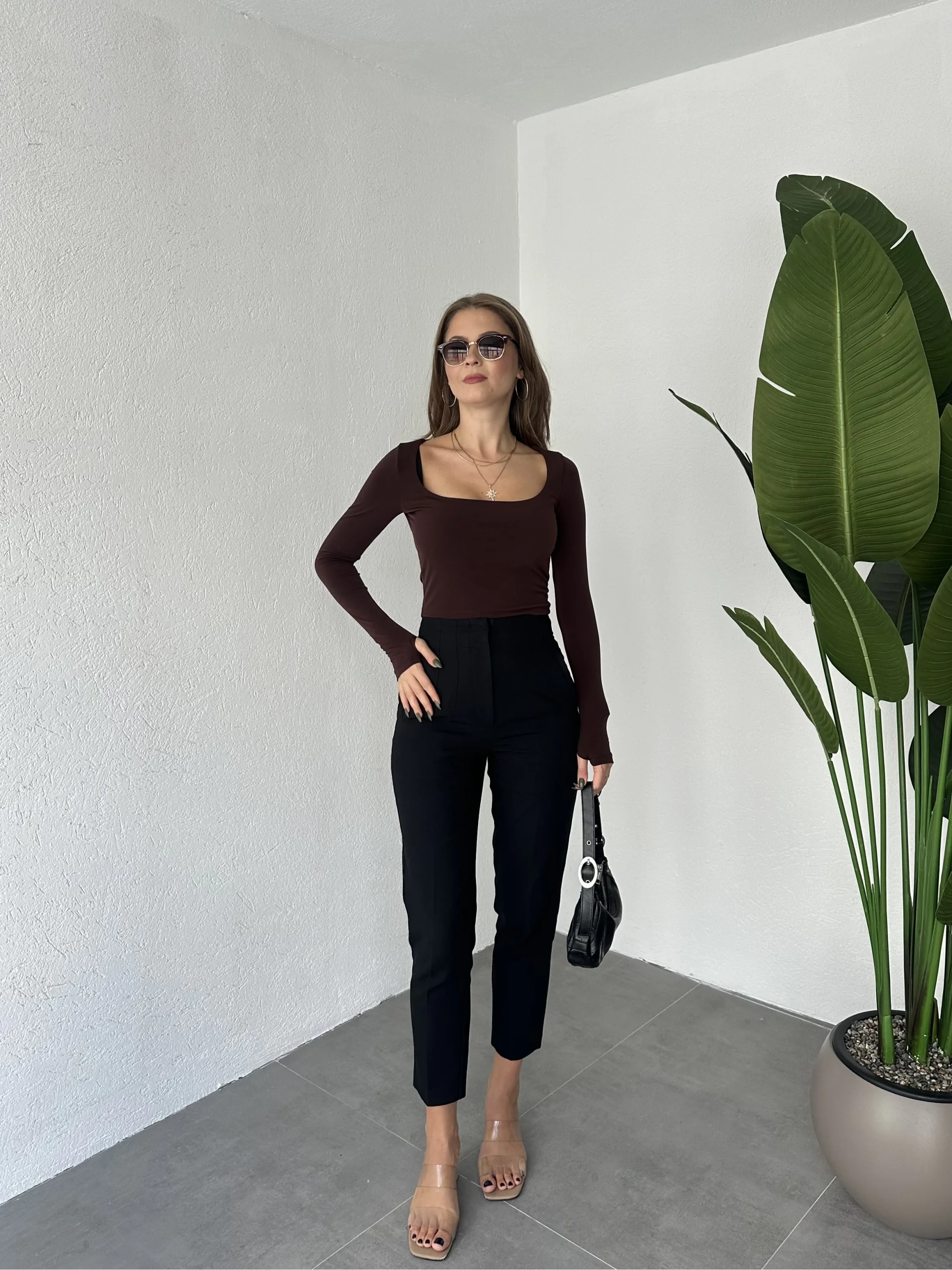 Kahverengi Kare Yaka Parmak Geçirmeli Uzun Kol Candy Body Bluz