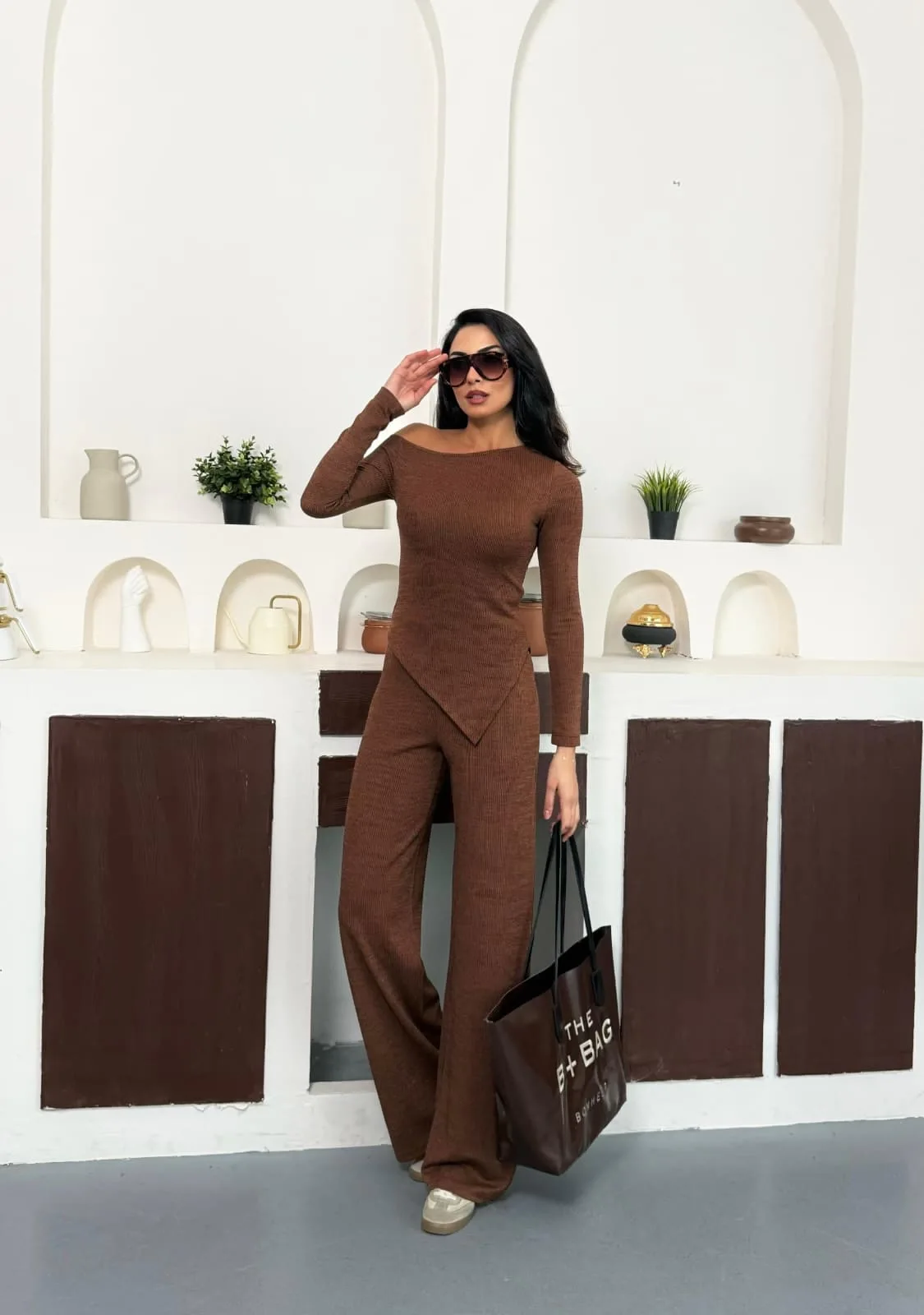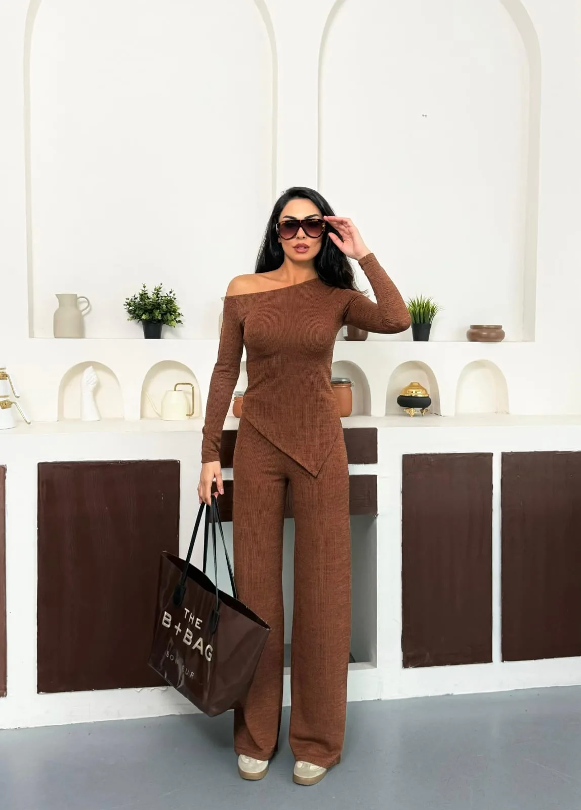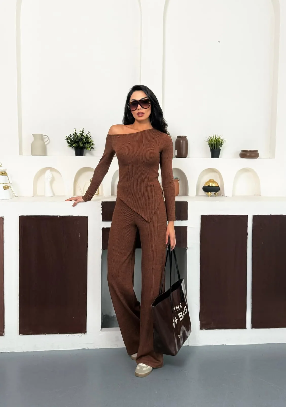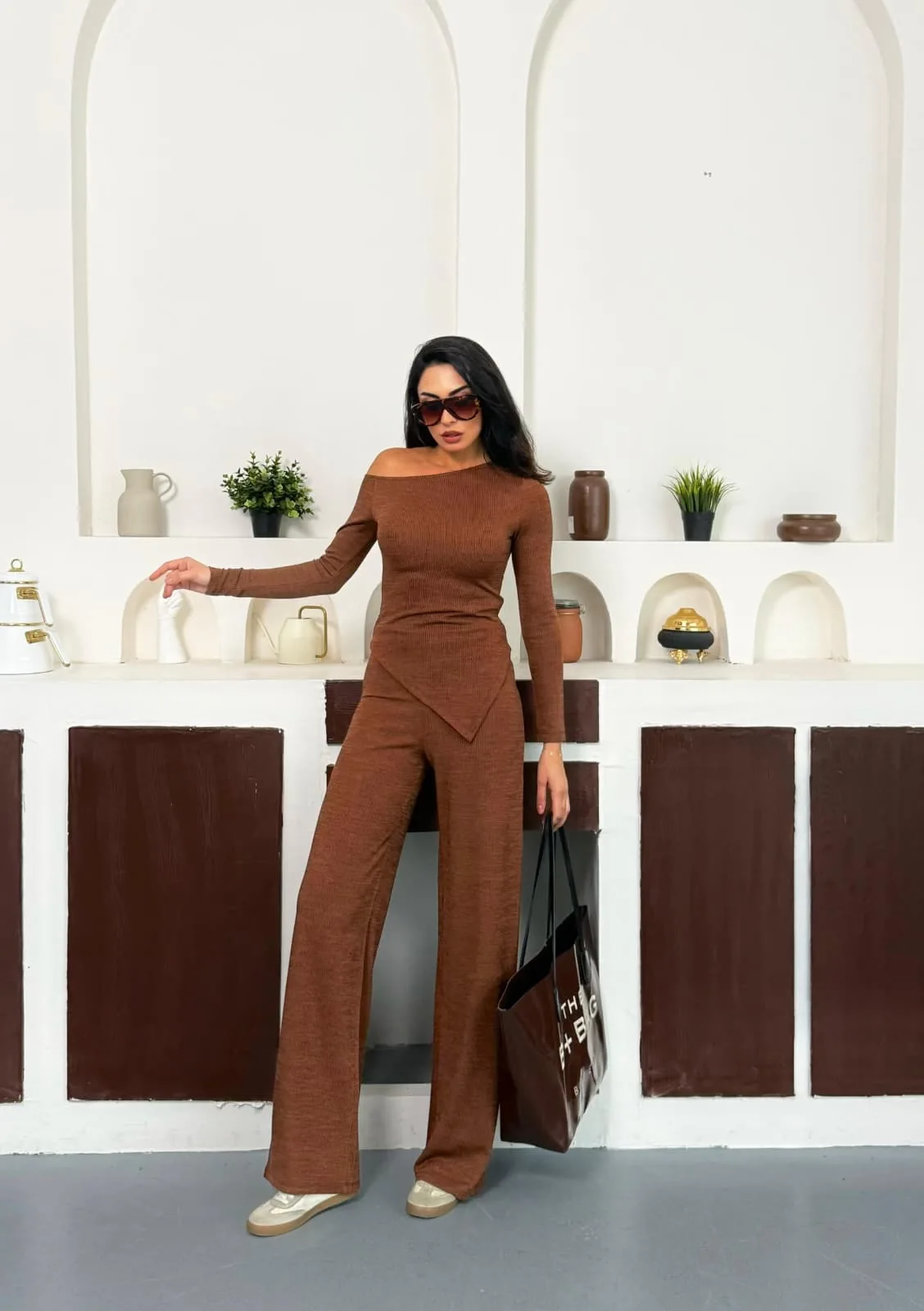 Kahverengi Kayık Yaka Asimetrit Kesim Bluz İspanyol Paça Pantolon İkili Takım