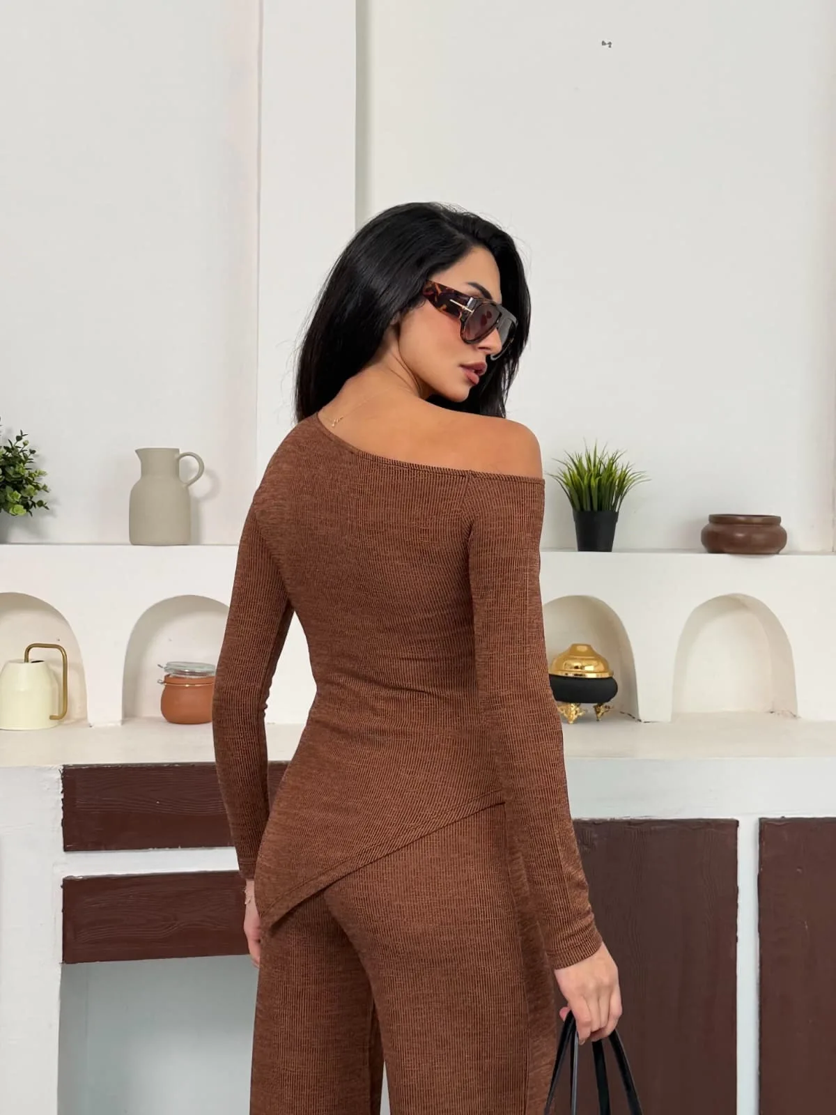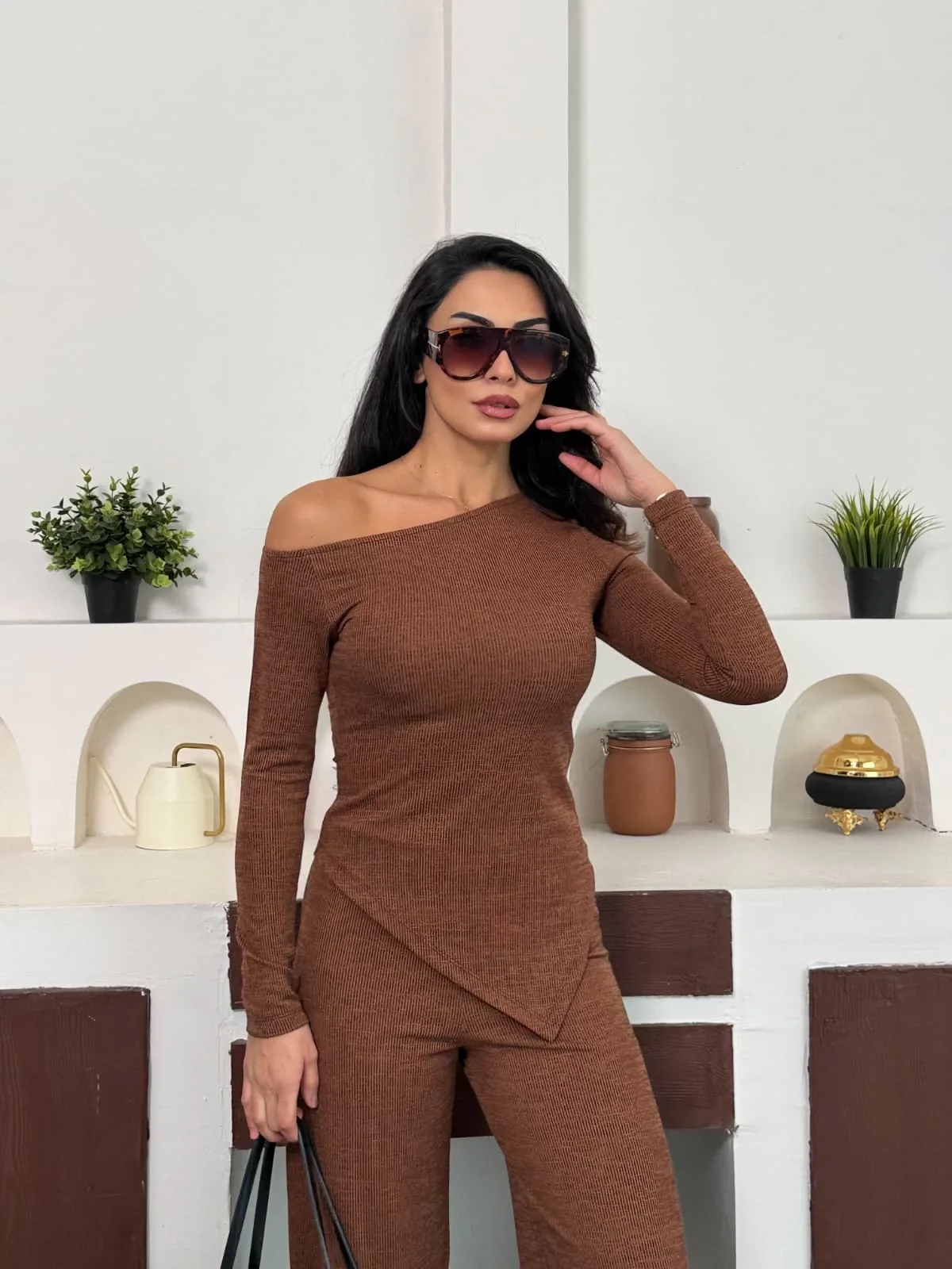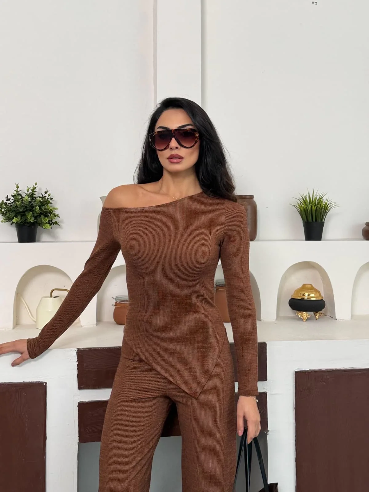 Kahverengi Kayık Yaka Asimetrit Kesim Bluz İspanyol Paça Pantolon İkili Takım