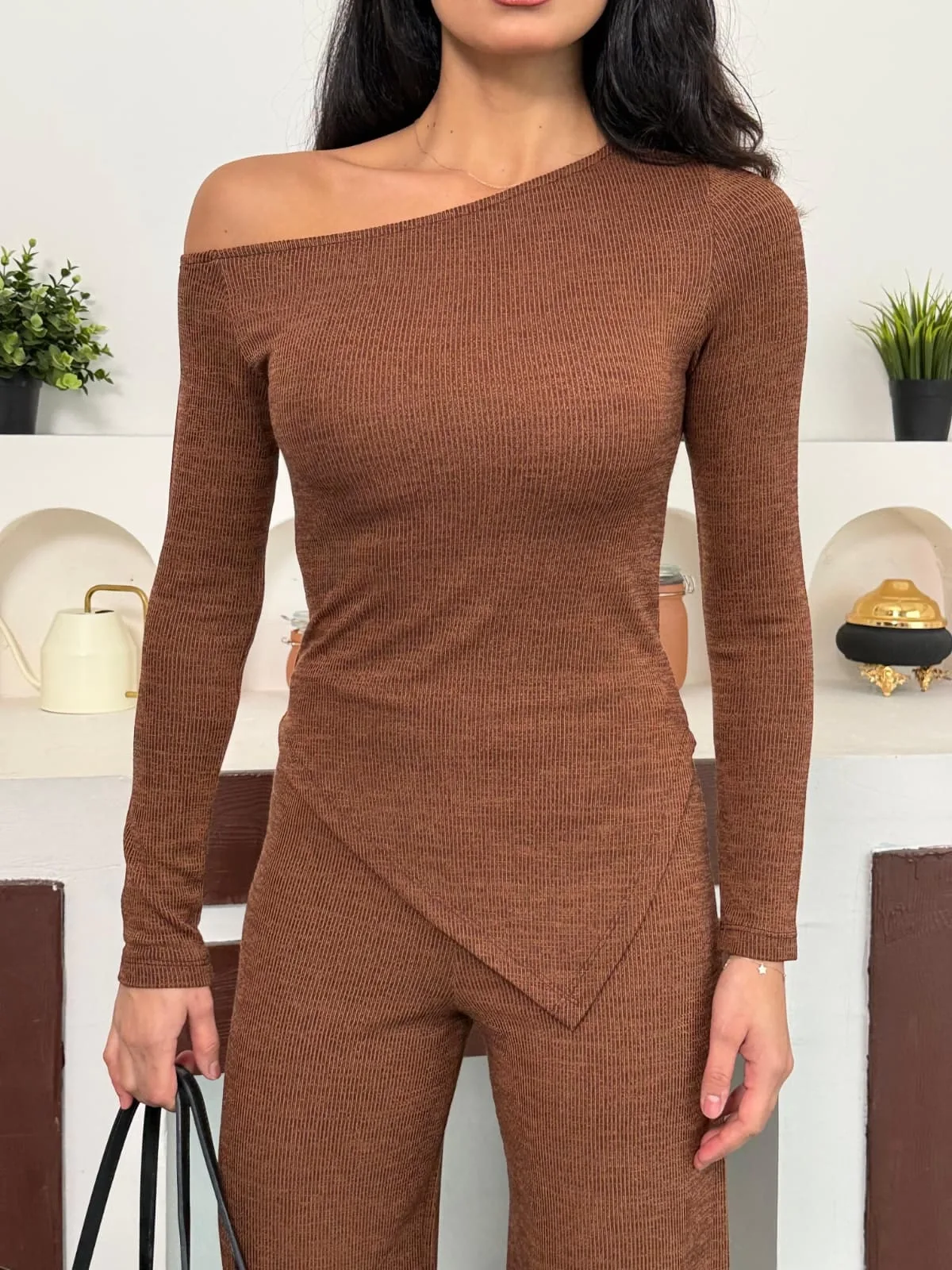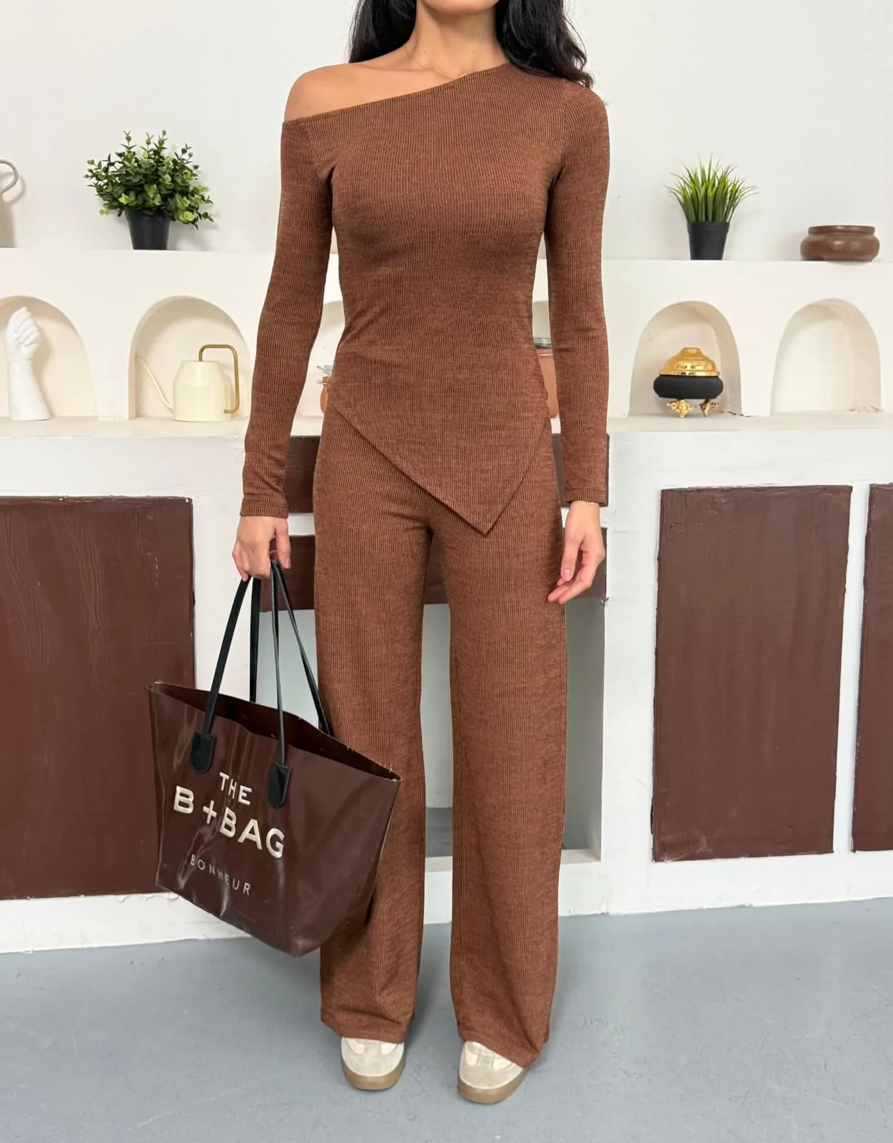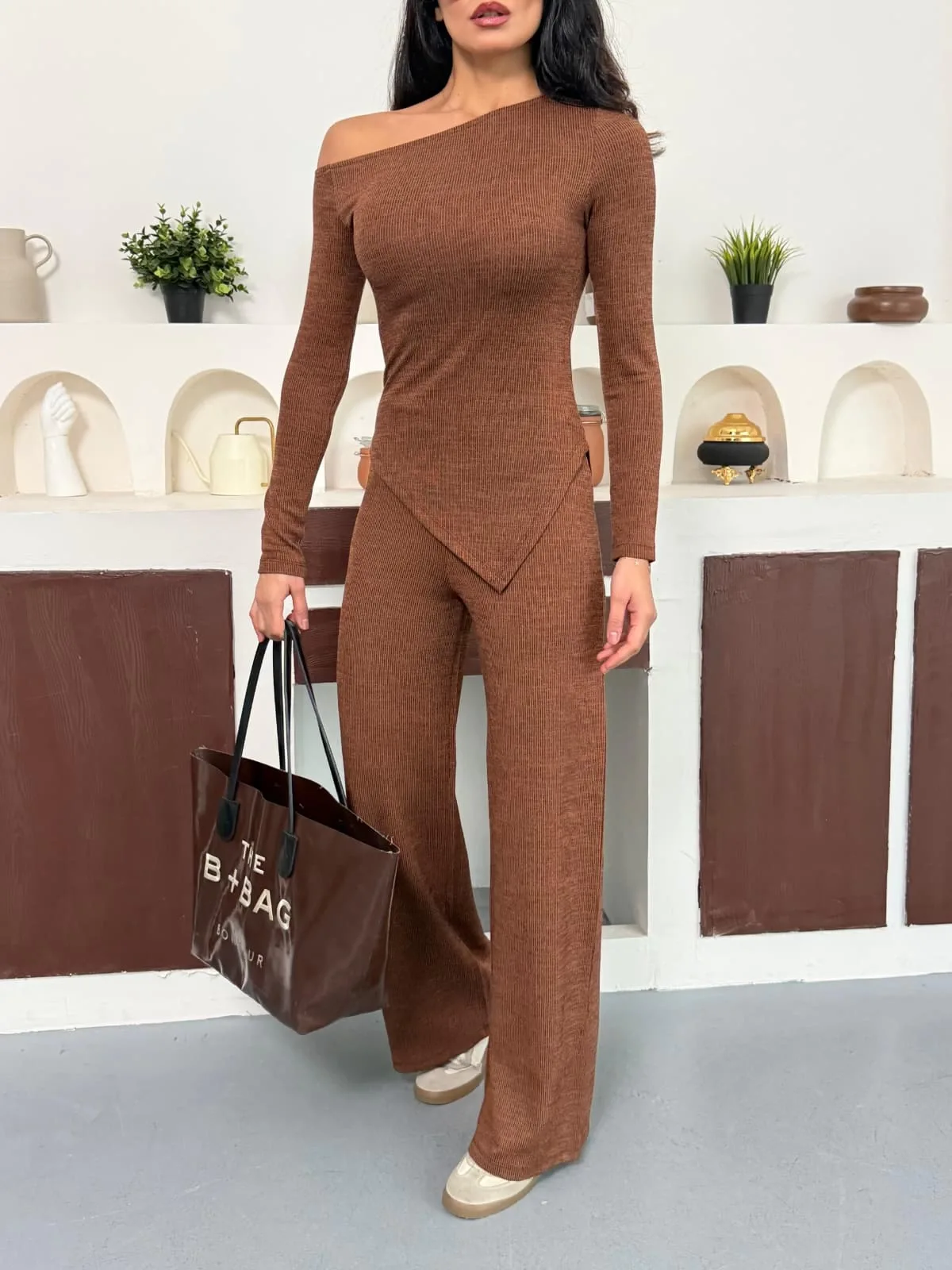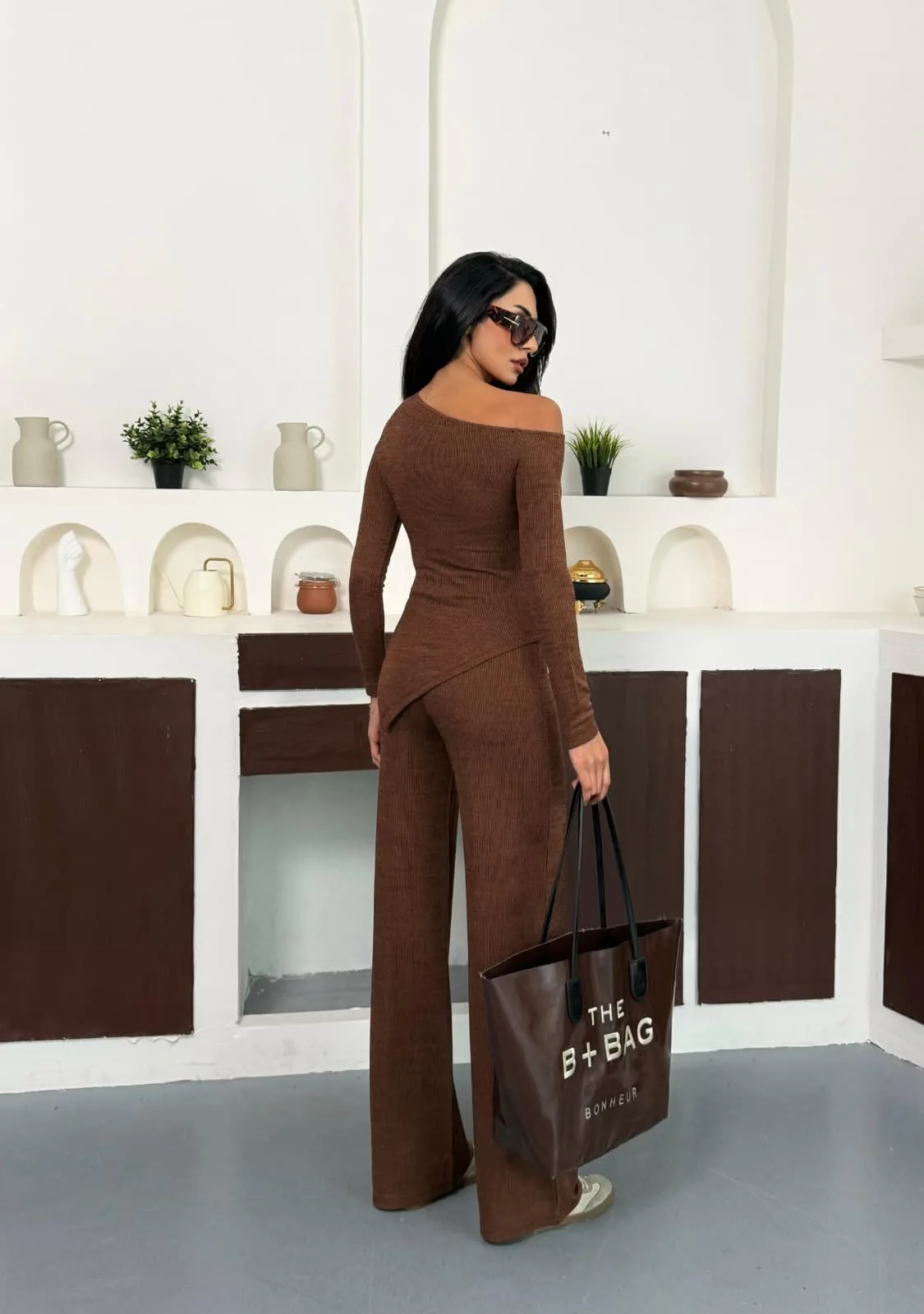 Kahverengi Kayık Yaka Asimetrit Kesim Bluz İspanyol Paça Pantolon İkili Takım