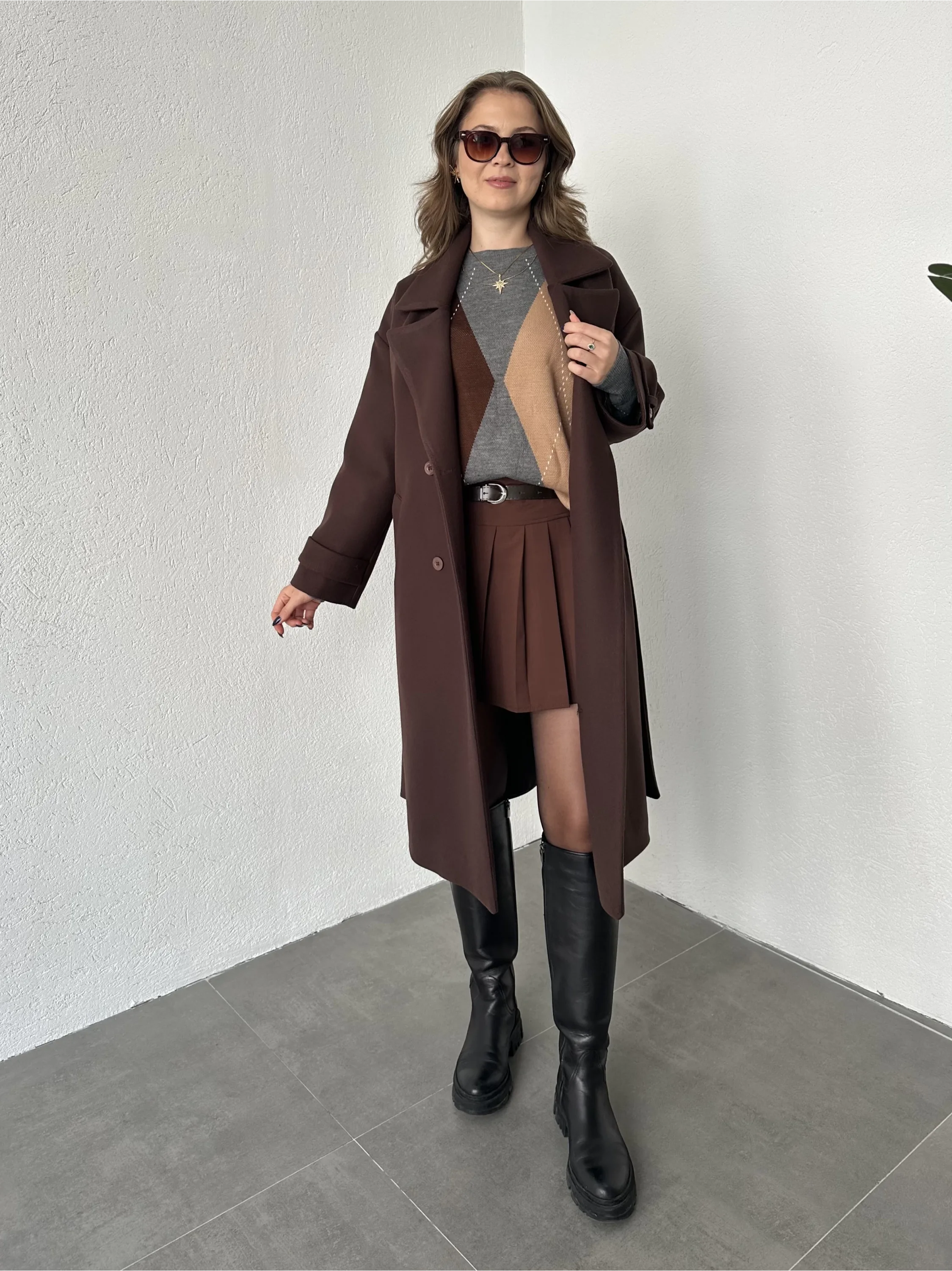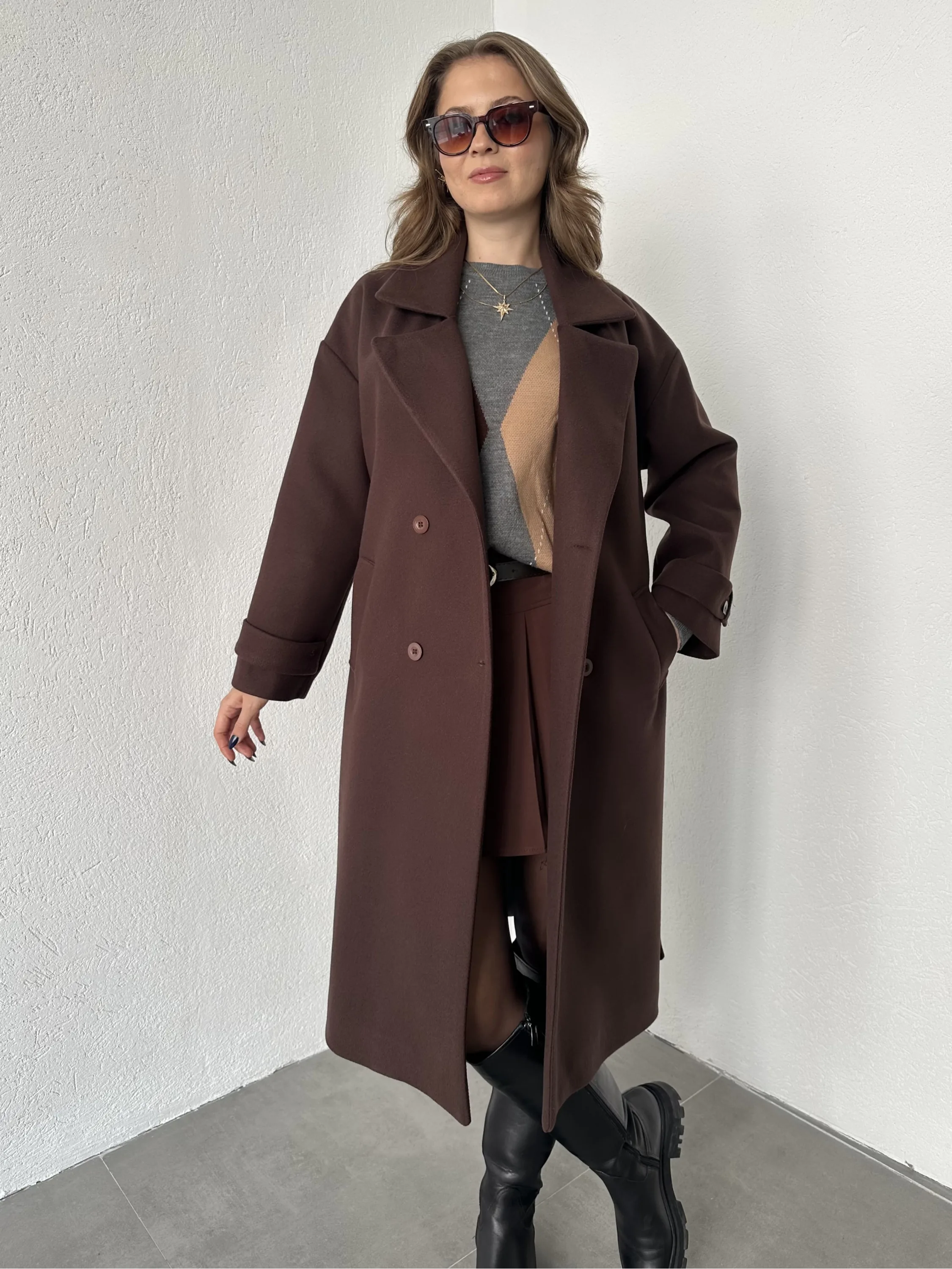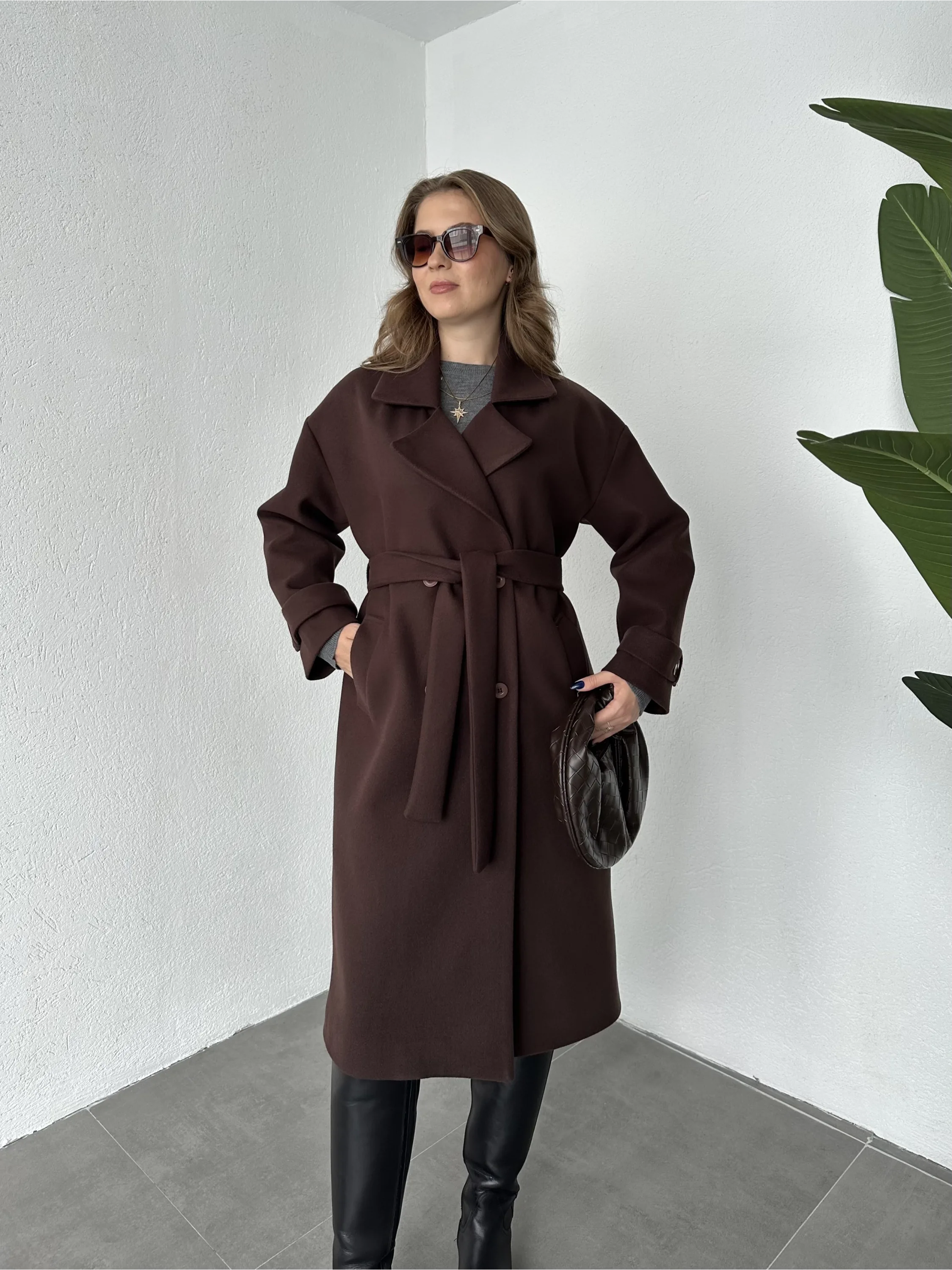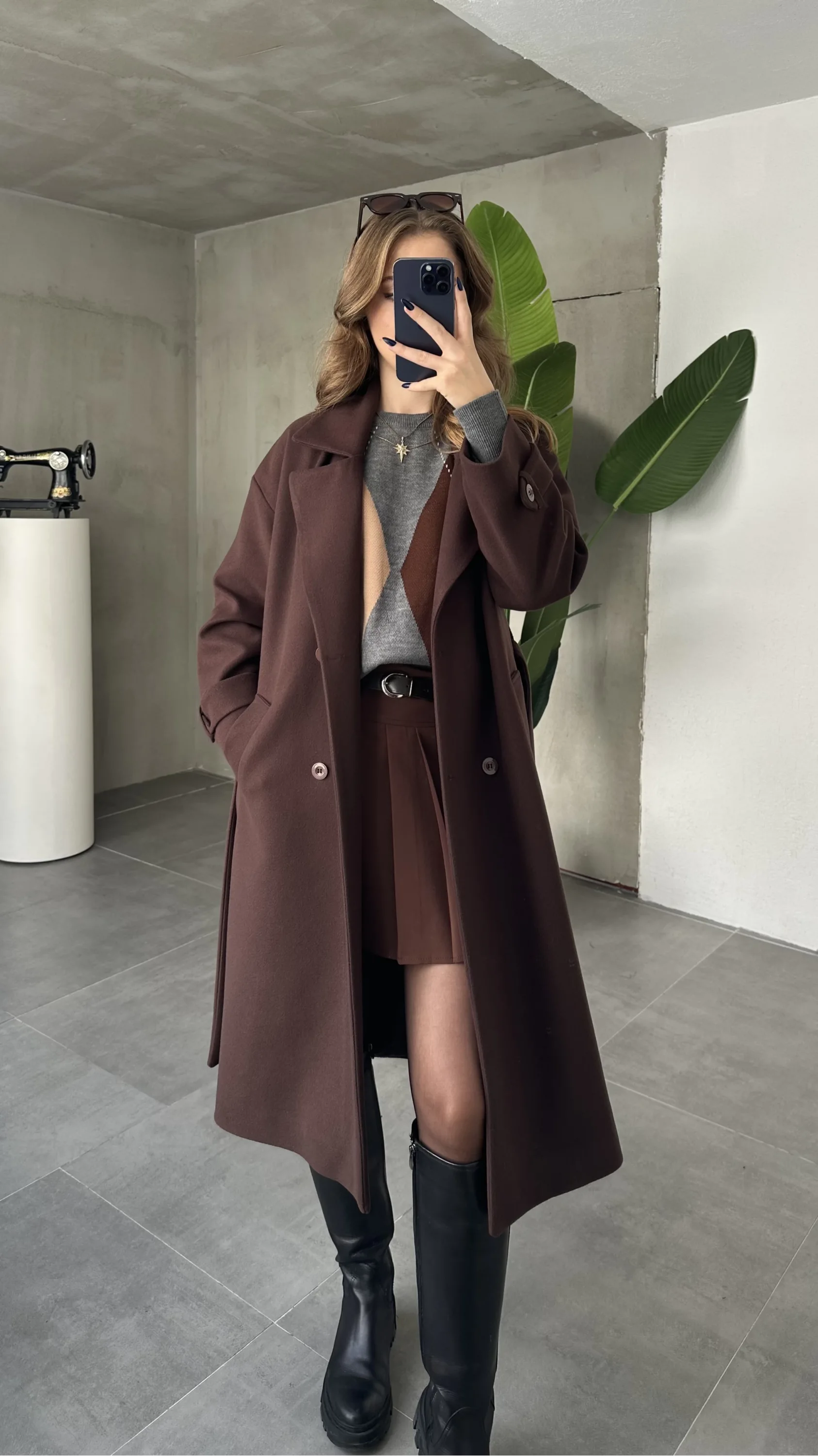Kahverengi Kruvaze Oversize Premium Kalite Kuşaklı Tam Boy Uzun Kaşe Mont