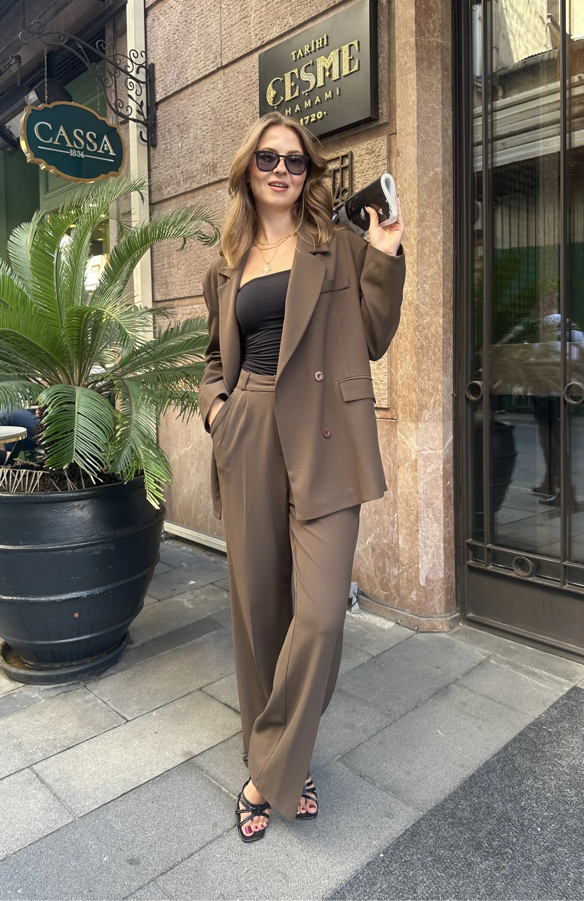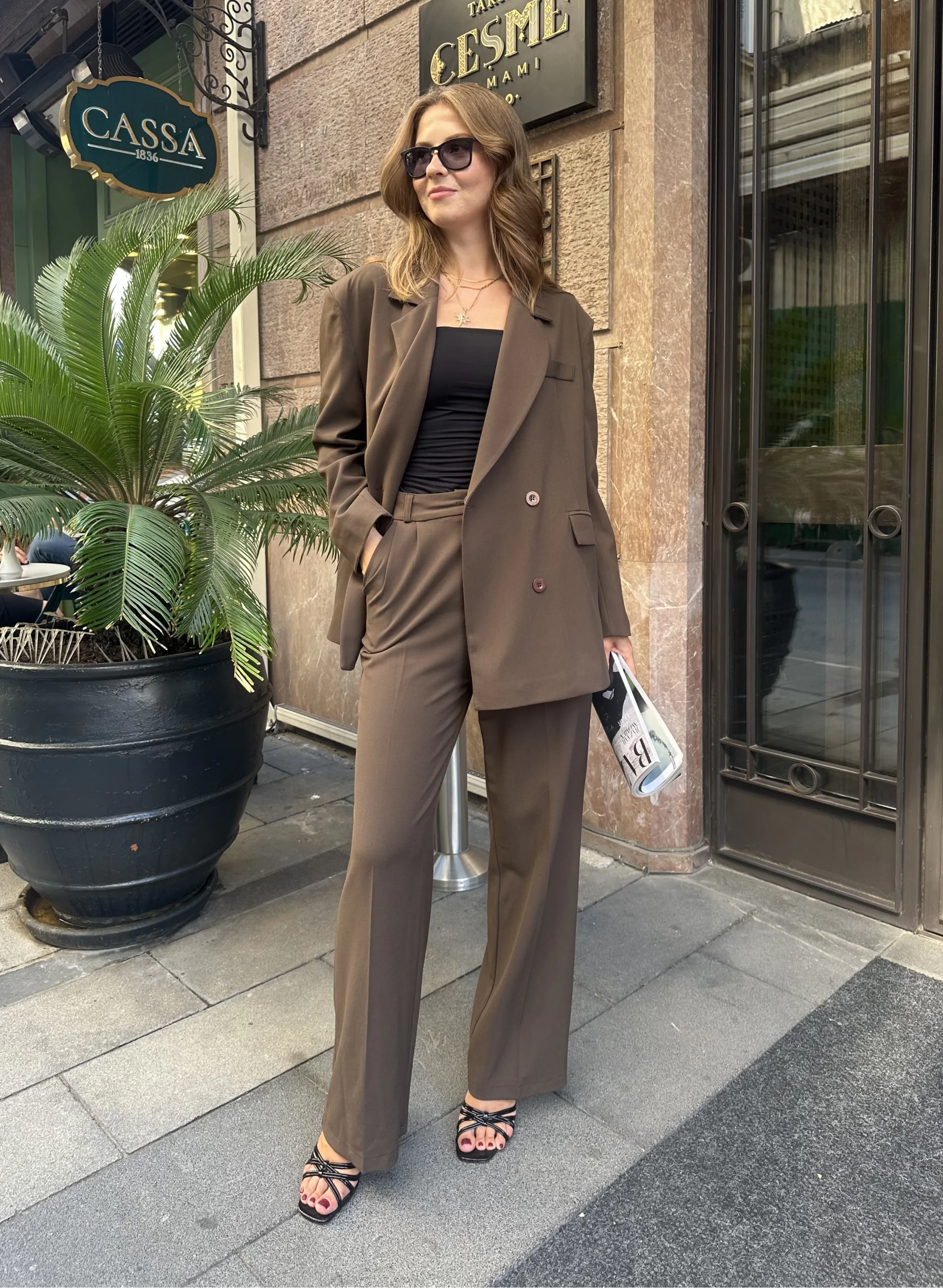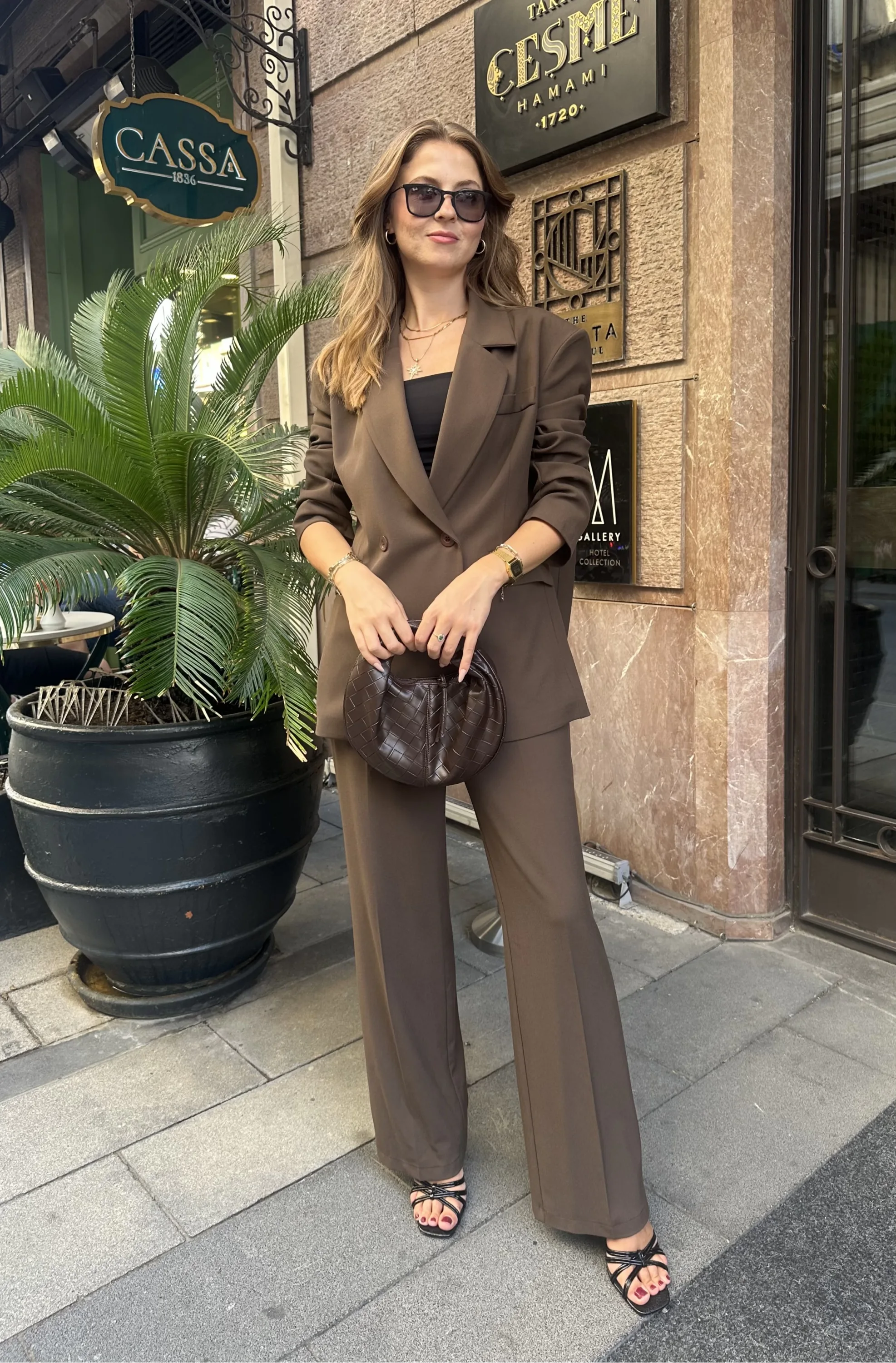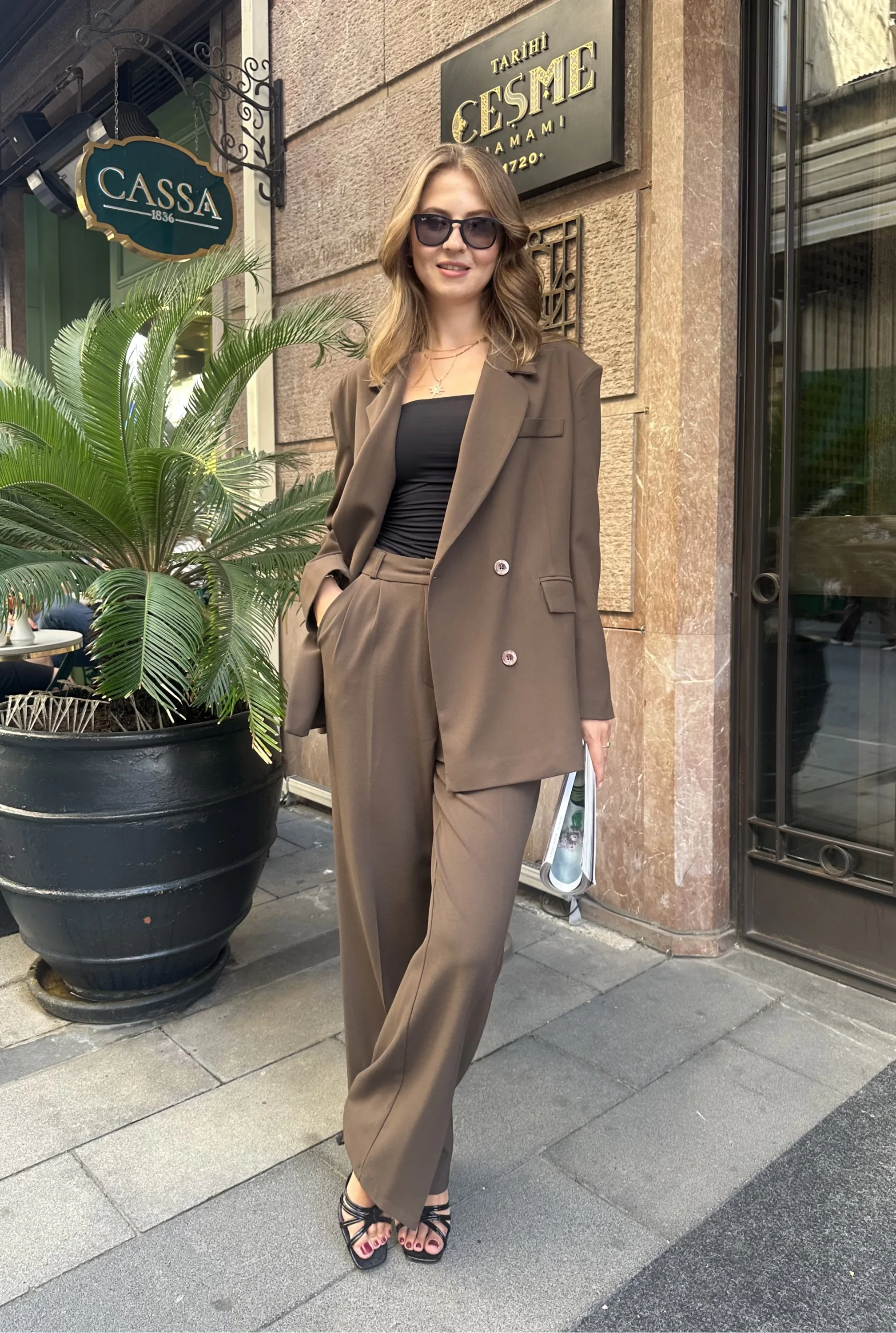 Kahverengi Oversize Kruvaz Ceket Tam Kalıp Palazzo Pantolon Viskon Premium İkili Takım