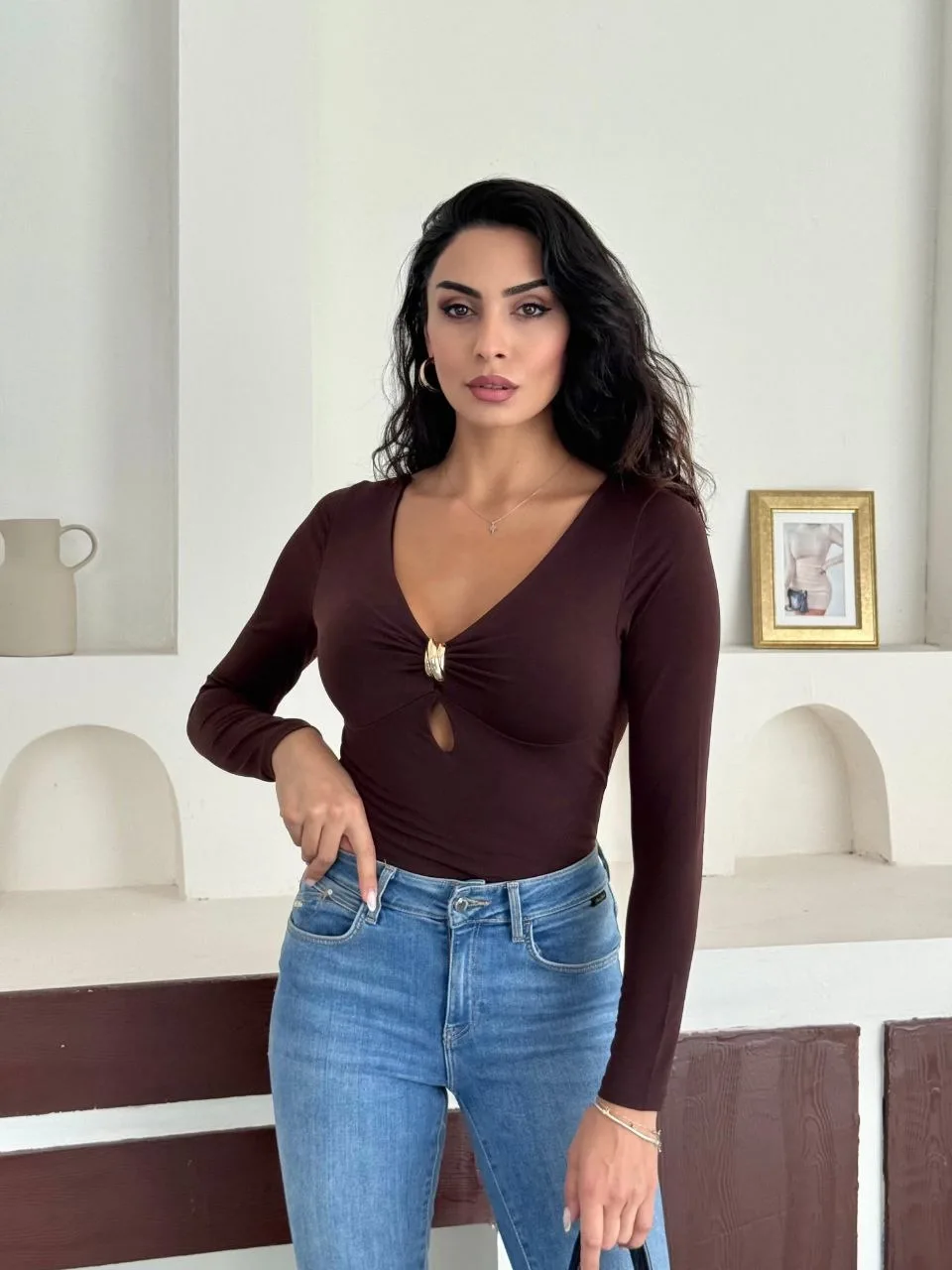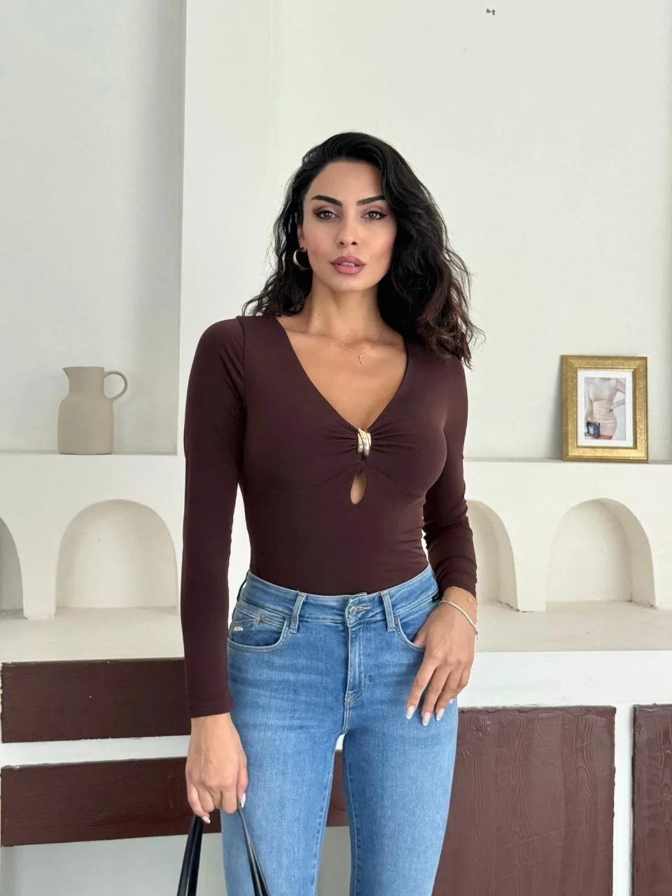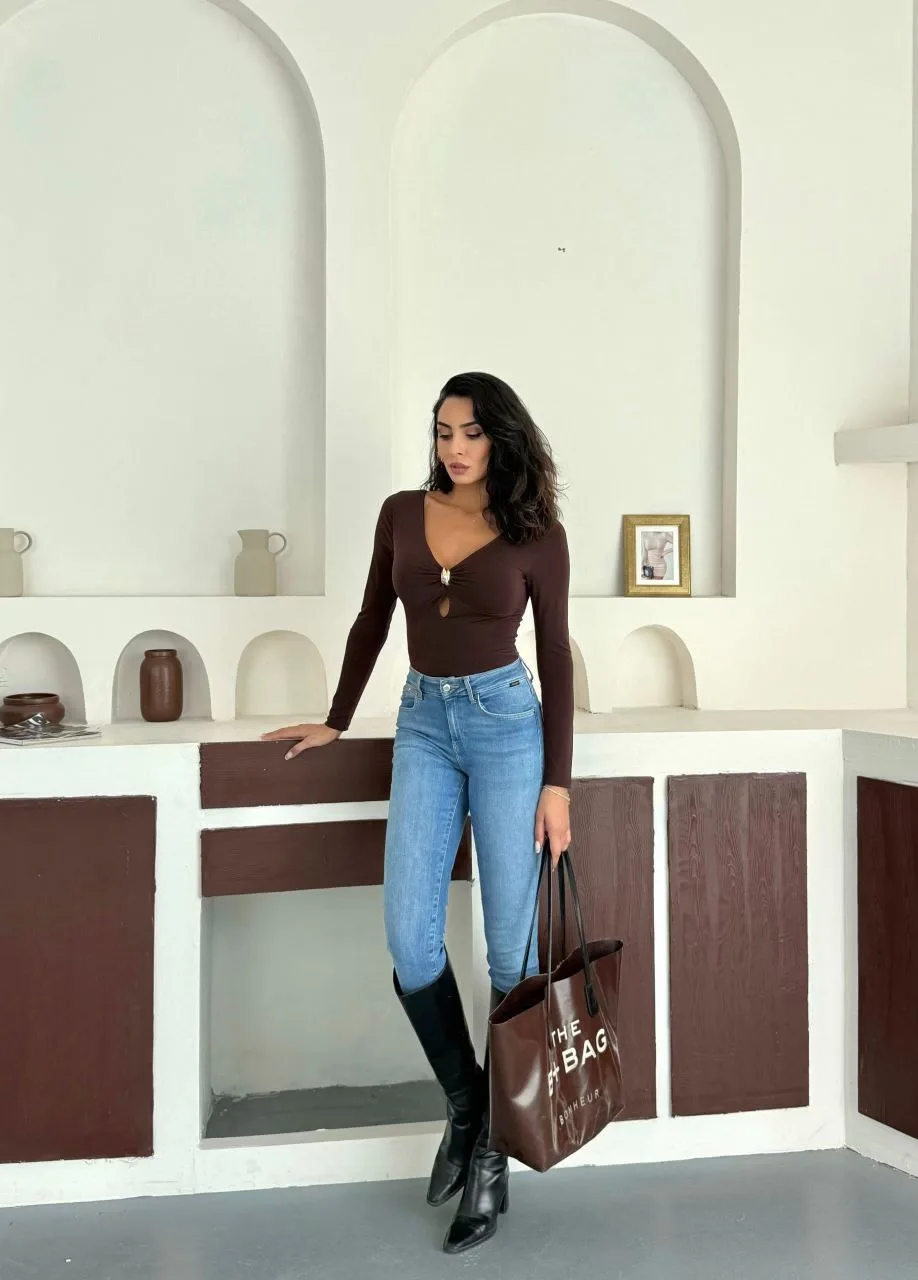 Kahverengi Yaka Aksesuarlı Sandy Bluz