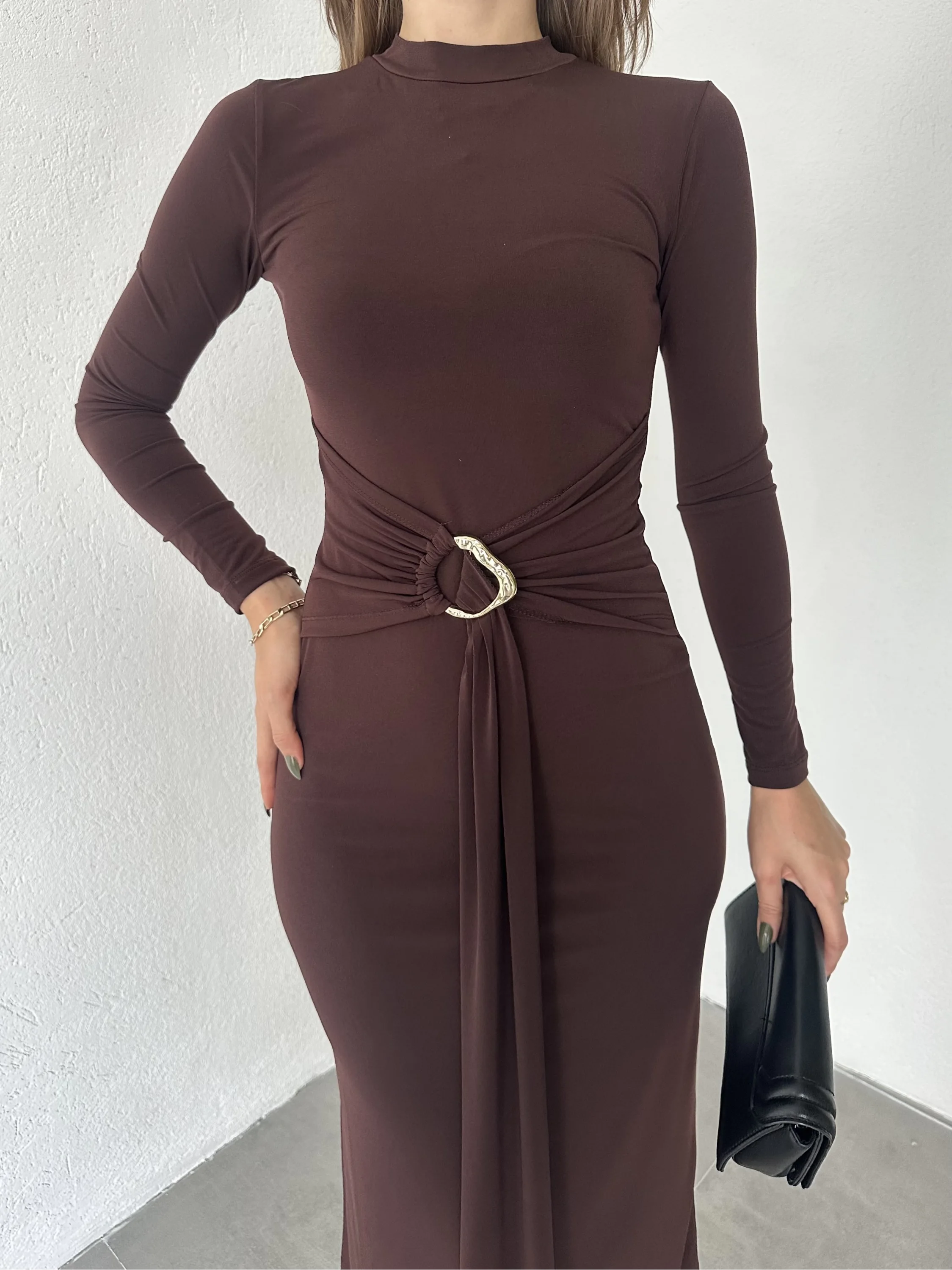 Kahverengi Zr Model Bisiklet Yaka Aksesuarlı Kuşaklı Midi Boy Candy Elbise