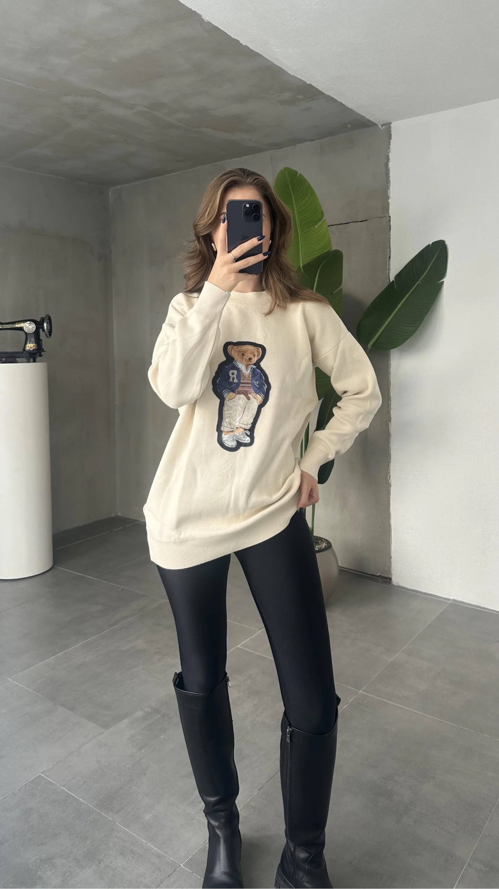 Krem Bisiklet Yaka Ayıcık İşlemeli Oversize Uzun Triko Kazak