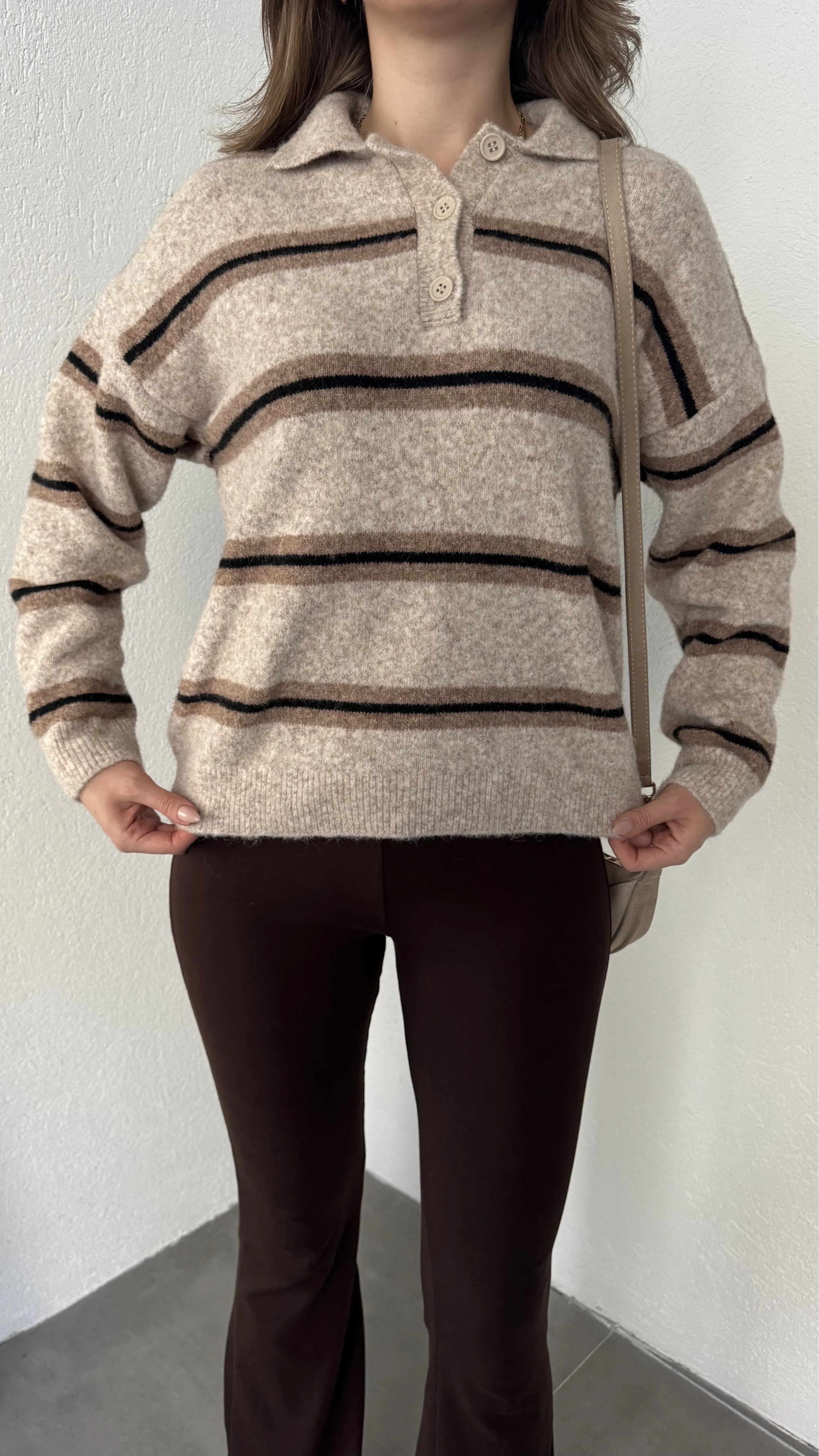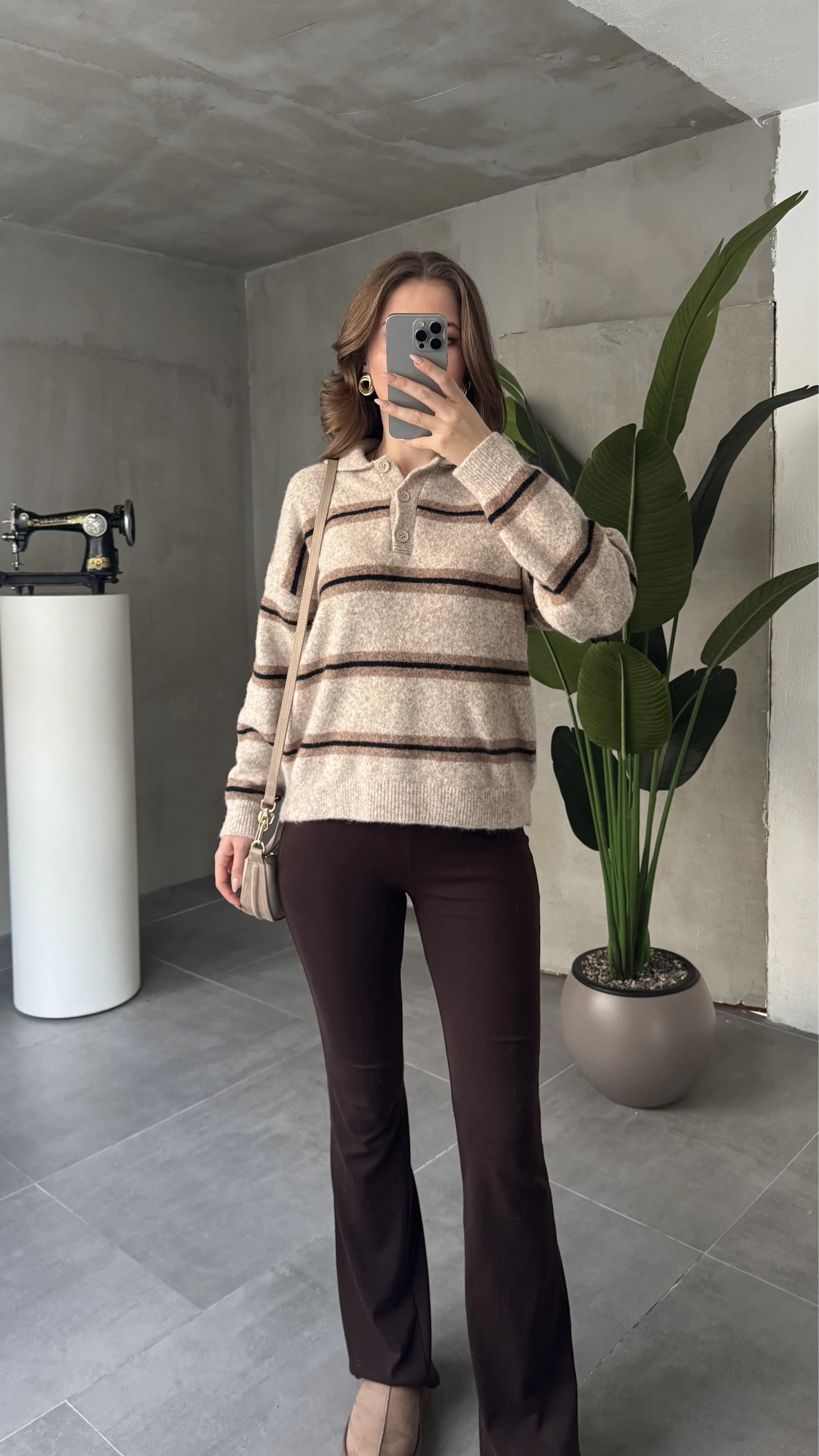 Krem Çizgili Polo Yaka Çizgili Oversize Trend Kazak