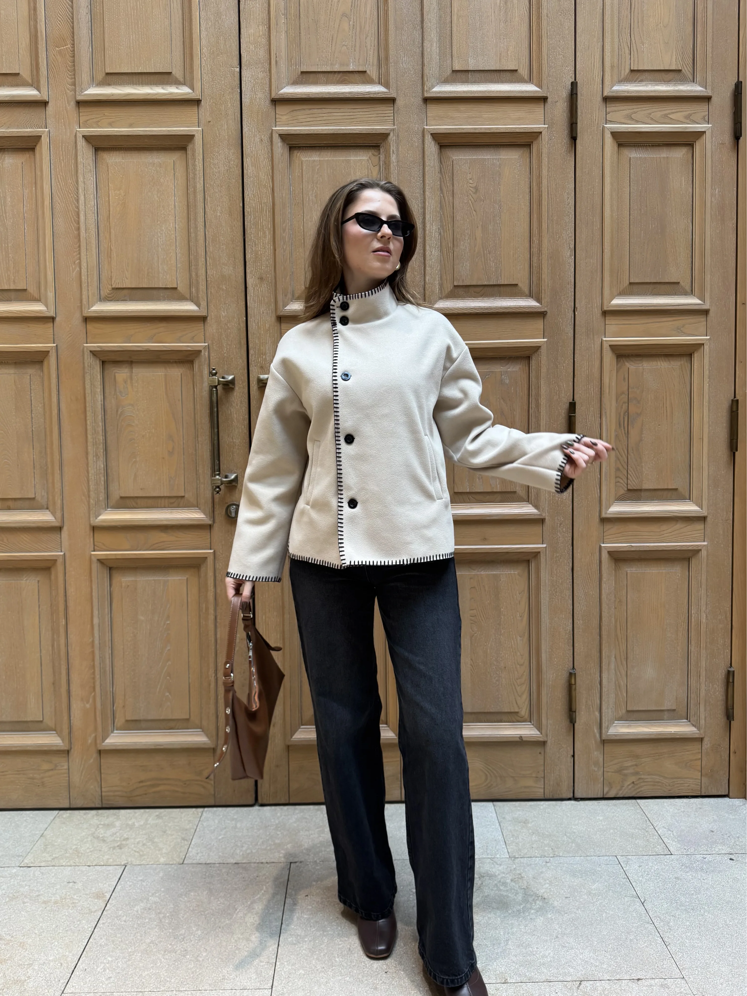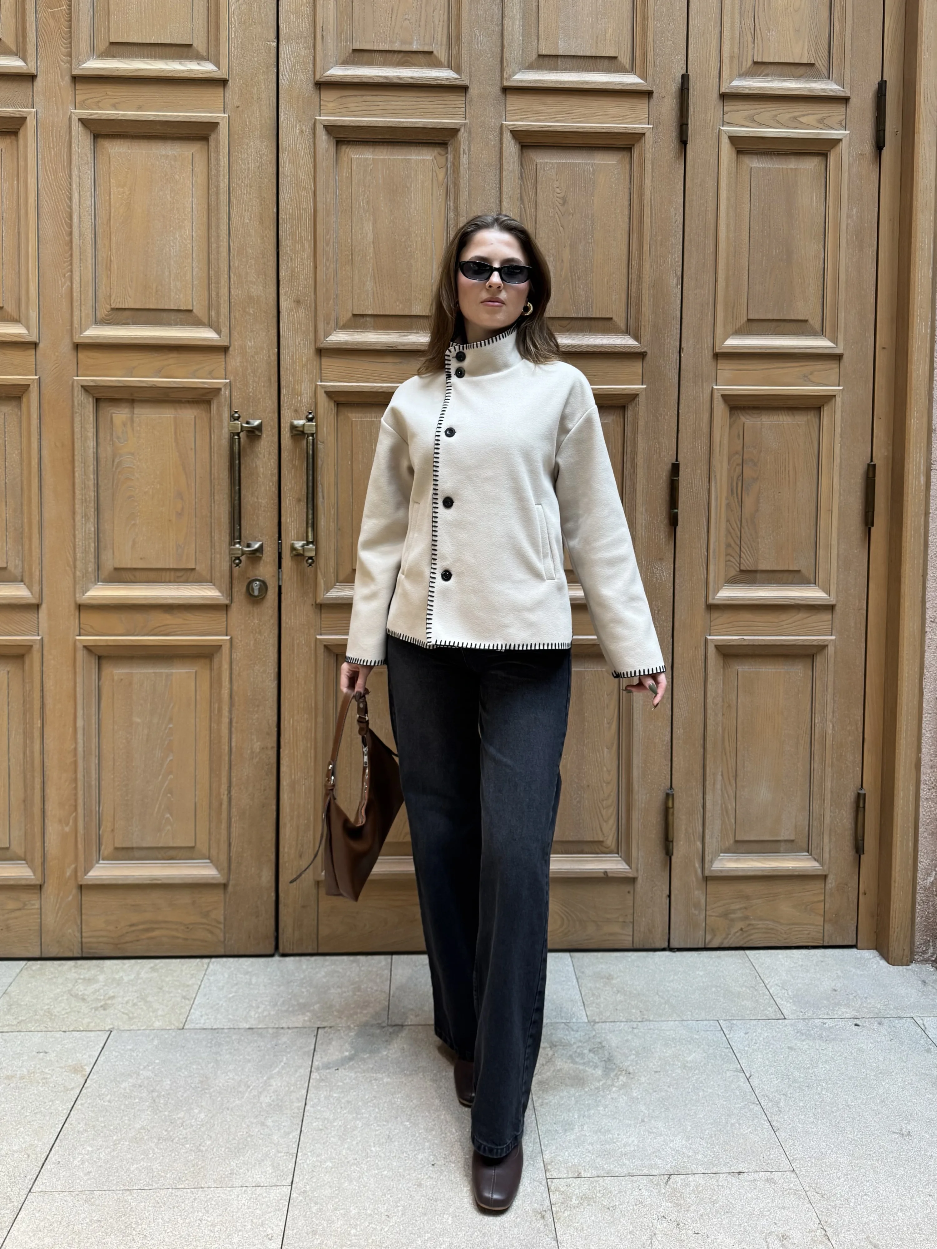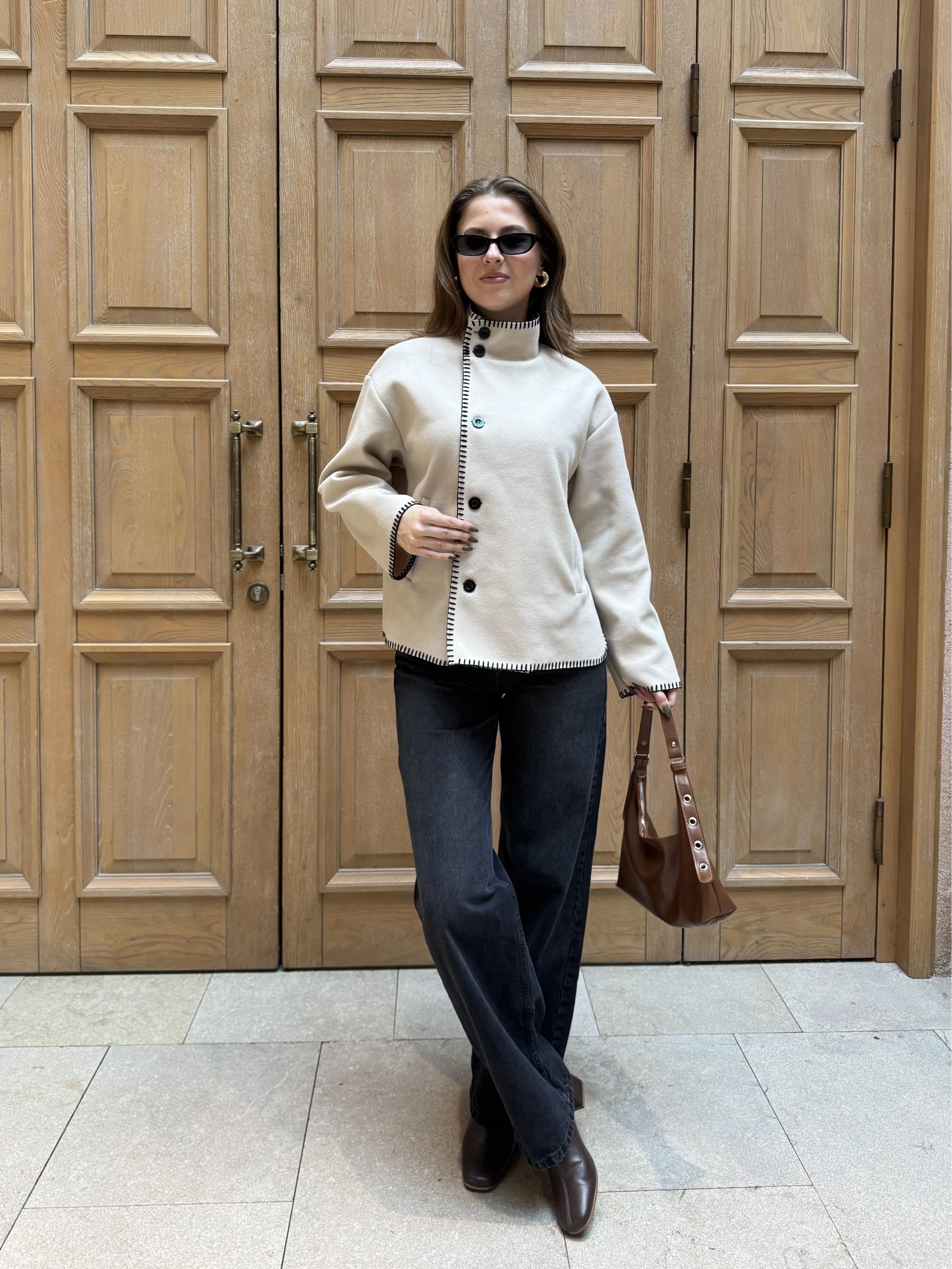 Krem Çoban Dikişli Kaşe Düğmeli Kaşe Hırka