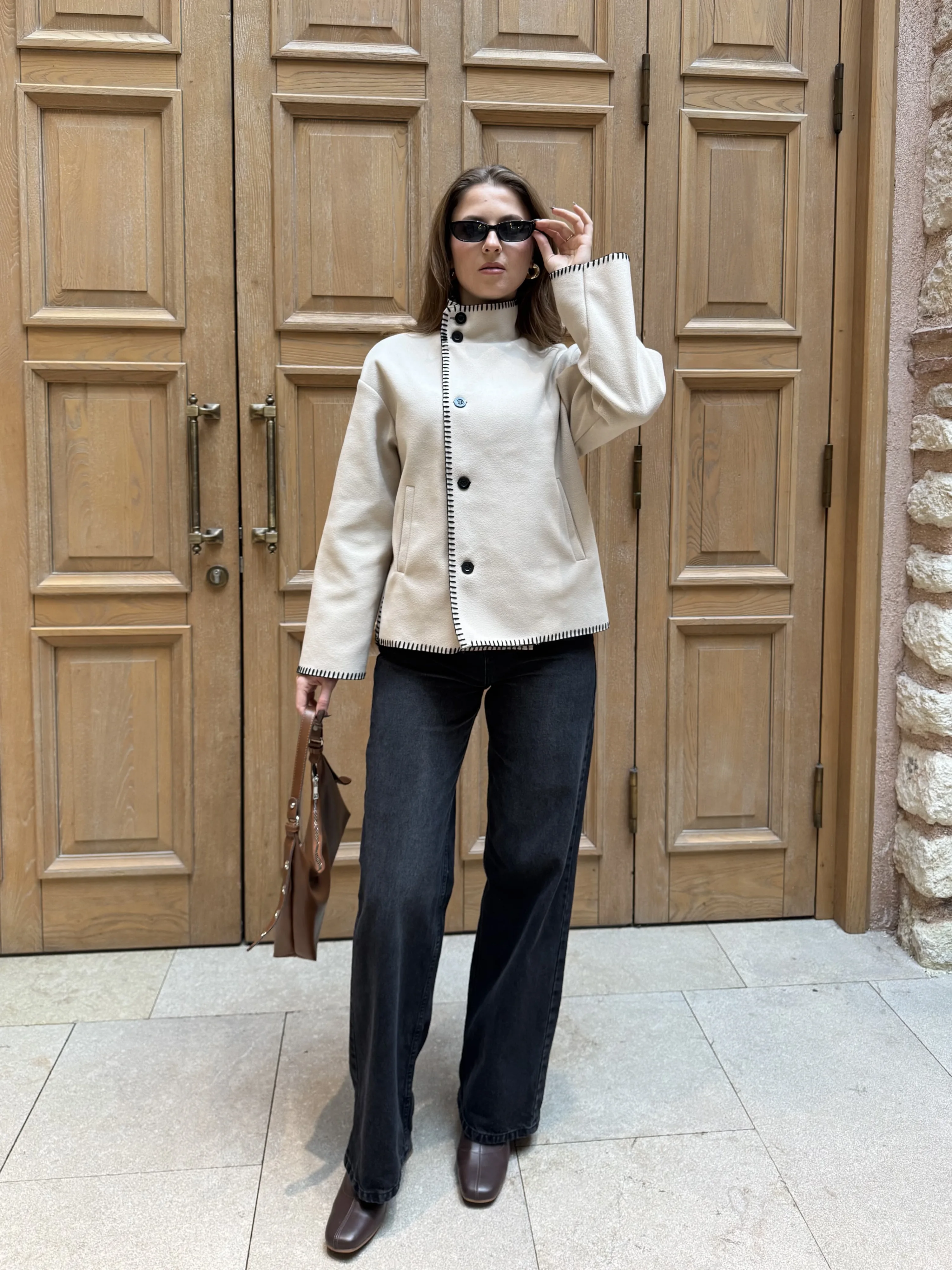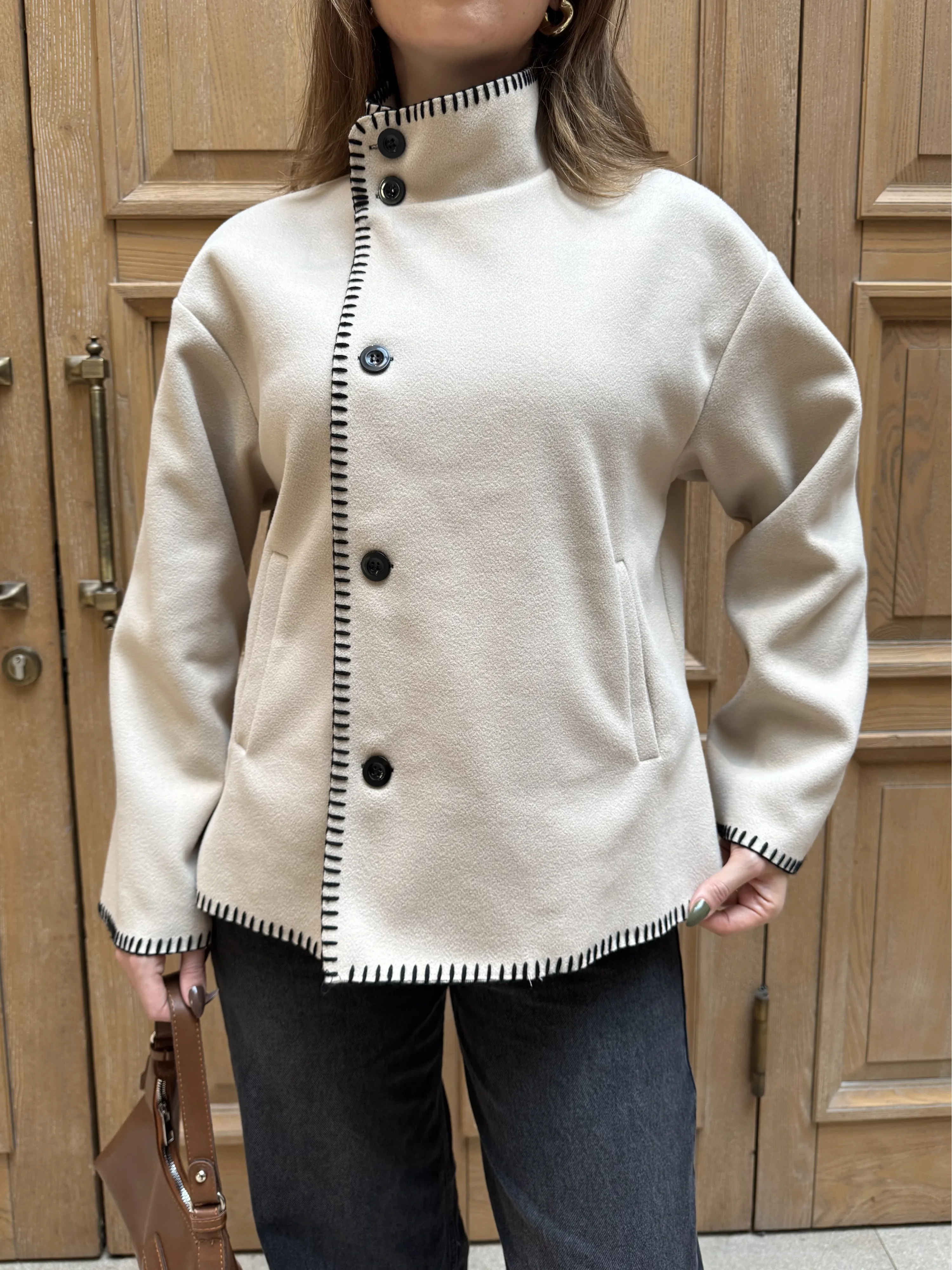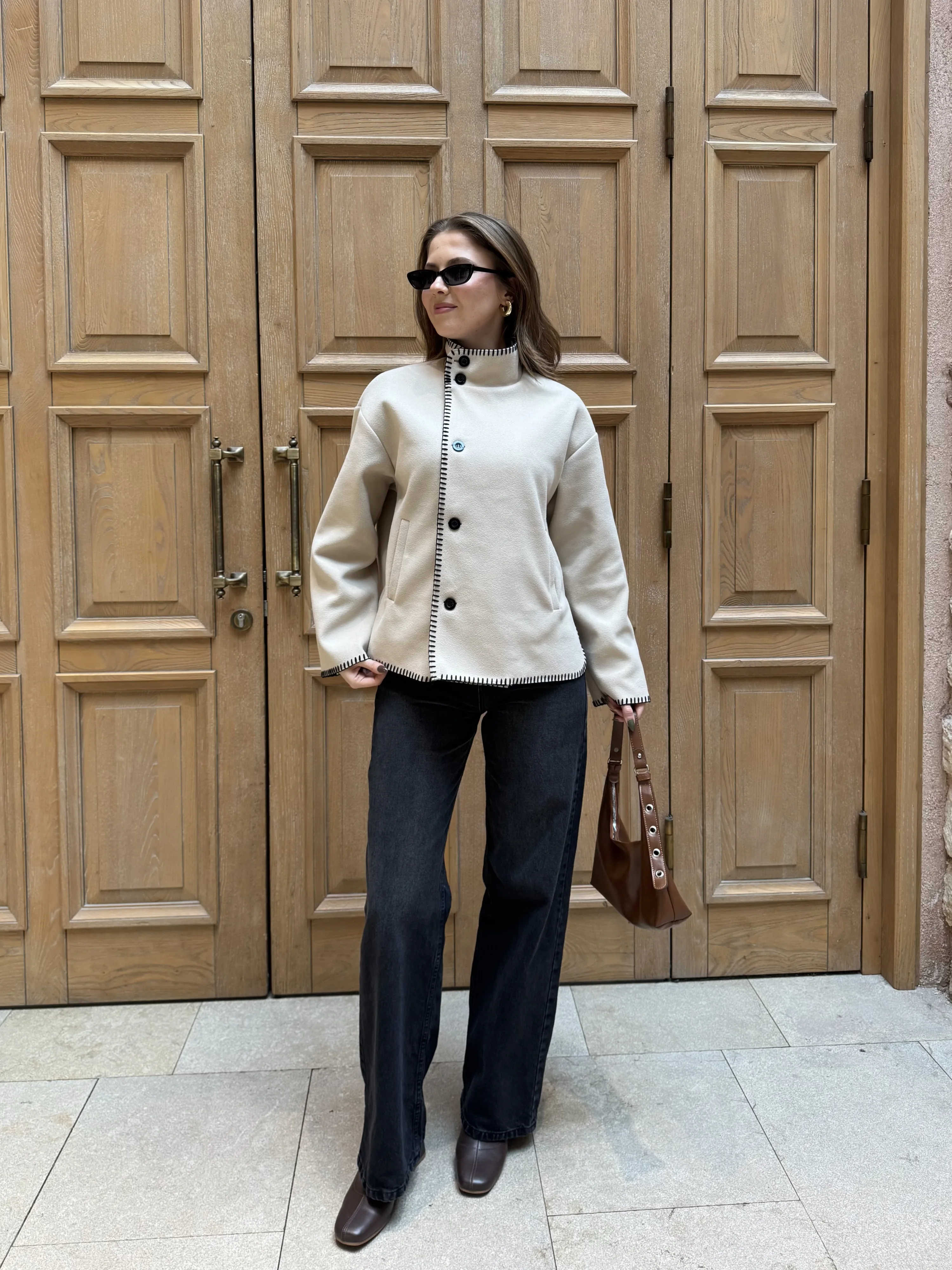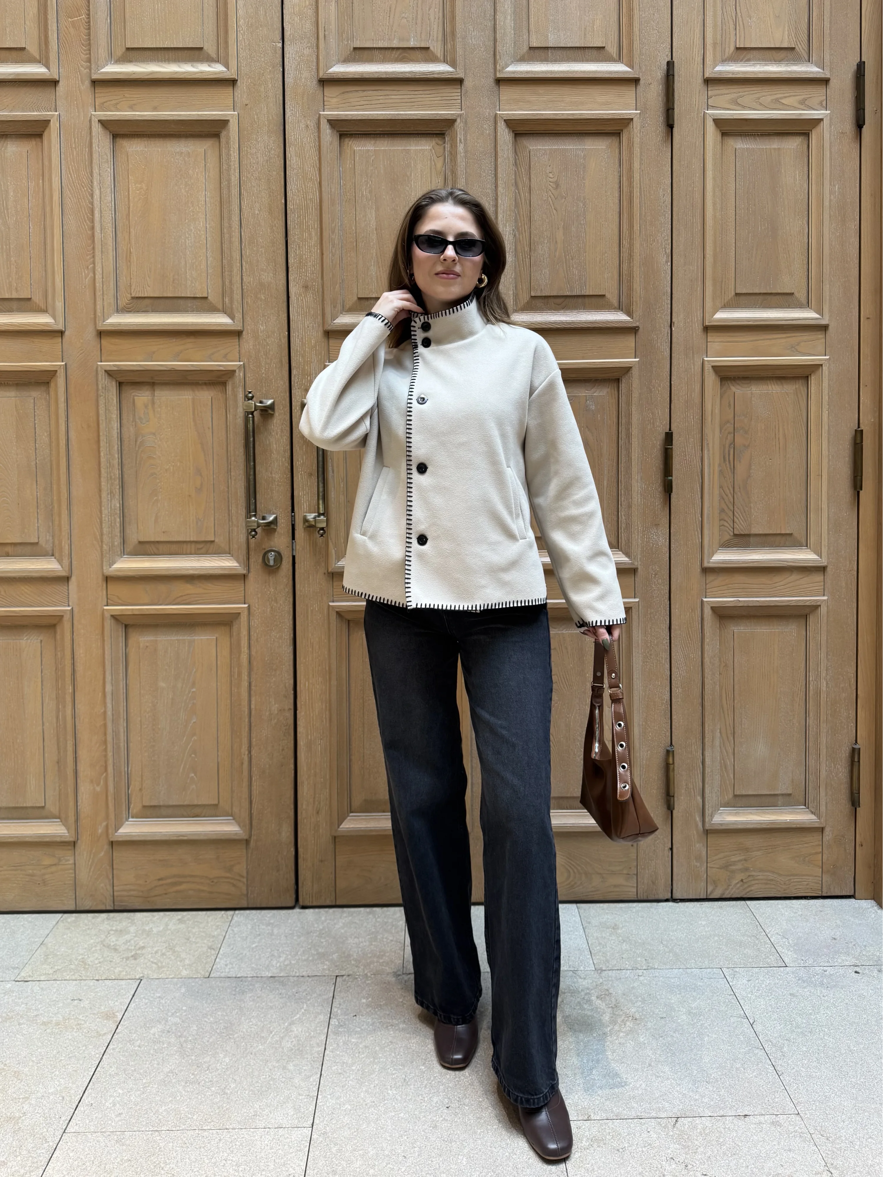 Krem Çoban Dikişli Kaşe Düğmeli Kaşe Hırka