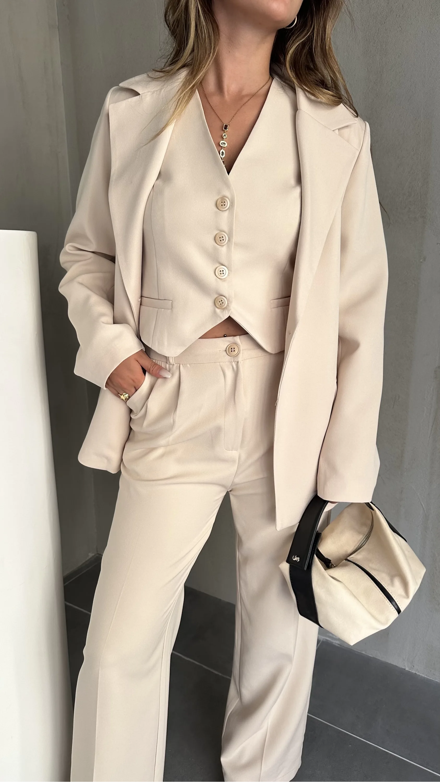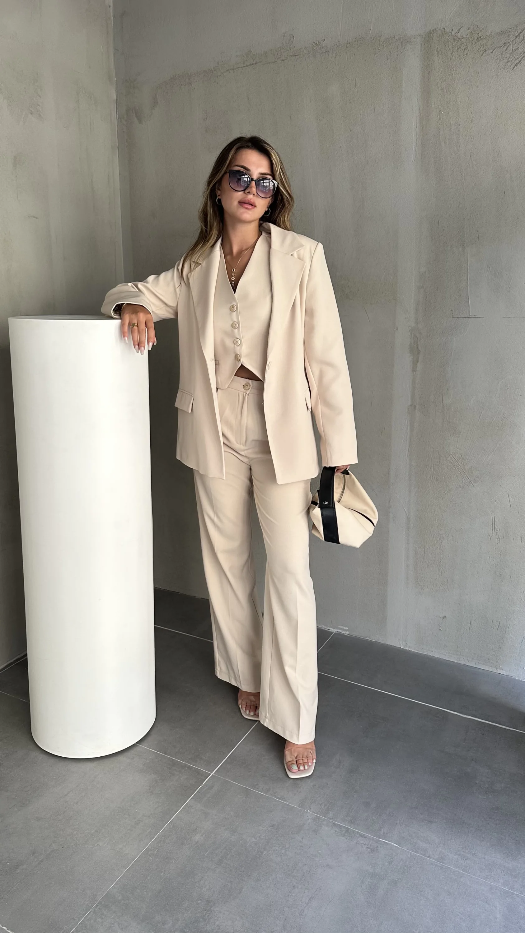 Krem Double Yelek-Pantolon-Blazer Ceket 3'lü Set Takım