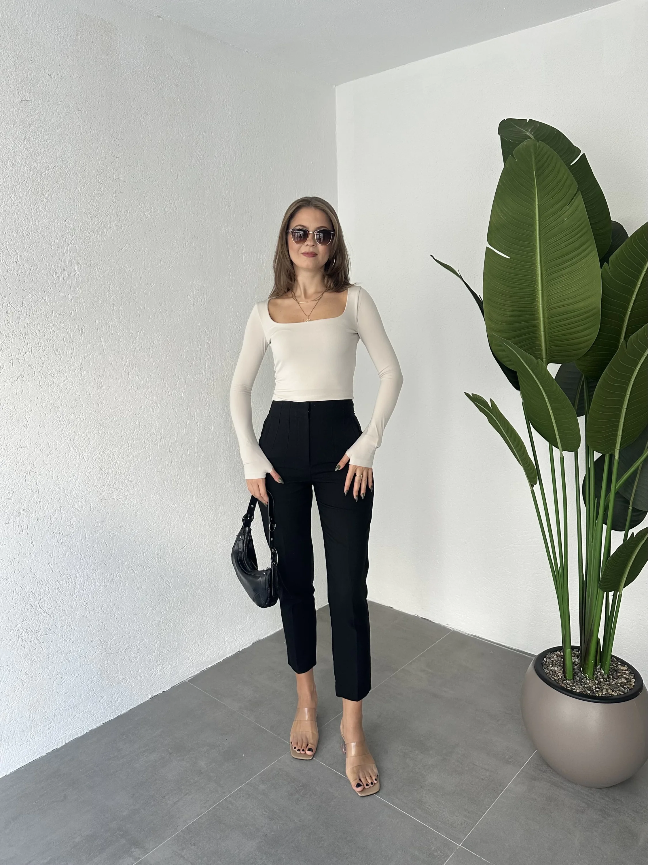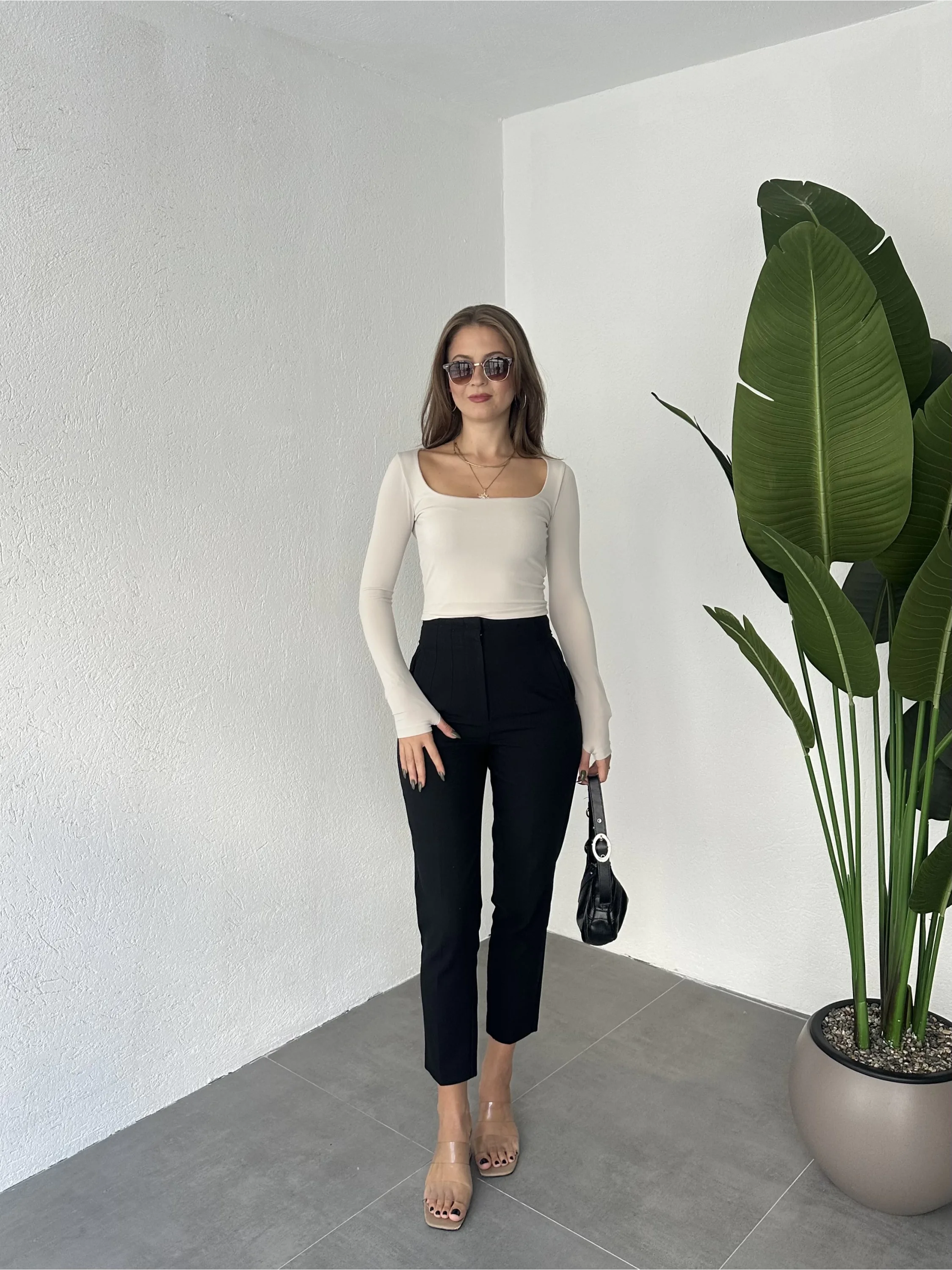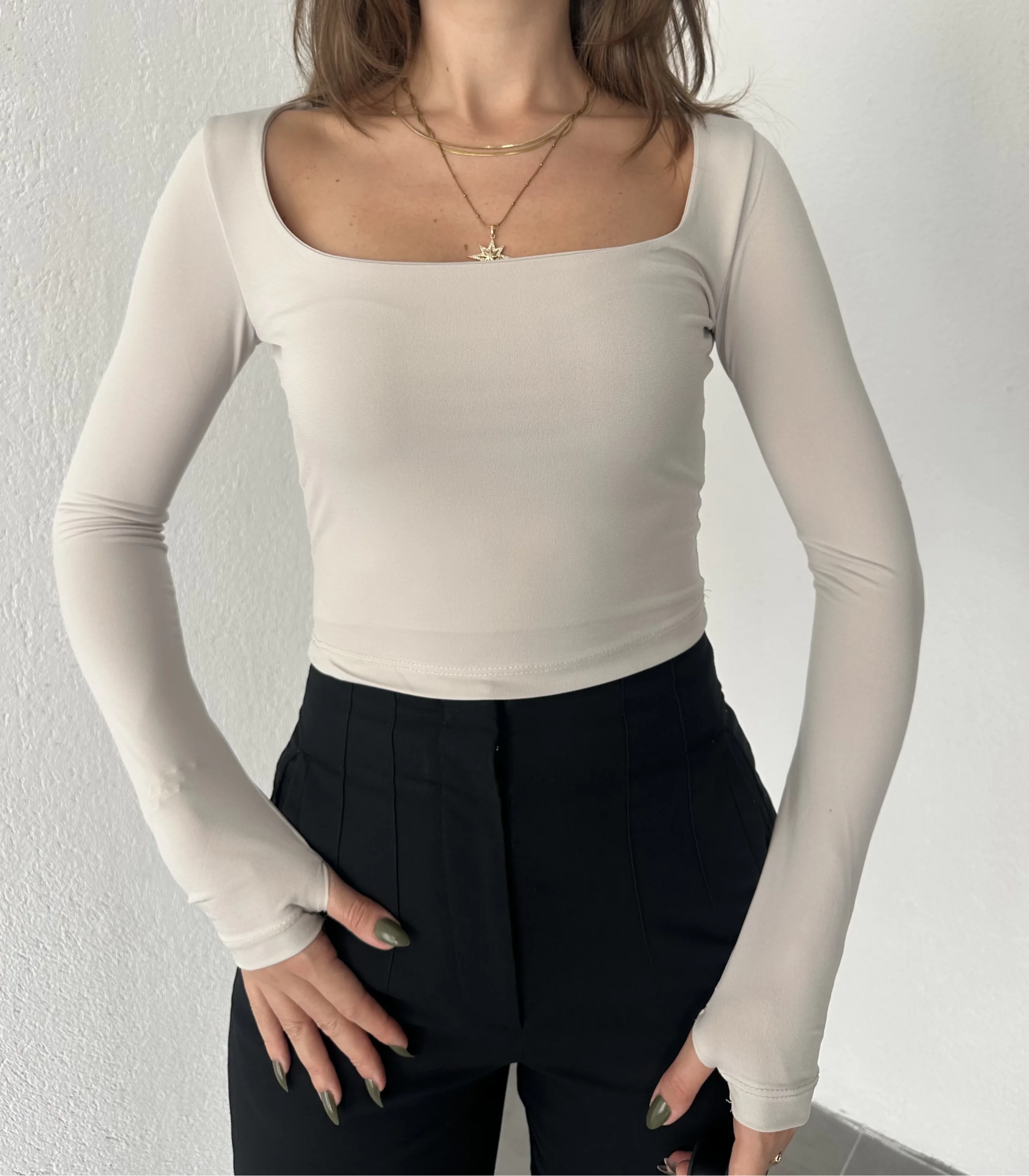 Krem Kare Yaka Parmak Geçirmeli Uzun Kol Candy Body Bluz