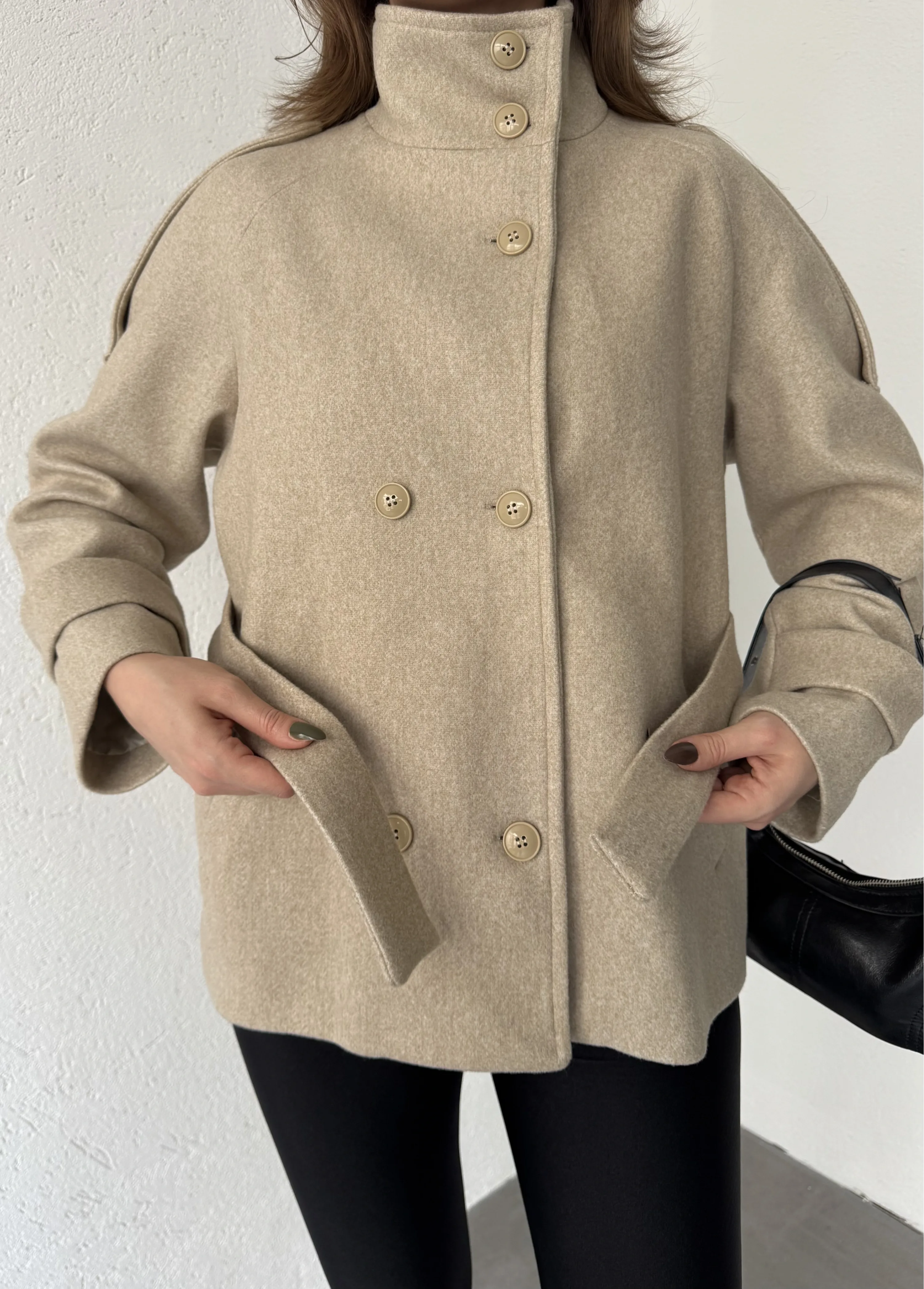 Krem Kruvaze Boğazlı Dik Yaka Düğmeli Apoletli Kaşe Kaban Mont