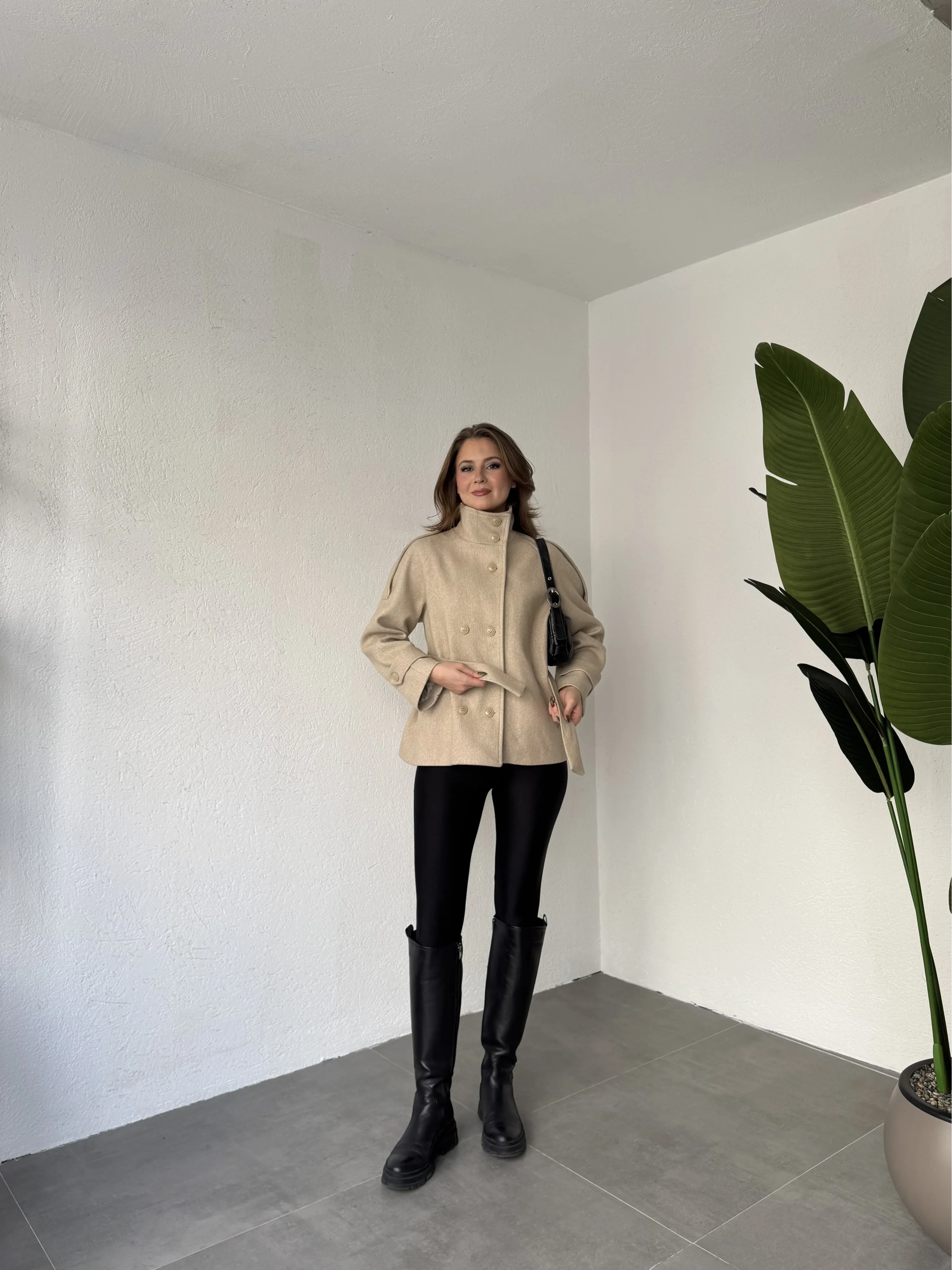 Krem Kemerli Dik Yaka Düğmeli Kaşe Pelerin Panço
