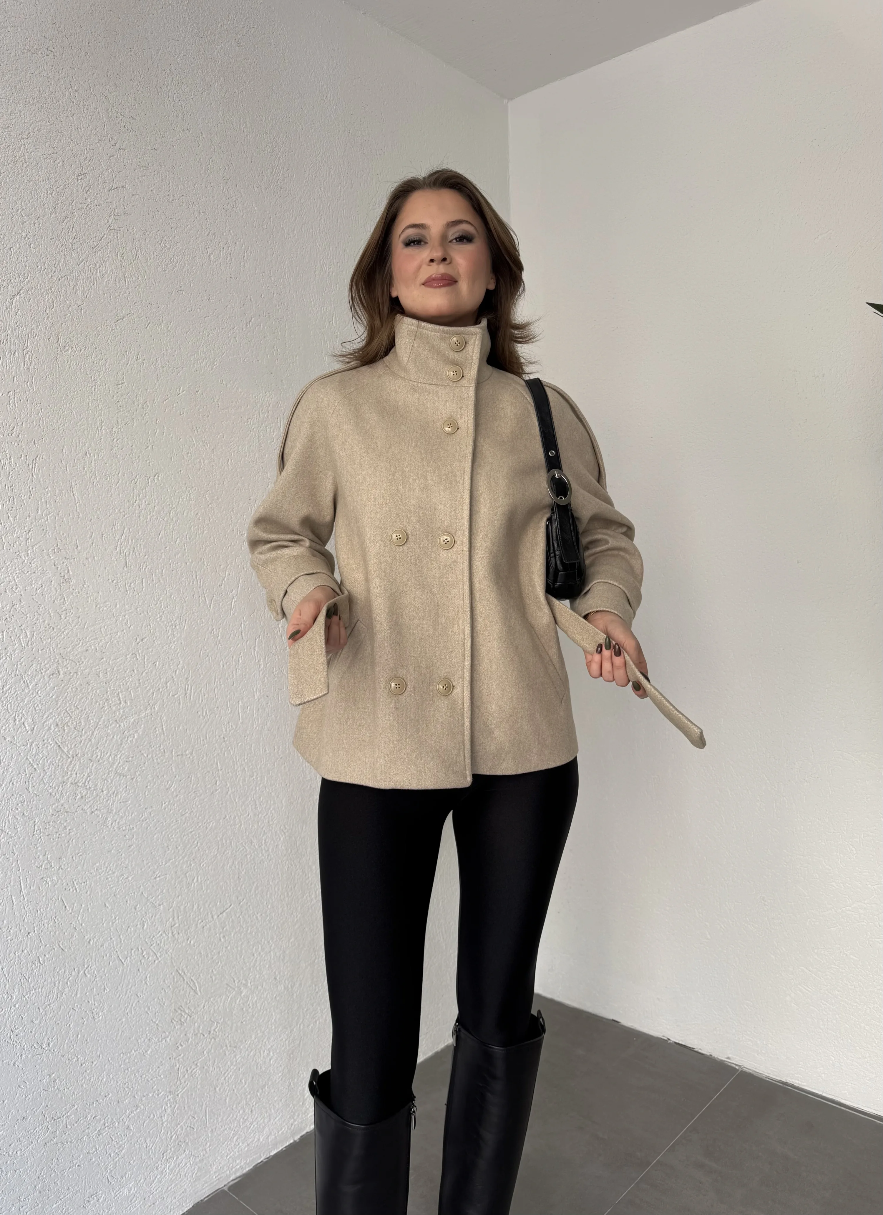 Krem Bisiklet Yaka Şal Aksesurlı Düğmeli Kaşe Ceket Mont