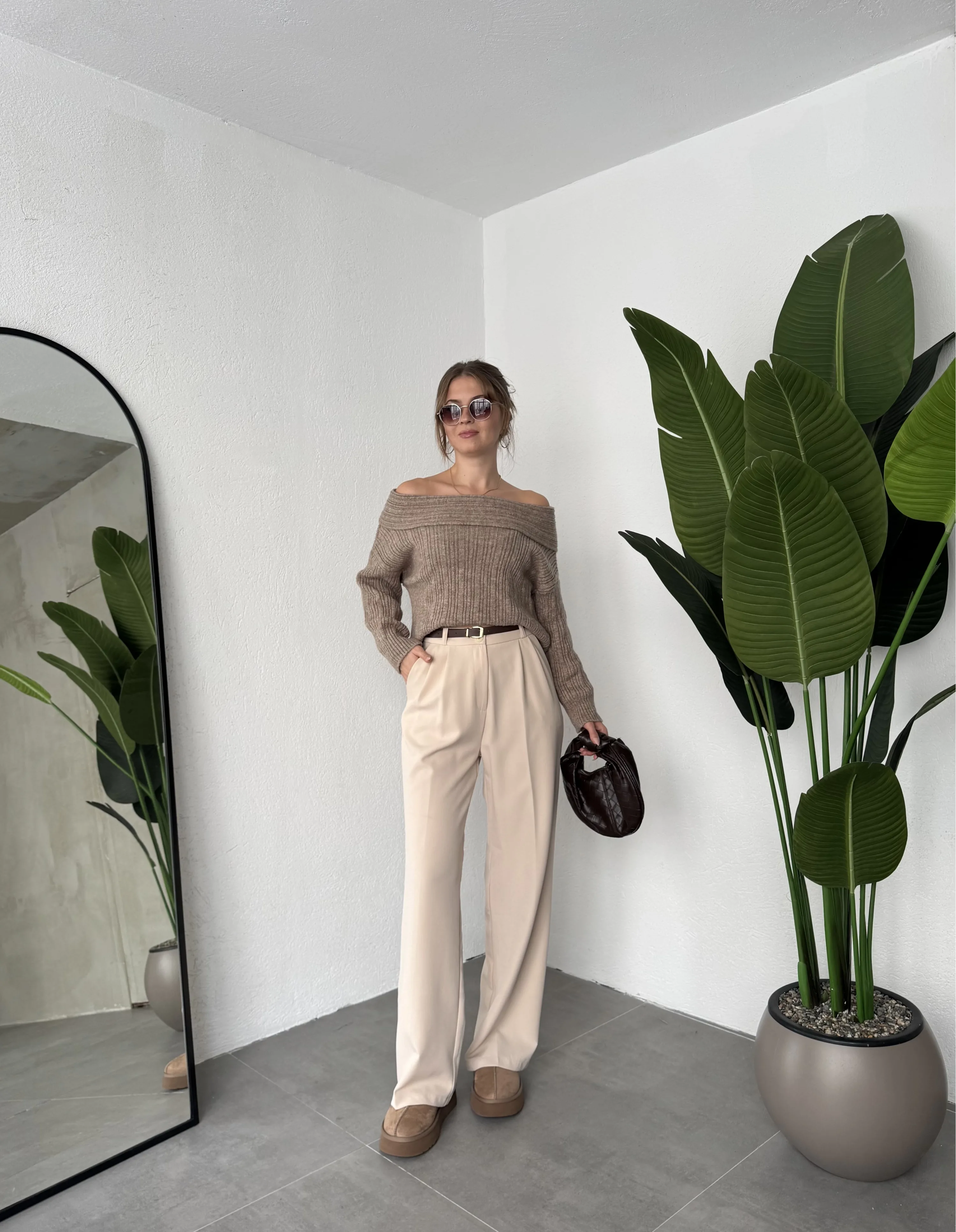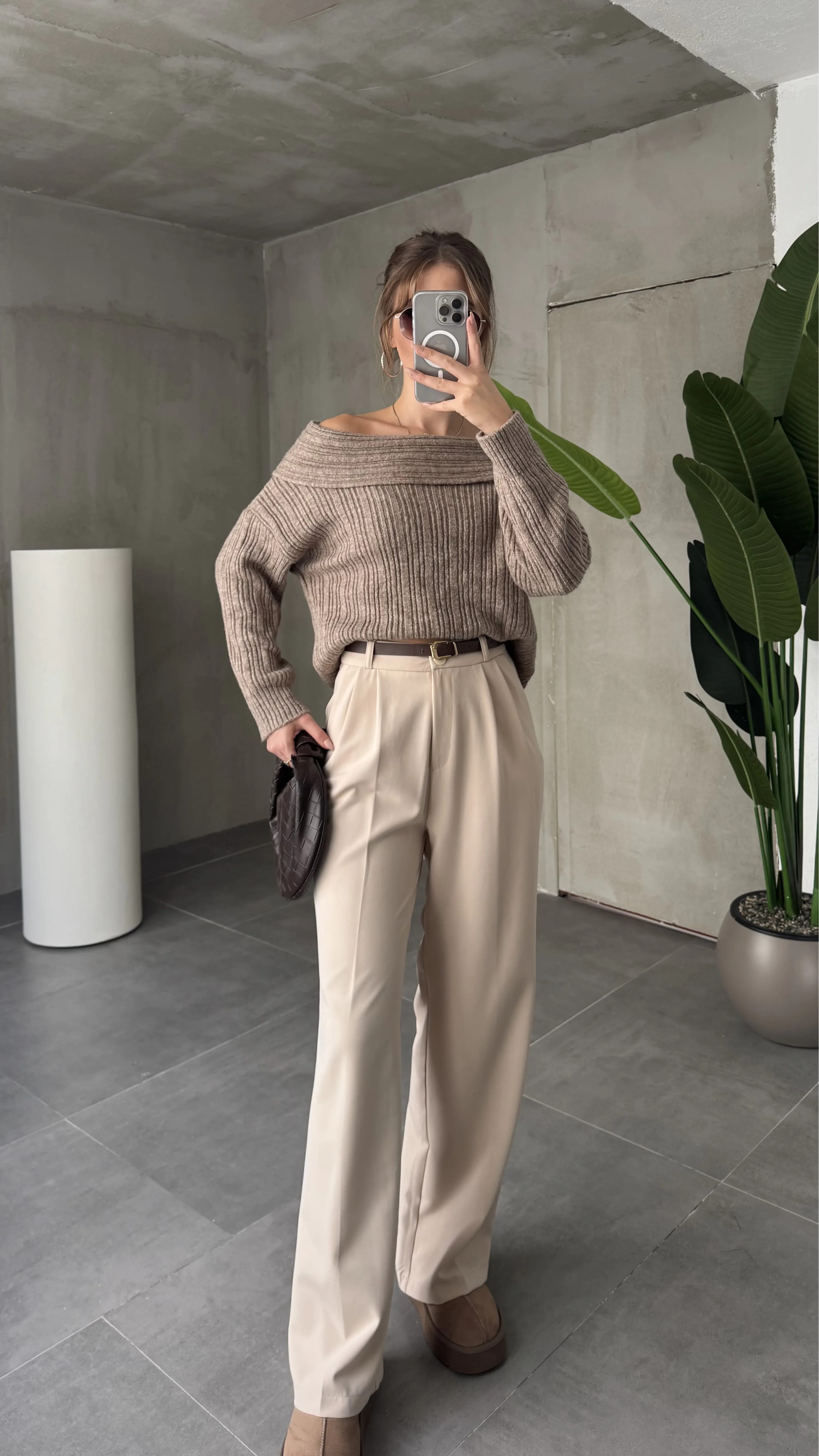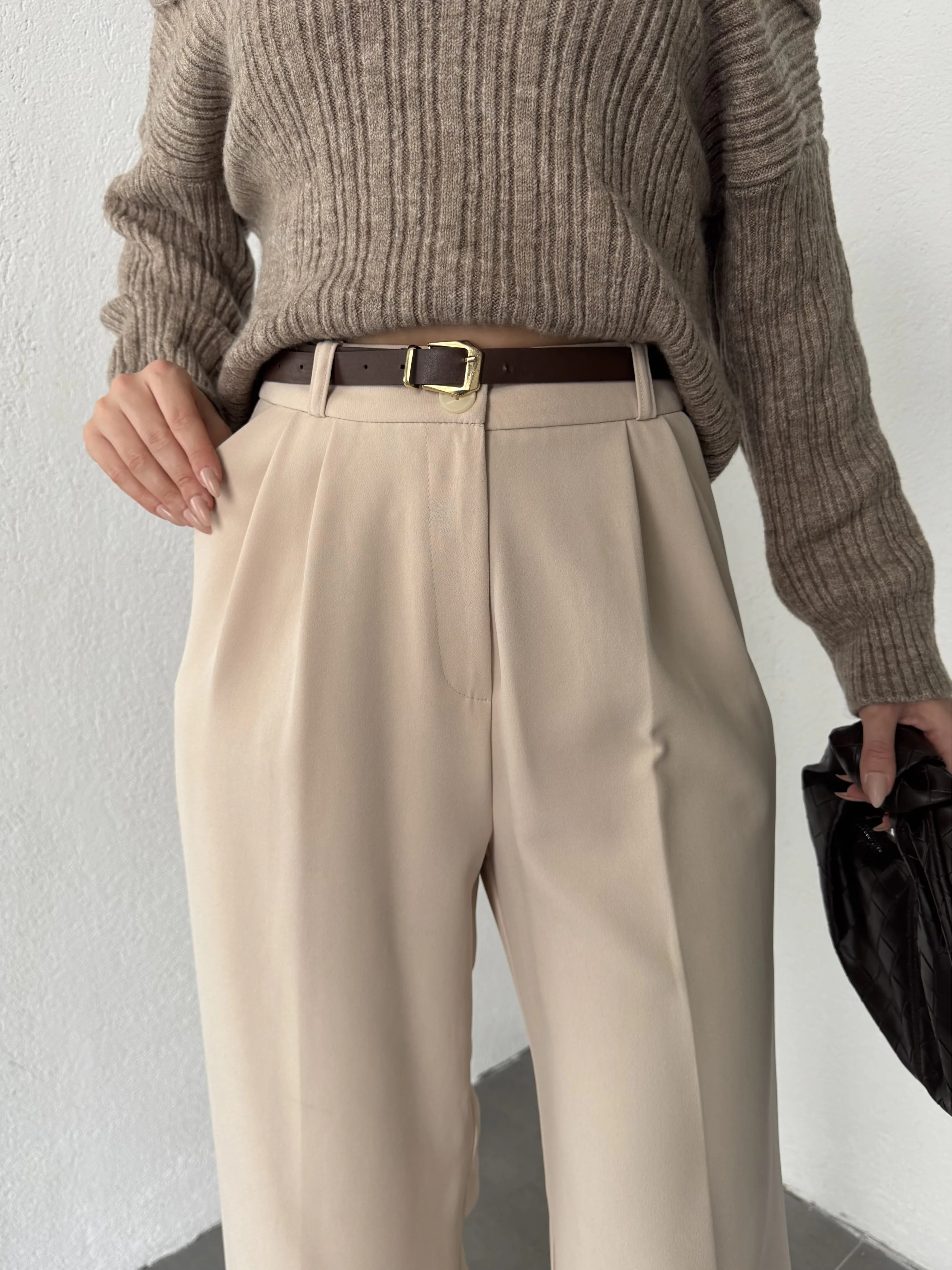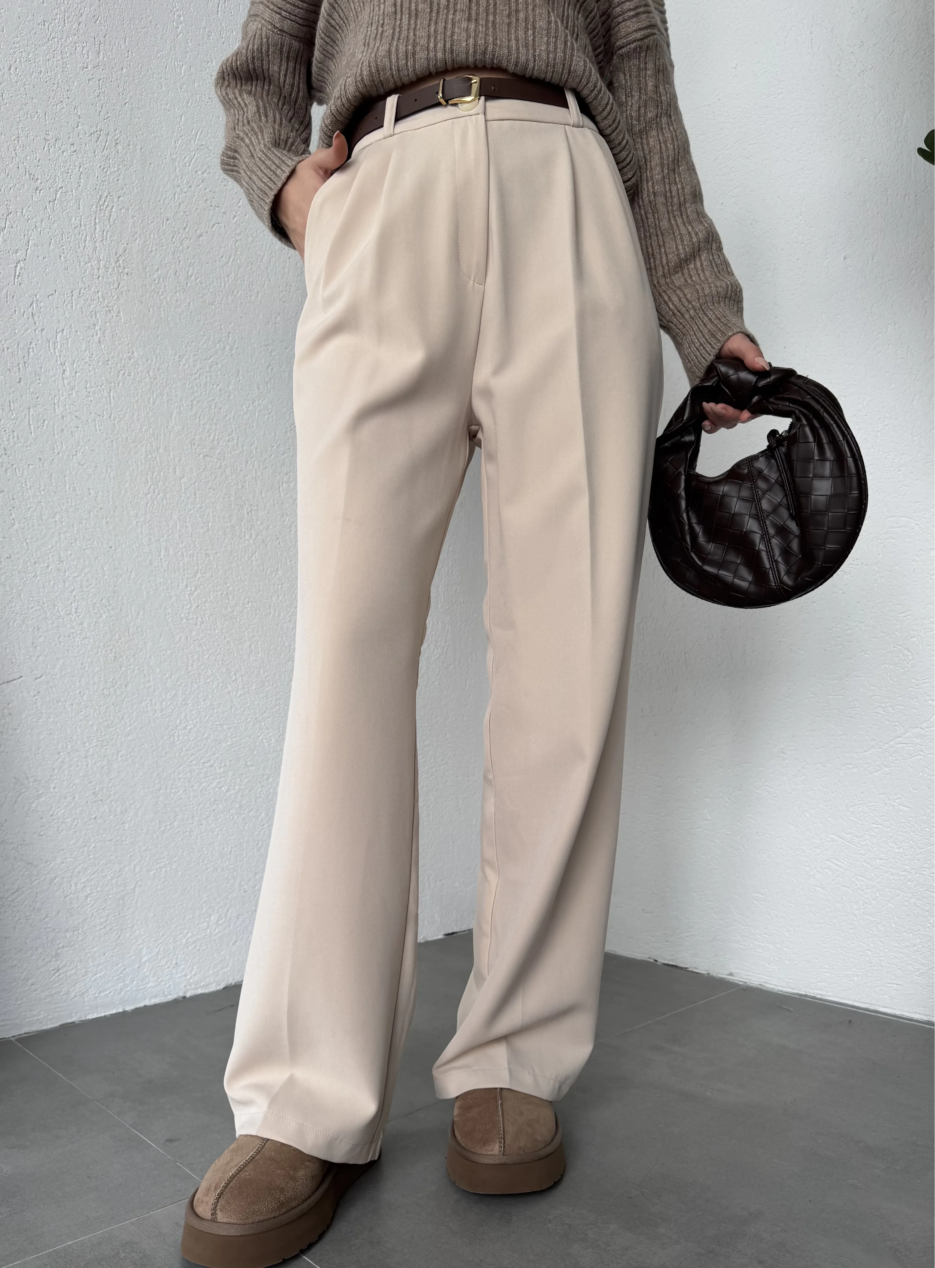 Krem Pileli Tam Kalıp Bel Oturtmalı Geniş Paça Palazzo Pantolon