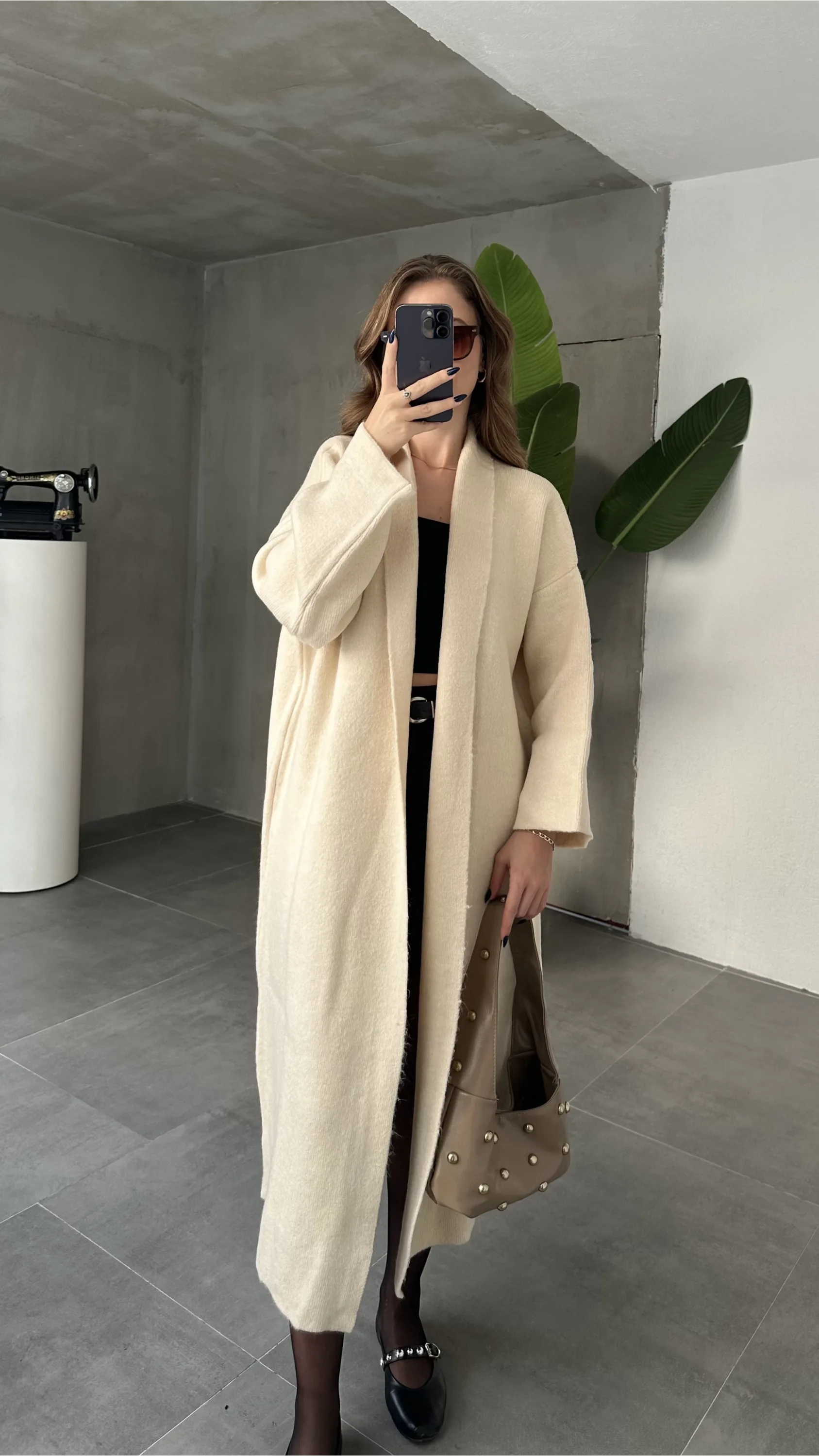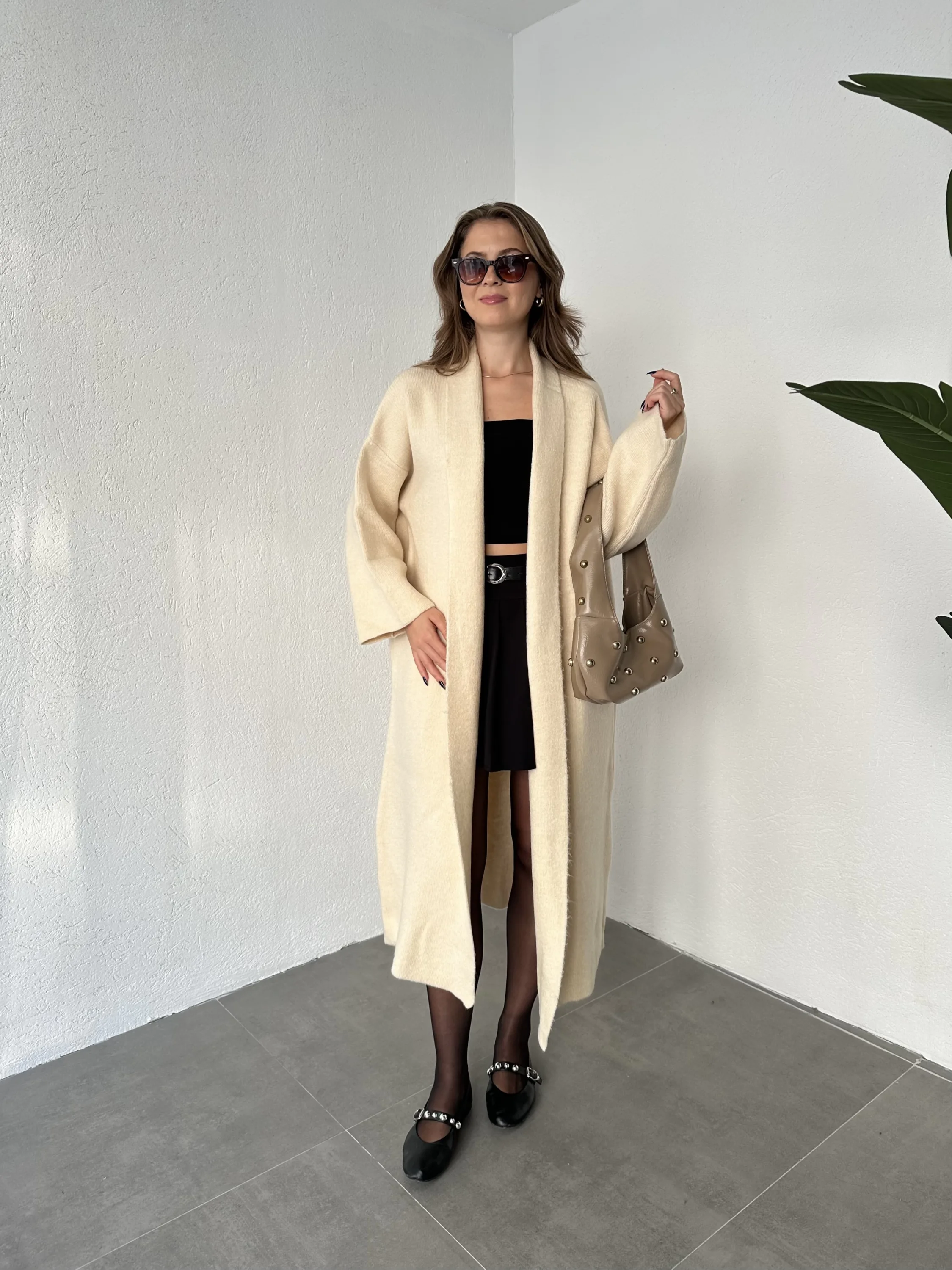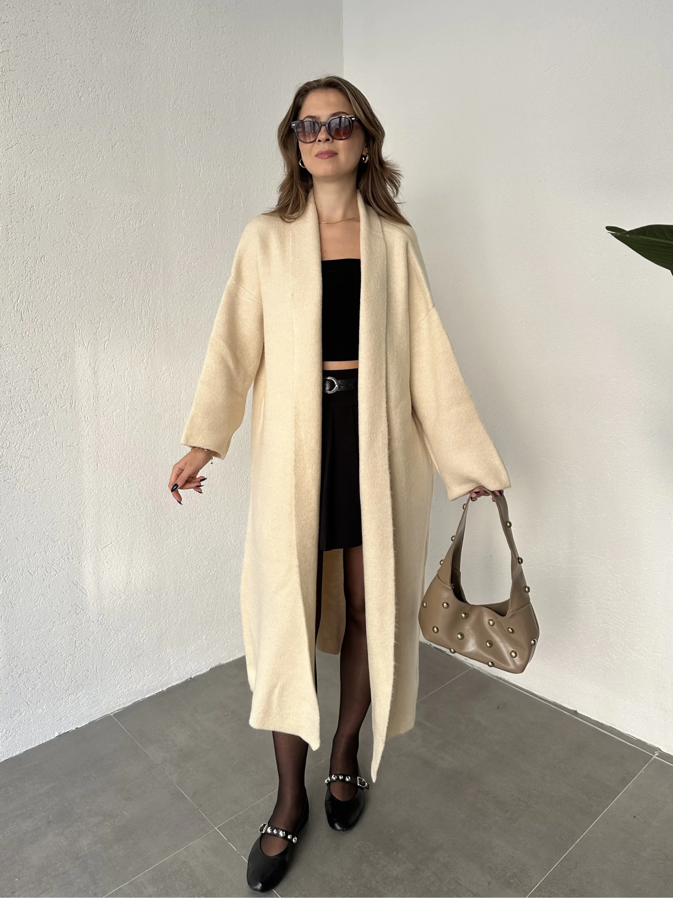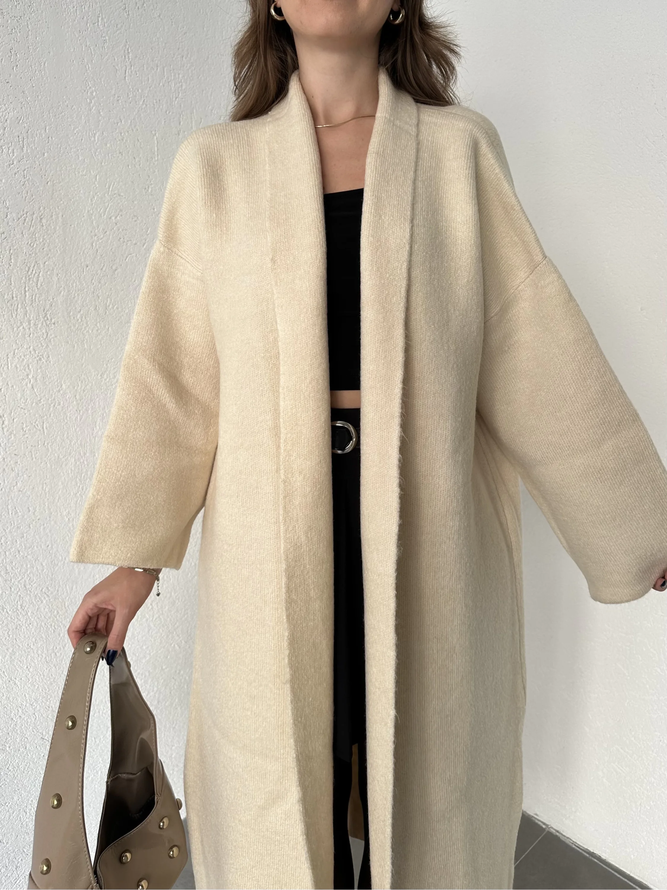 Krem Şal Yaka Tam Boy Uzun Salaş Oversize Triko Hırka