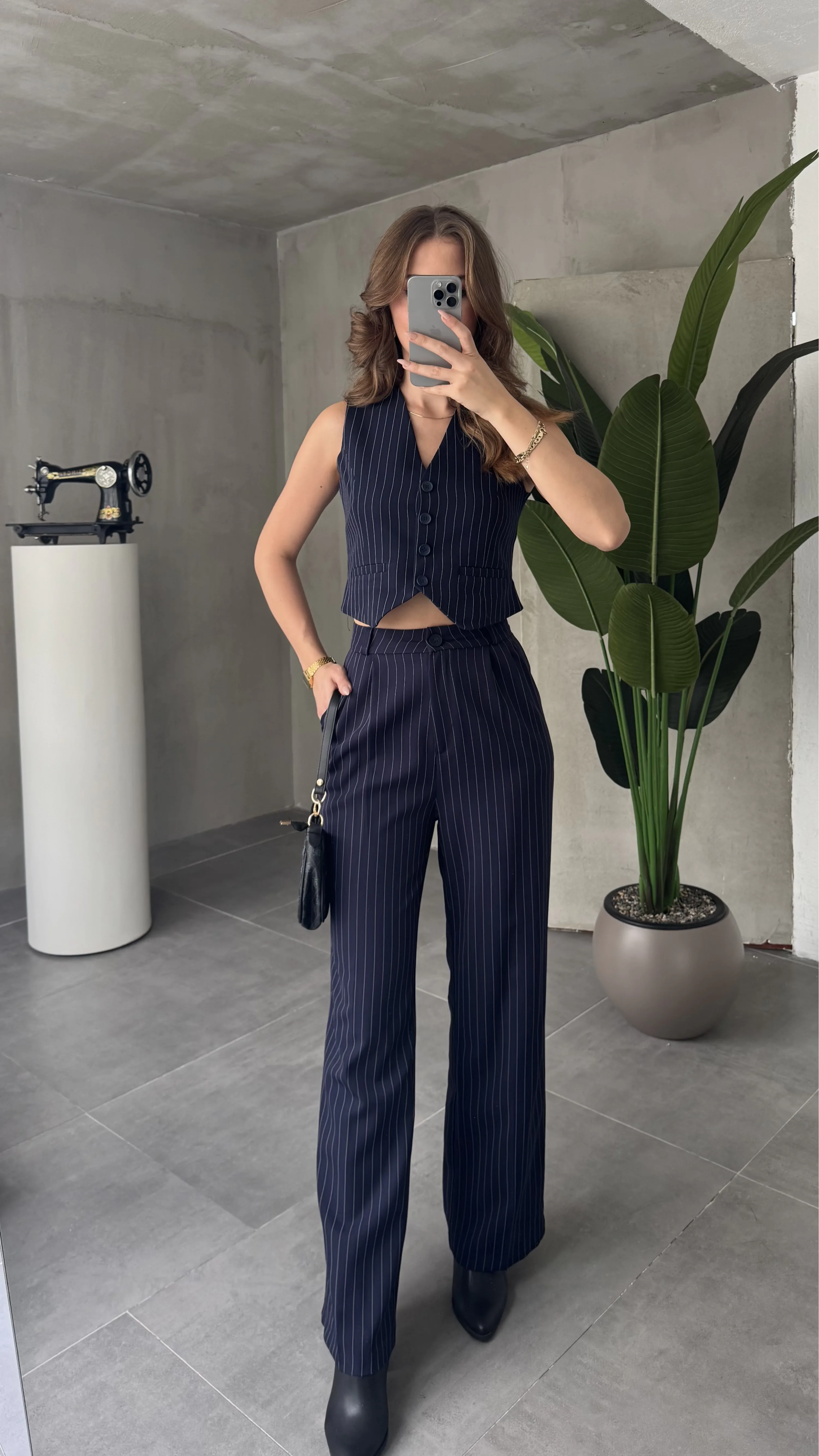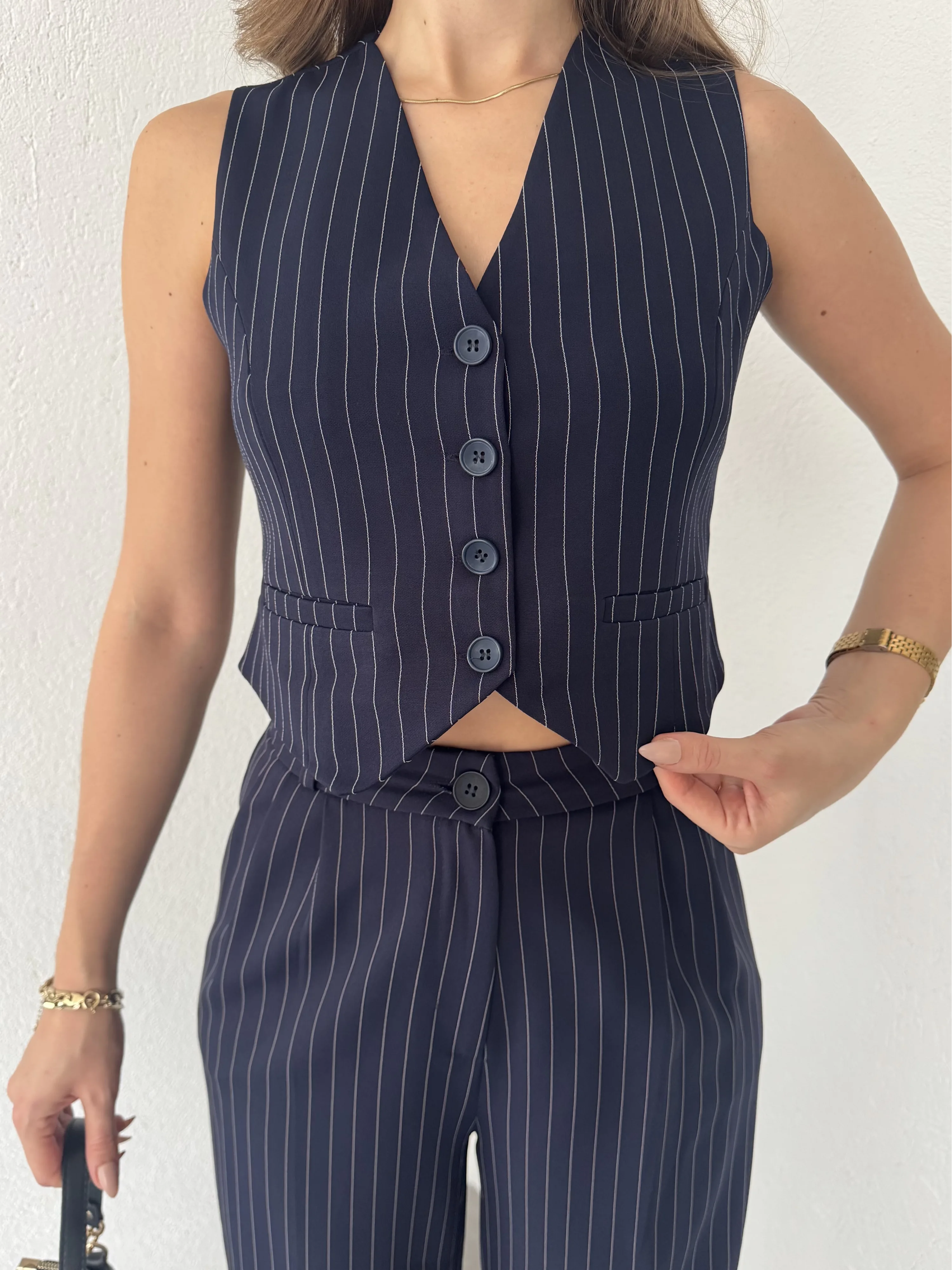 Lacivert Çizgili Kolsuz Düğmeli Astarlı Yelek