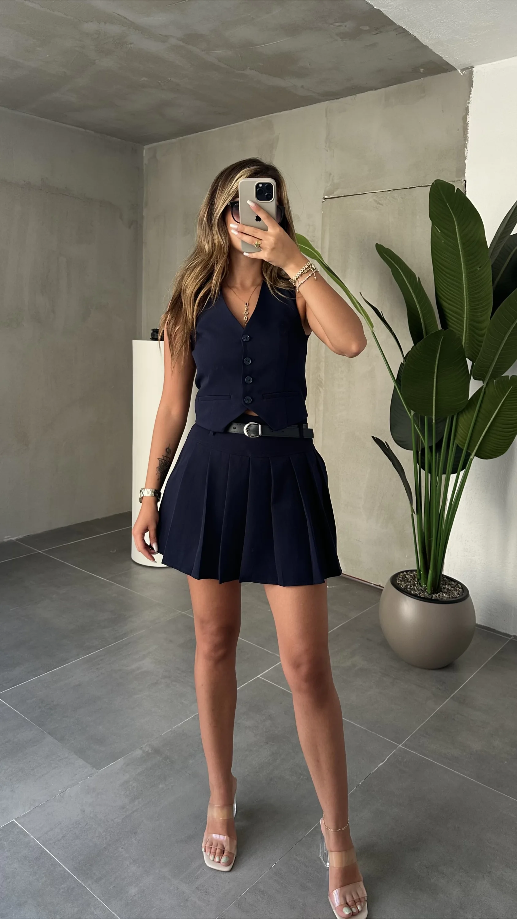 Lacivert Düğmeli Kolsuz Yelek&Astarlı Mini Şort Etek Alt Üst Takım