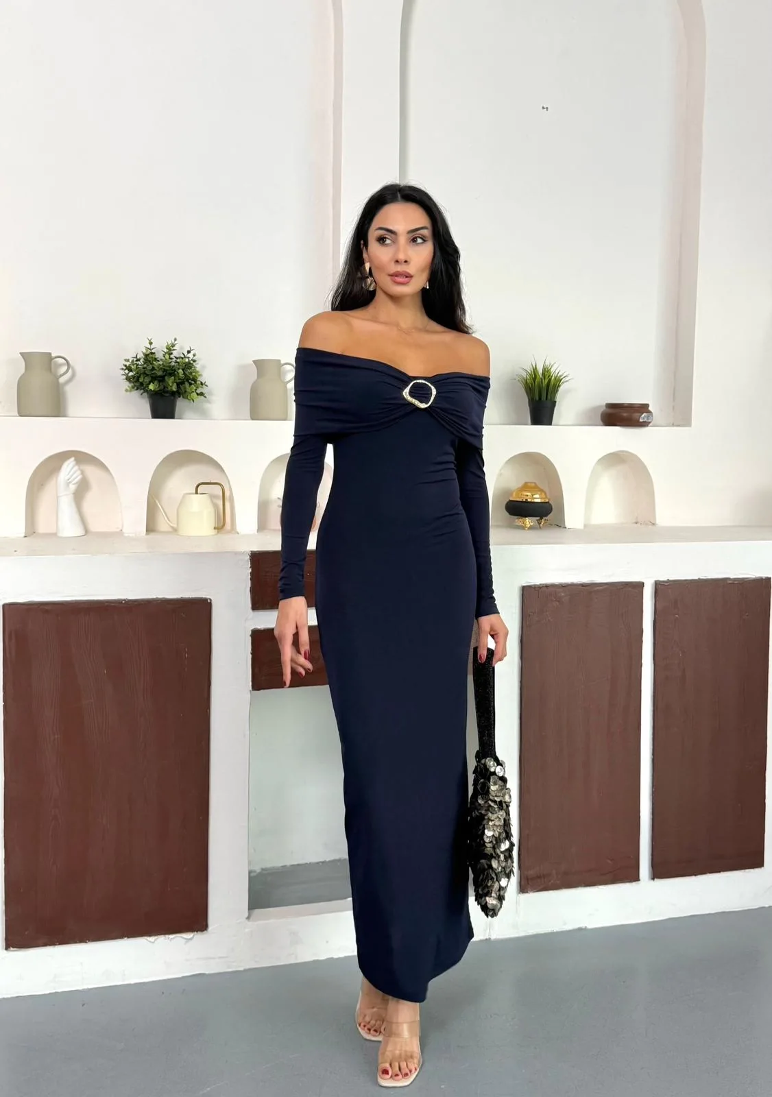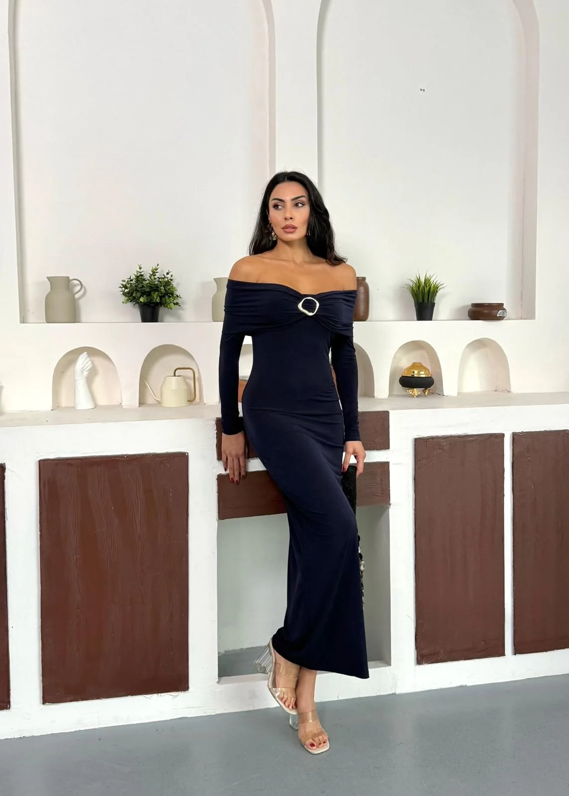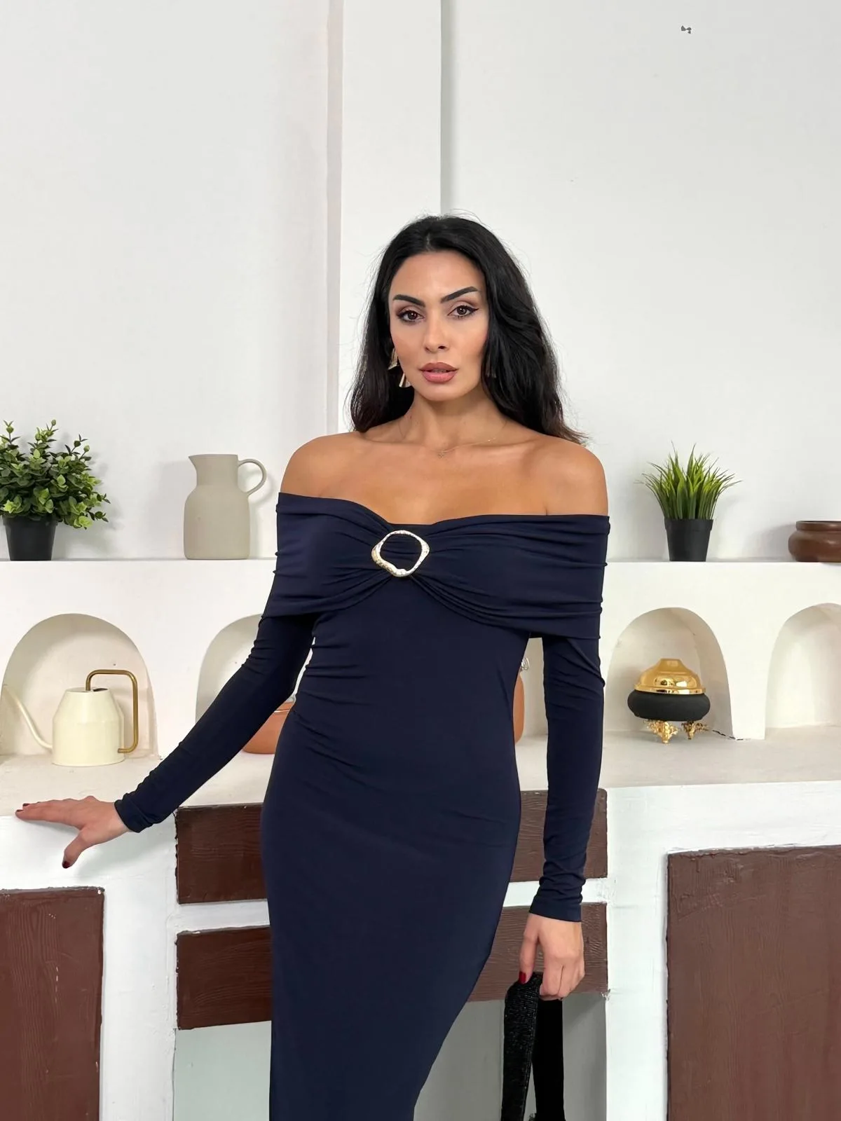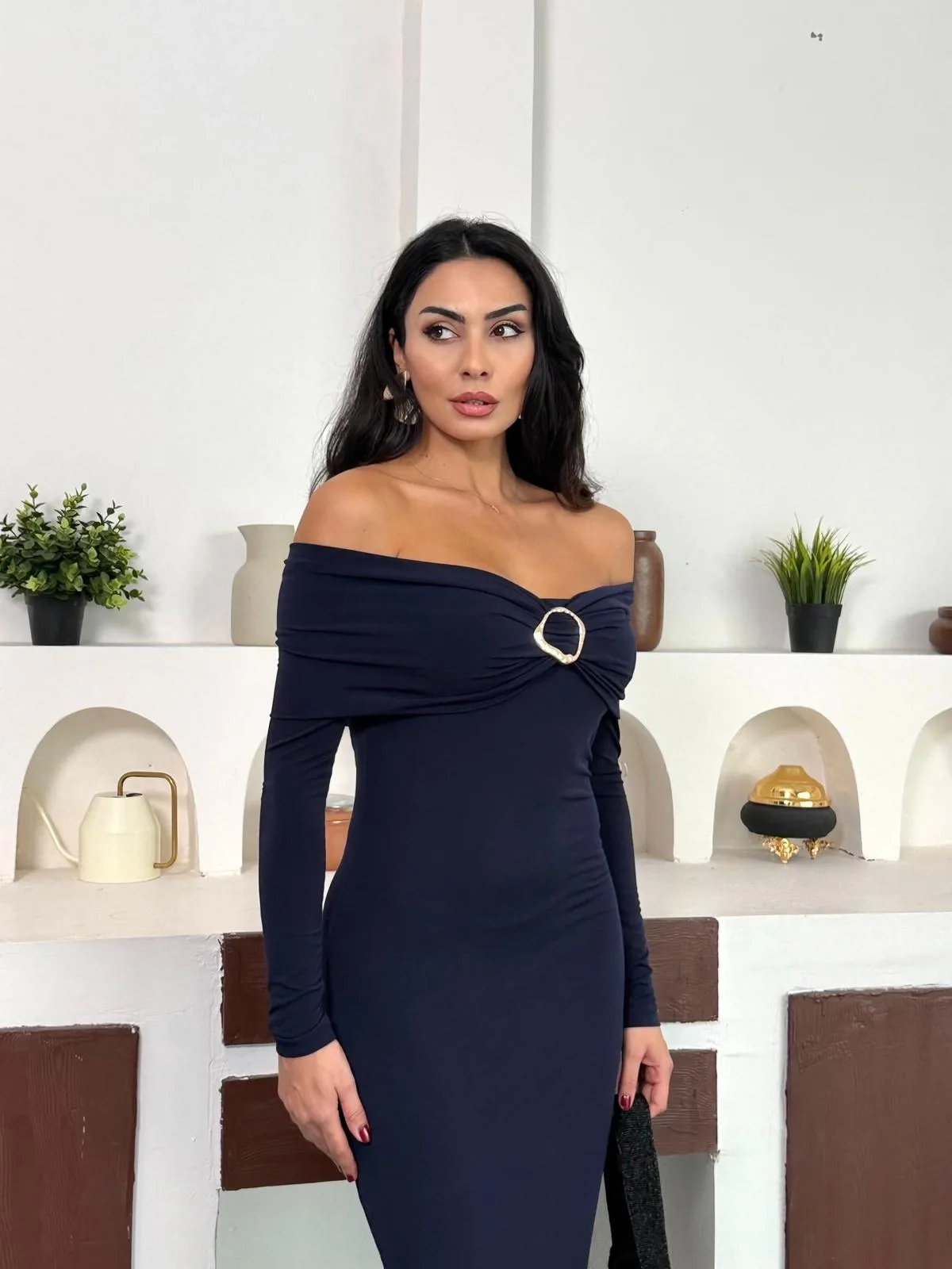Lacivert Madonna Yaka Gold Aksesuarlı Uzun Kollu Vucudu Saran Uzun Midi Boy Elbise