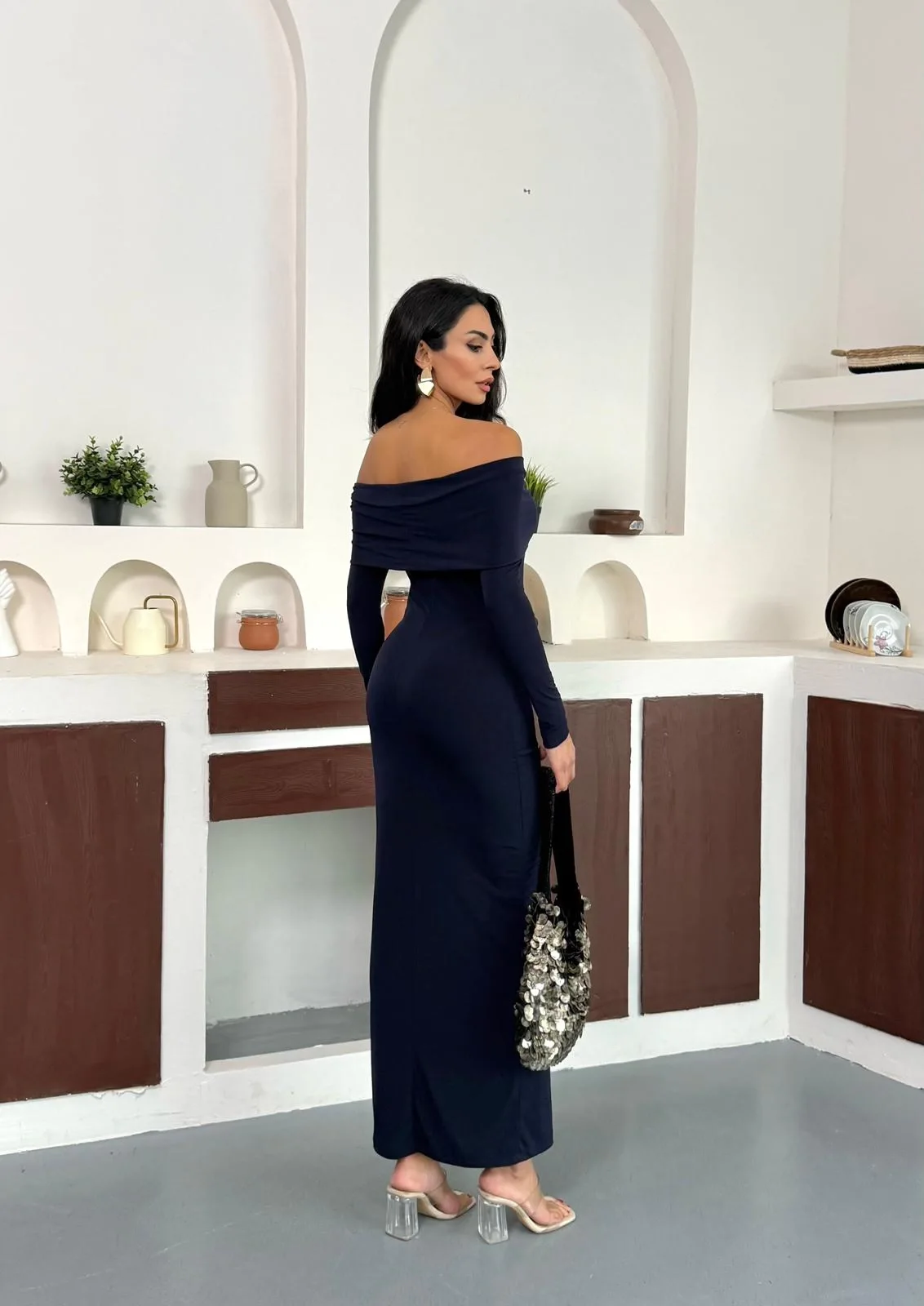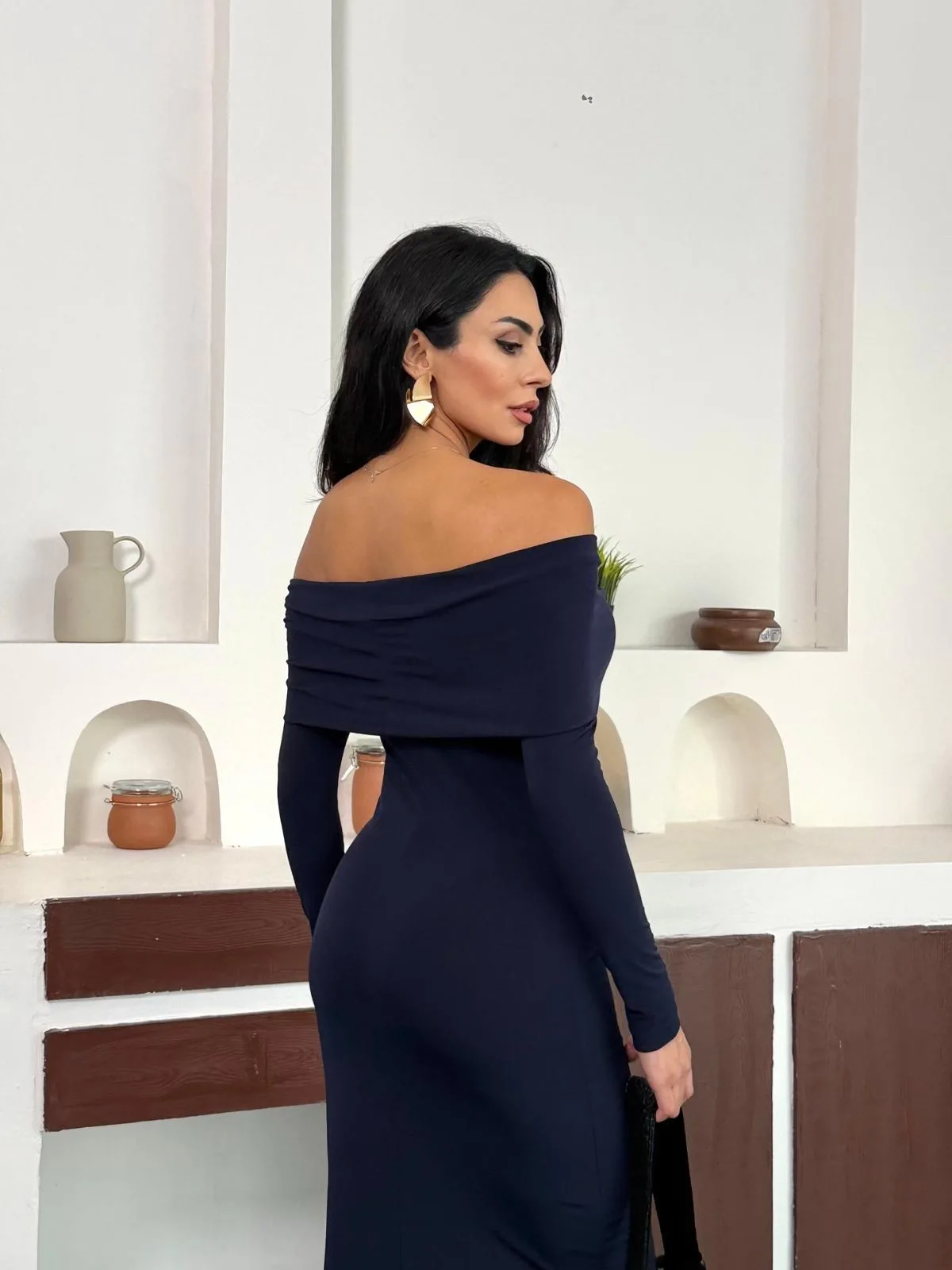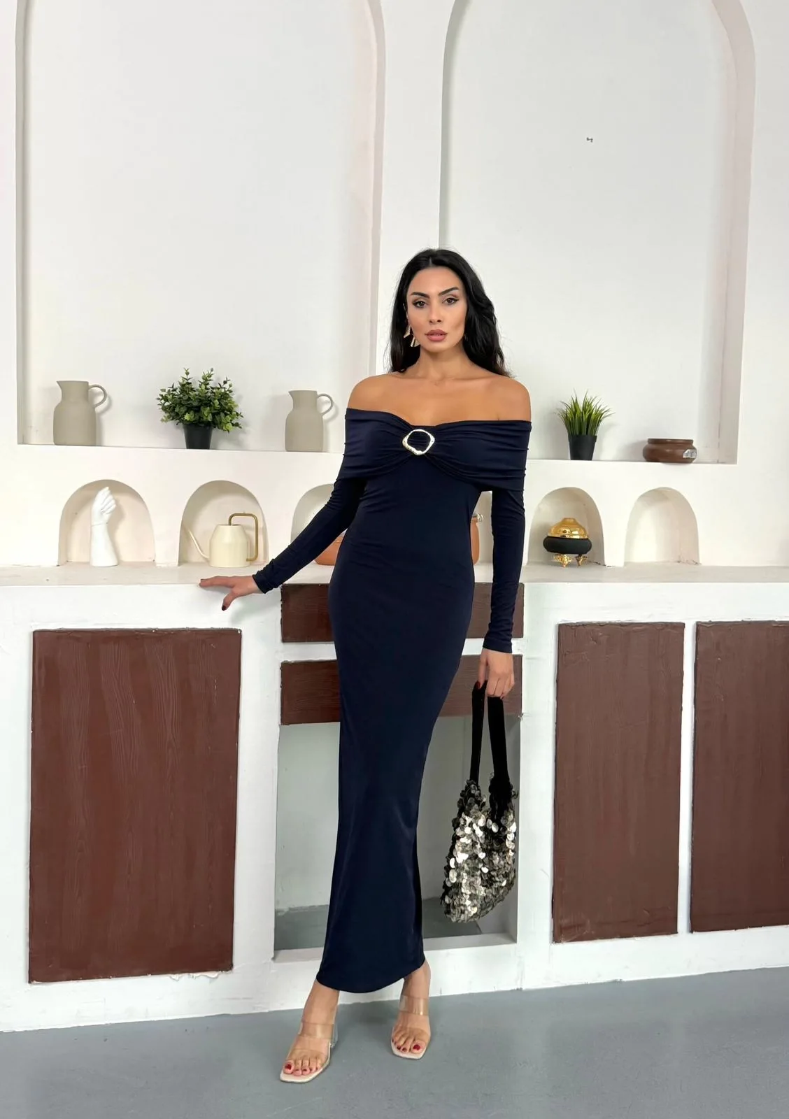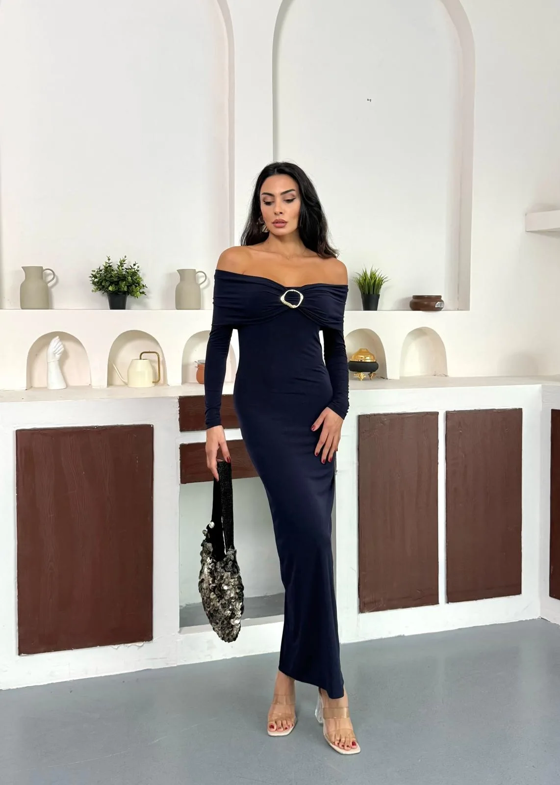 Lacivert Madonna Yaka Gold Aksesuarlı Uzun Kollu Vucudu Saran Uzun Midi Boy Elbise