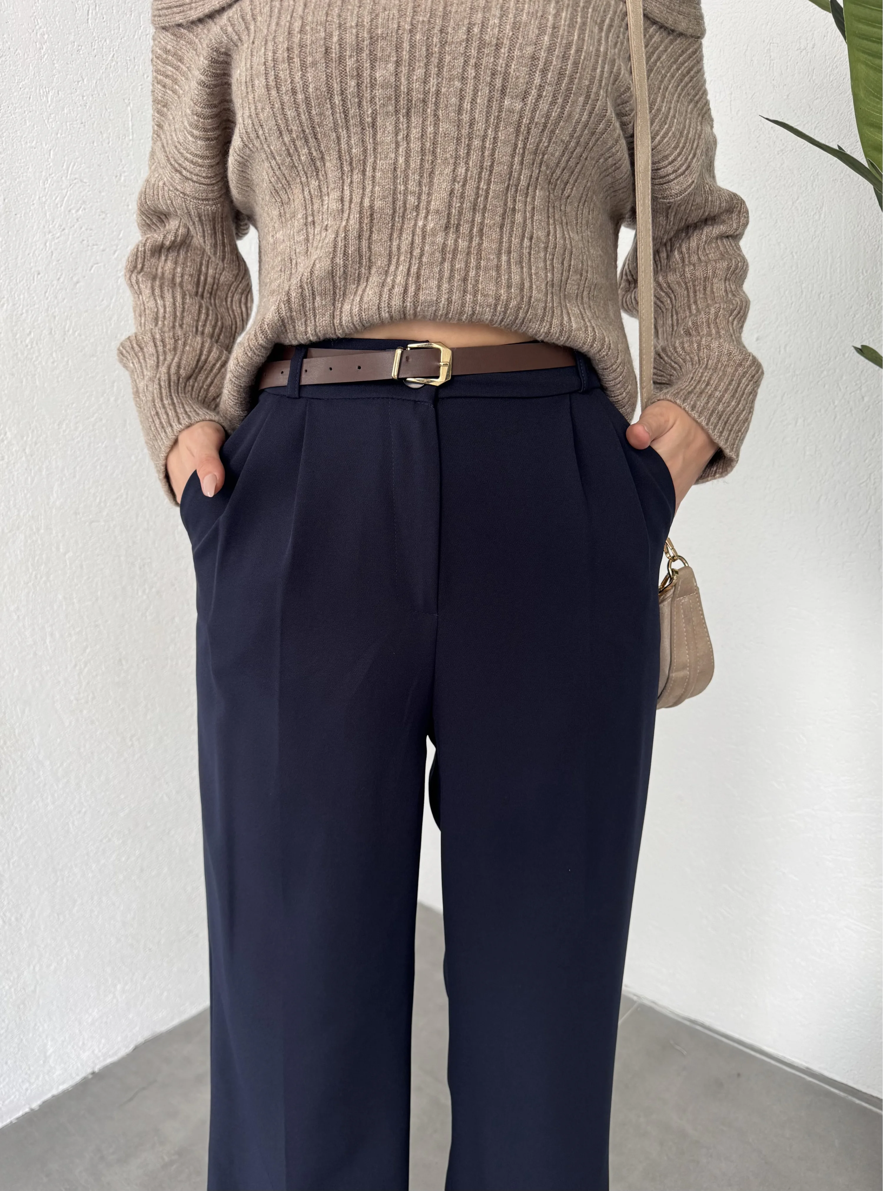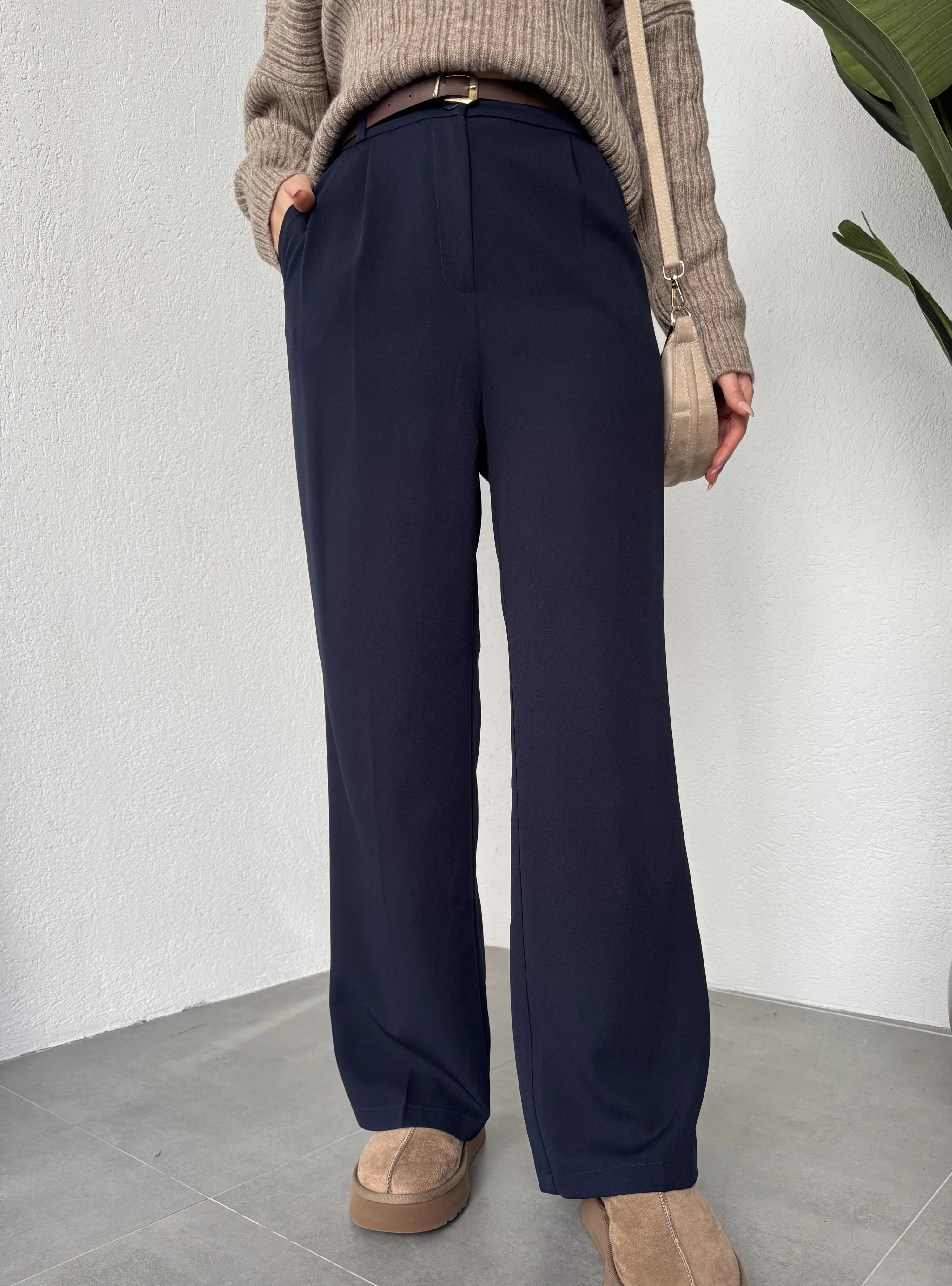 Lacivert Pileli Tam Kalıp Bel Oturtmalı Geniş Paça Palazzo Pantolon