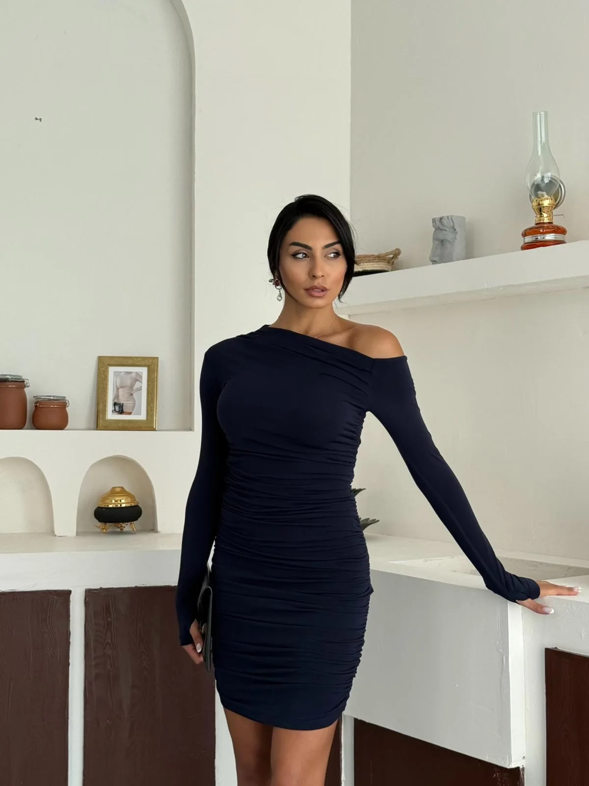 Lacivert Tek Omuz Kayık Yaka Büzgülü Parmak Geçirmeli Mini Boy Candy Elbise