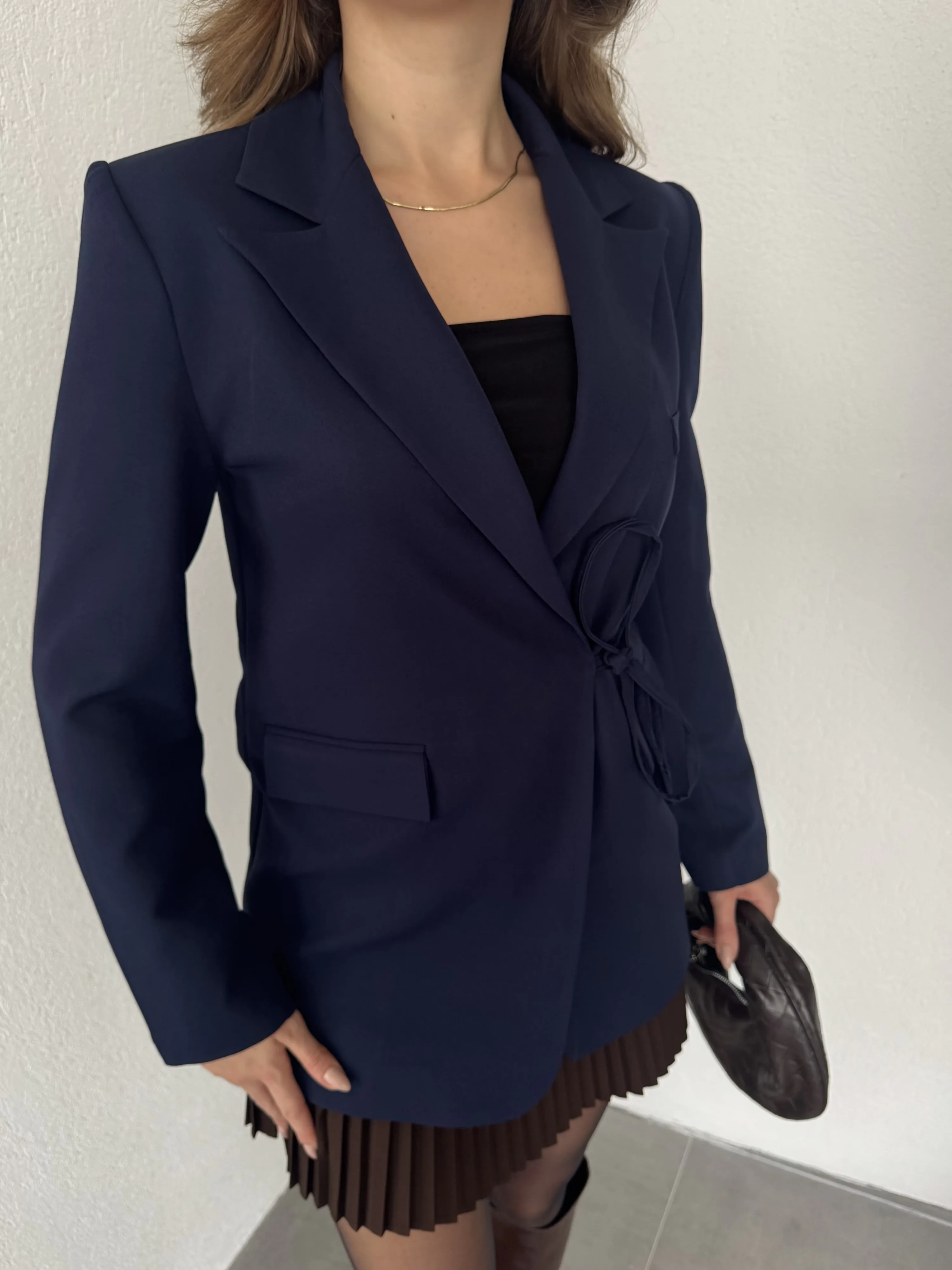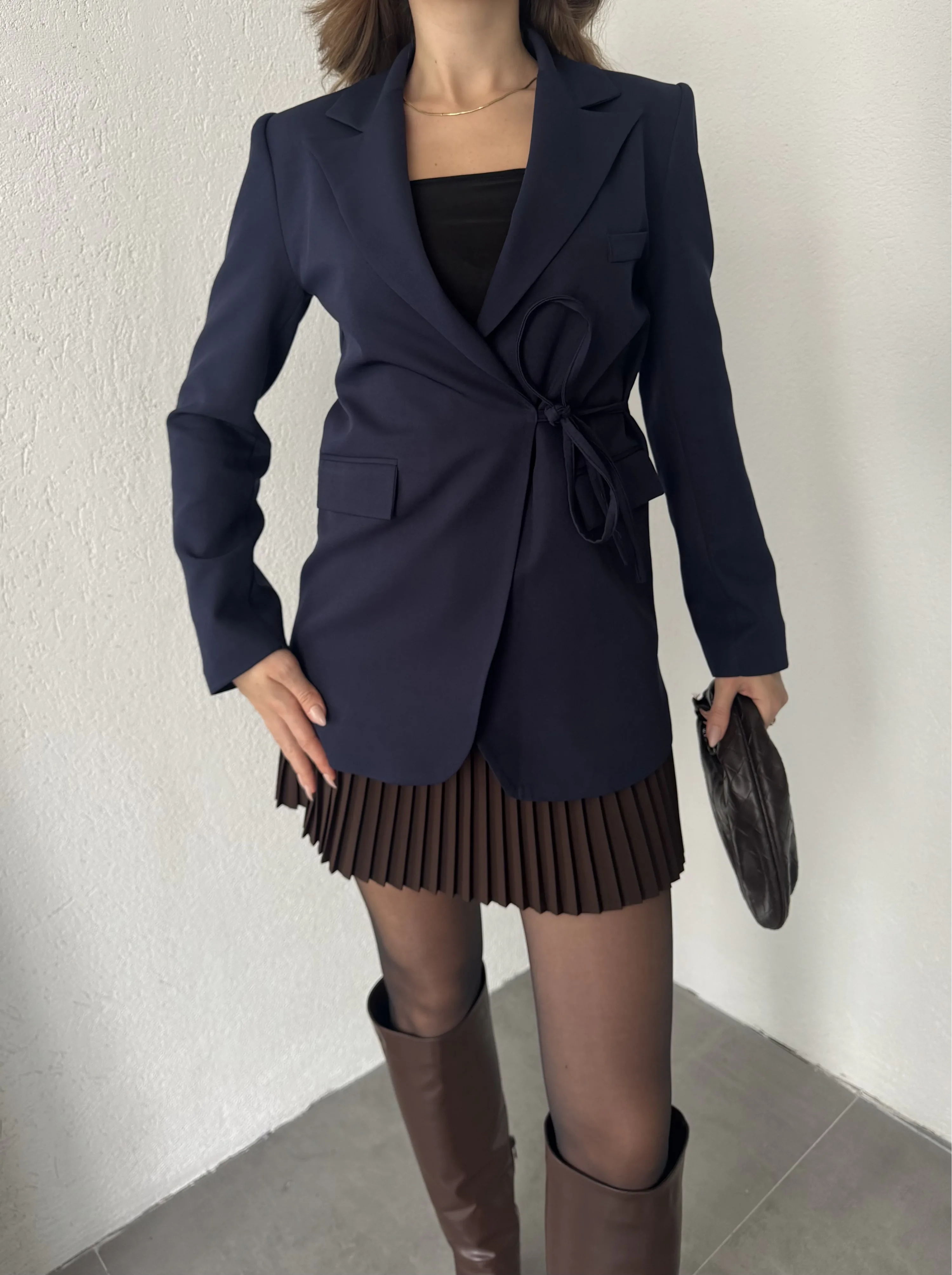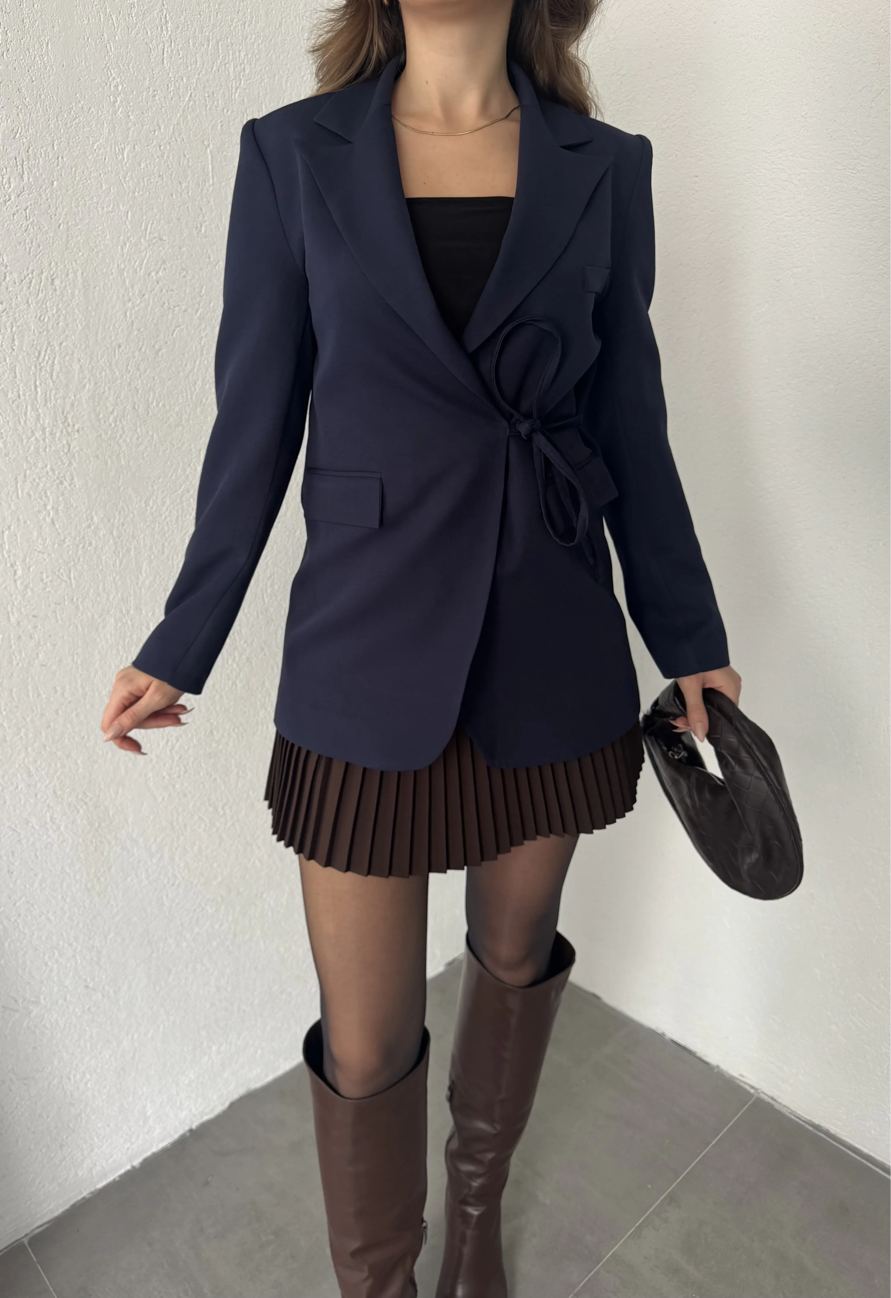 Lacivert Yandan Bağlamalı Astarlı Günlük Ceket