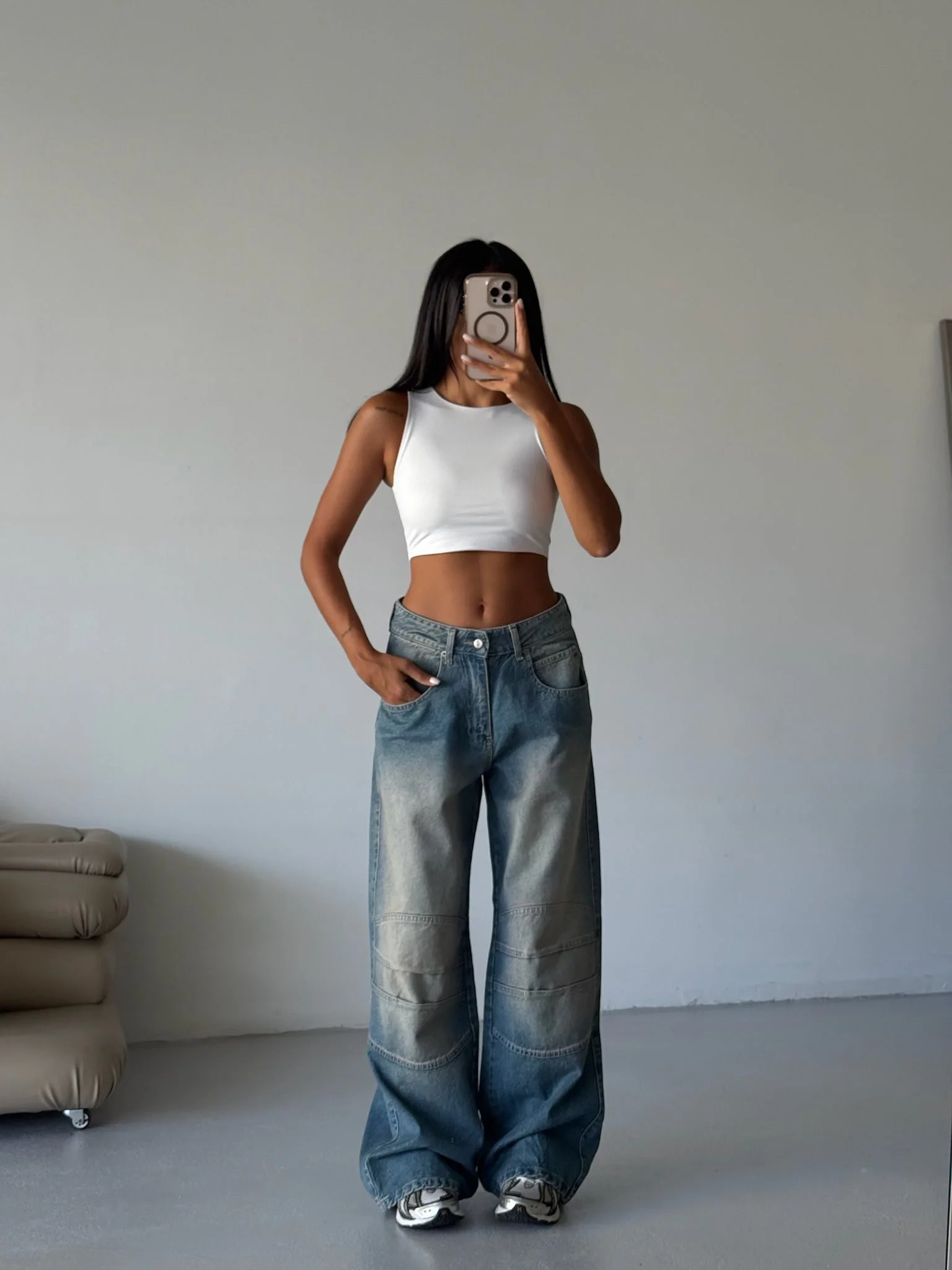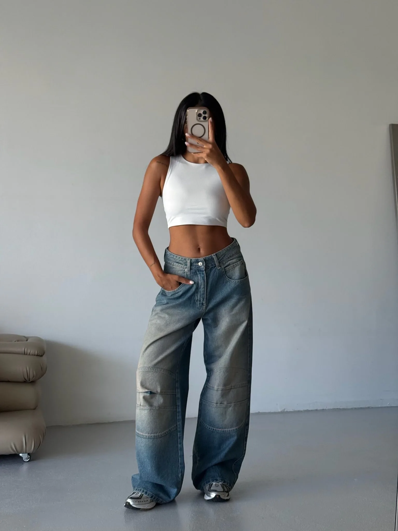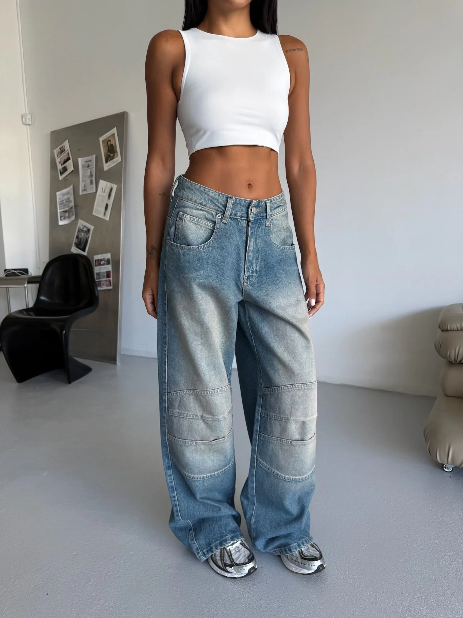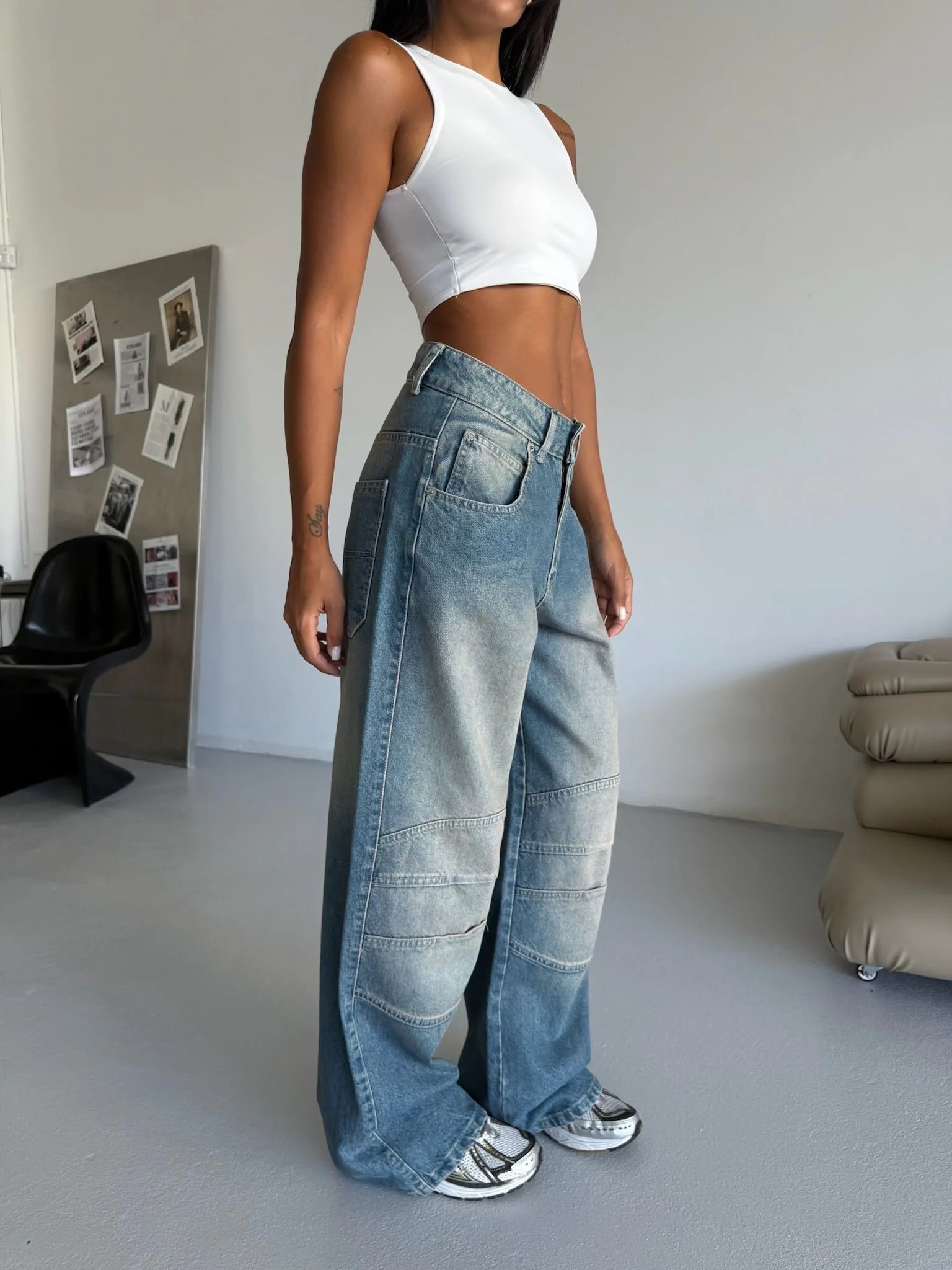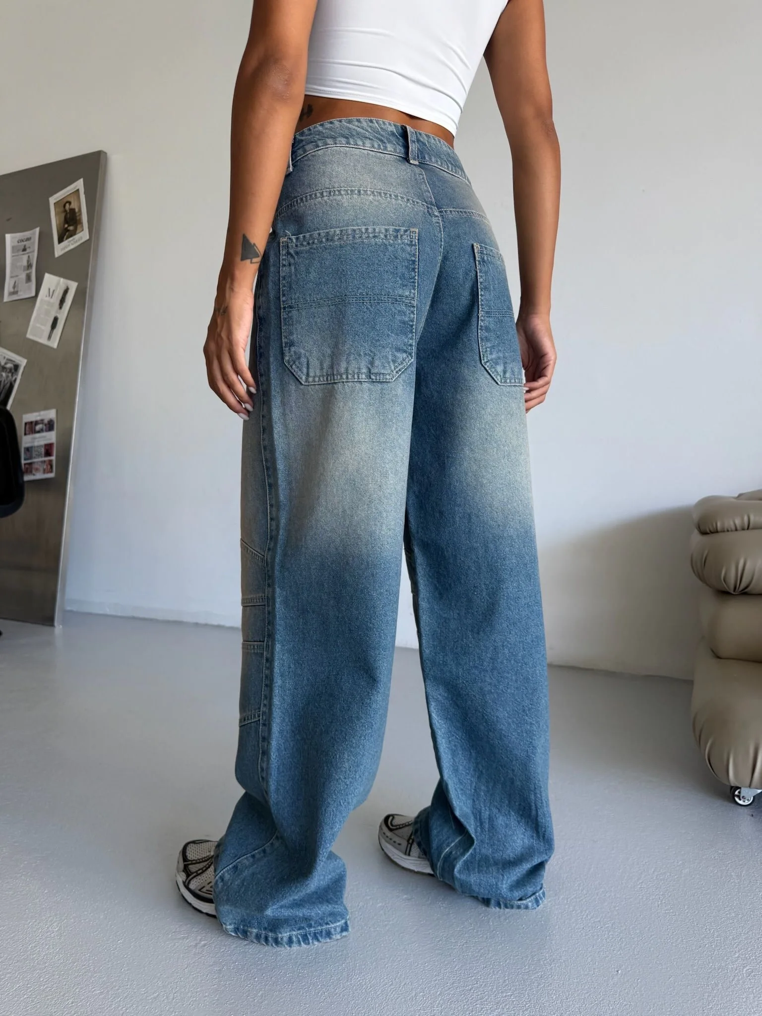 Mavi Dizi Dikiş Detaylı Retro Yeşil Yıkamalı Baggy Geniş Paça Yüksek Bel Oturtmalı Jean Kot Pantolon