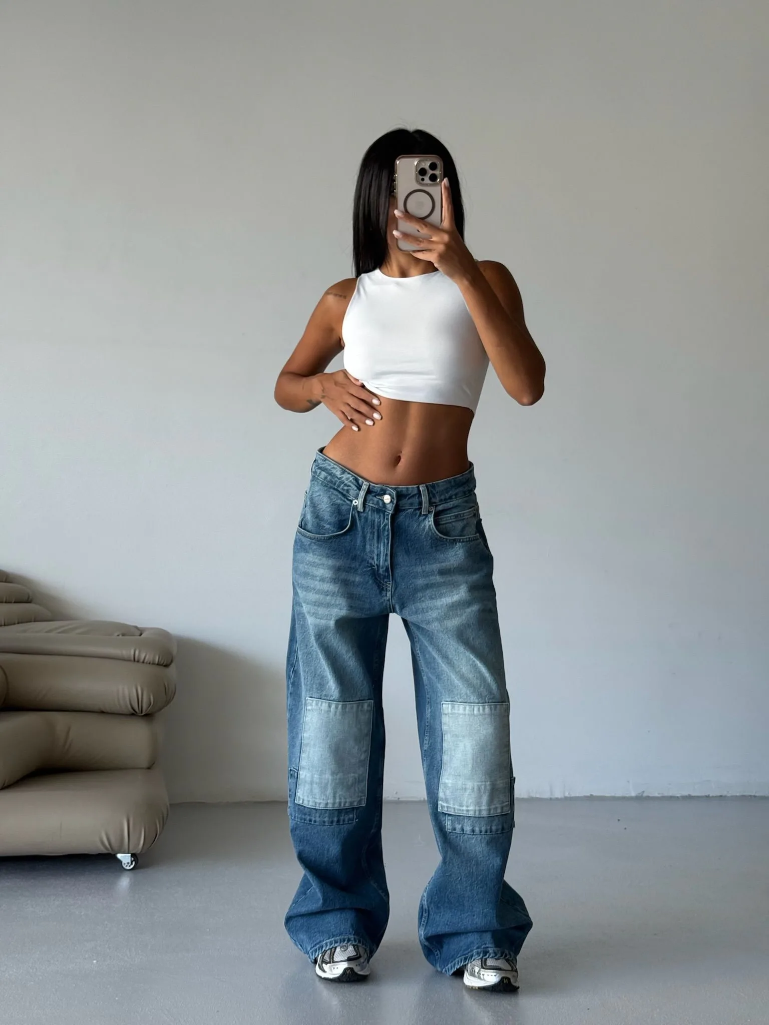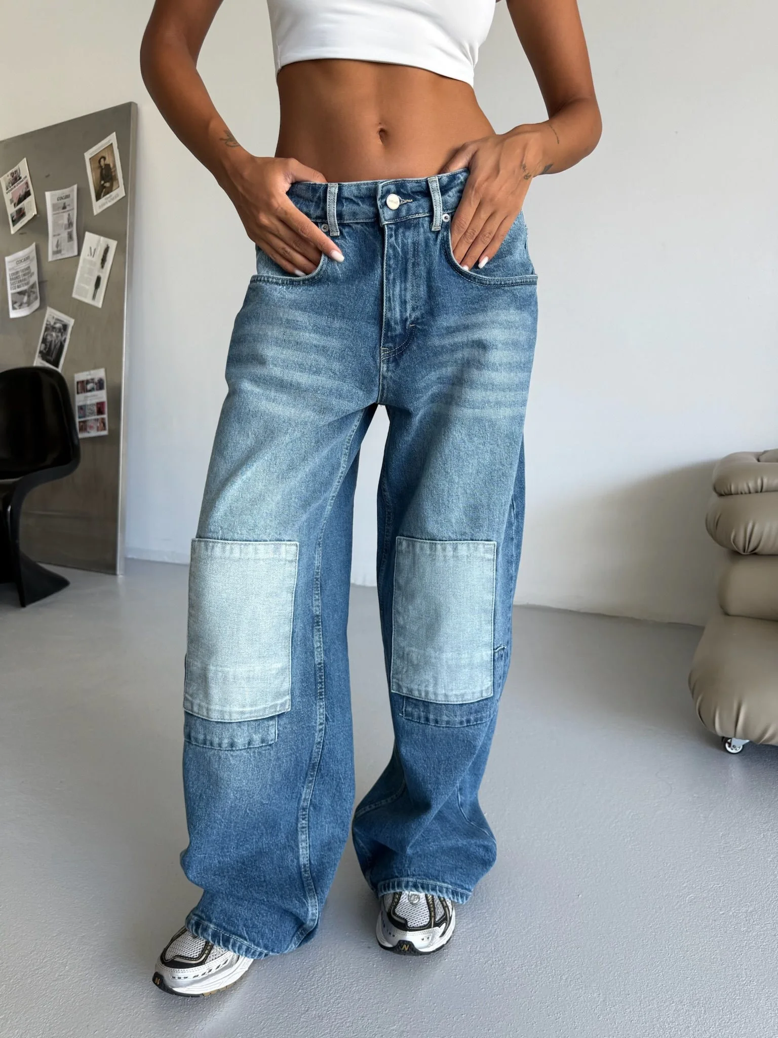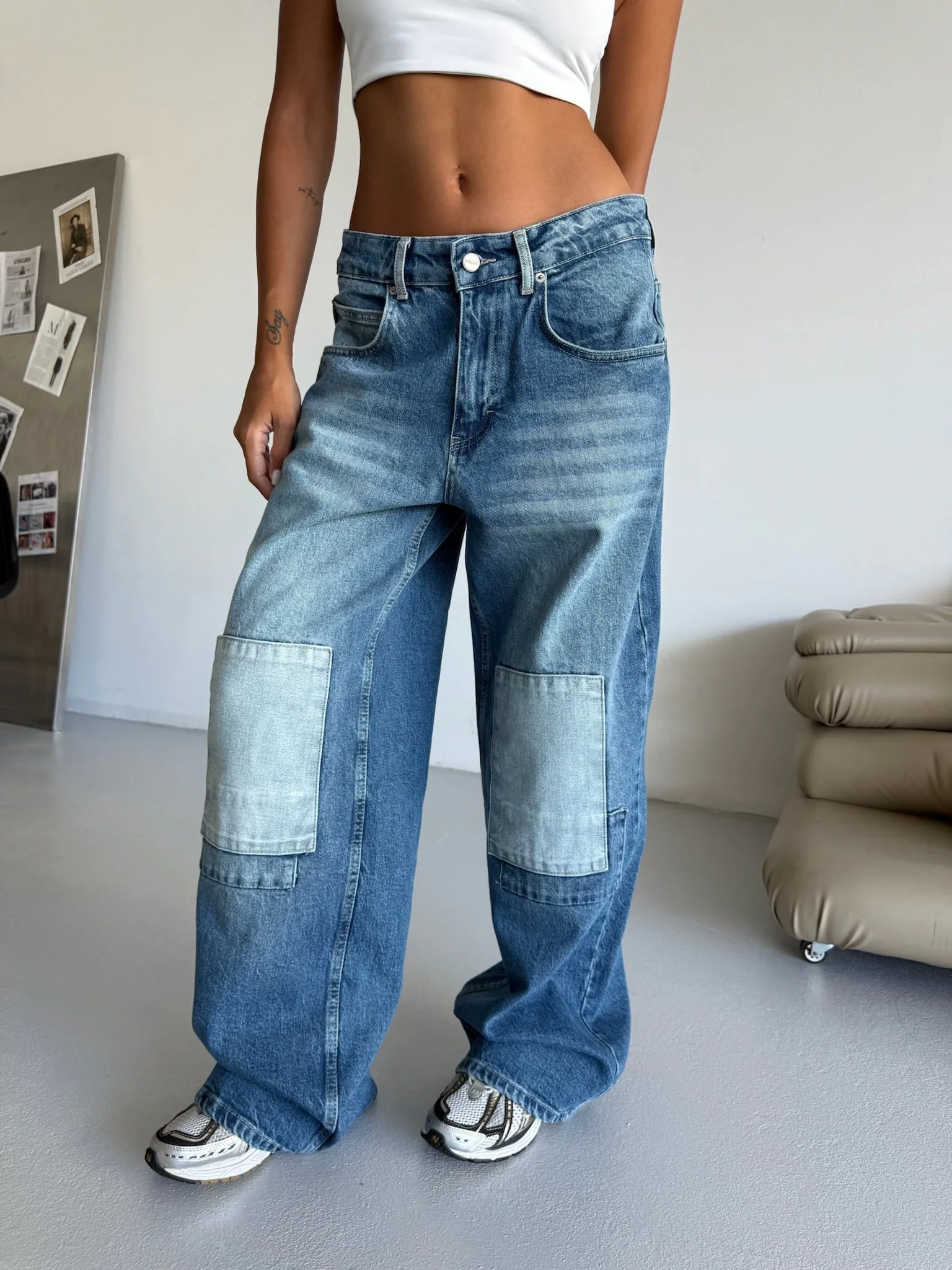 Mavi Dizi Yamalı Retro Yıkamalı Baggy Geniş Paça Yüksek Bel Oturtmalı Jean Kot Pantolon