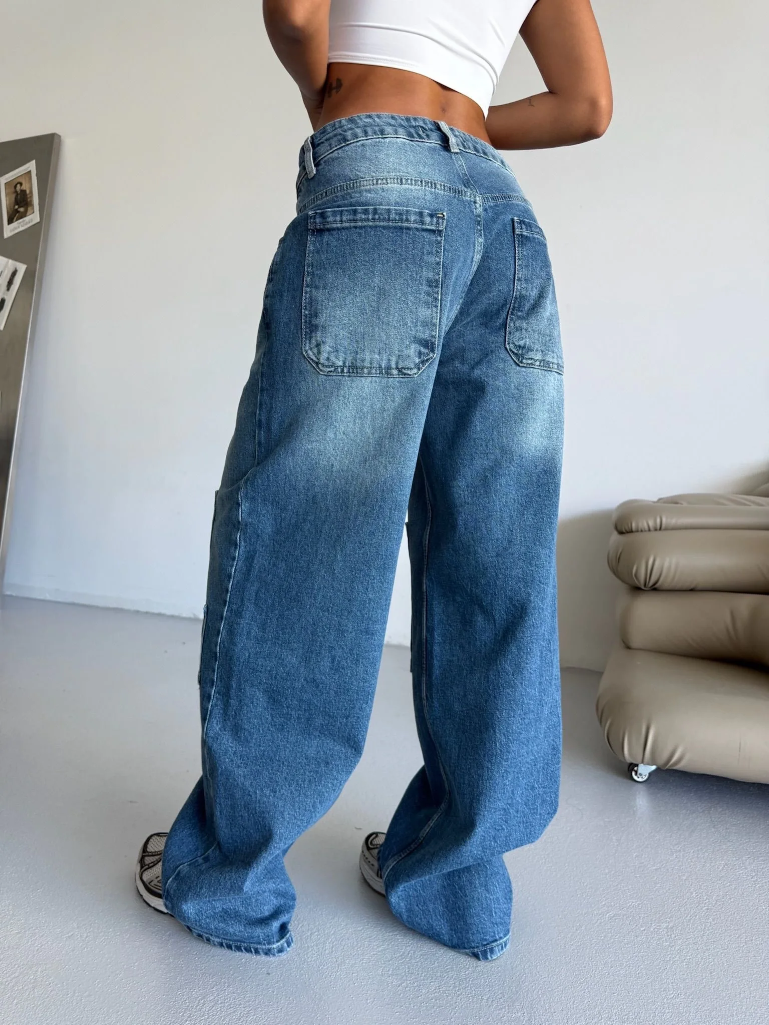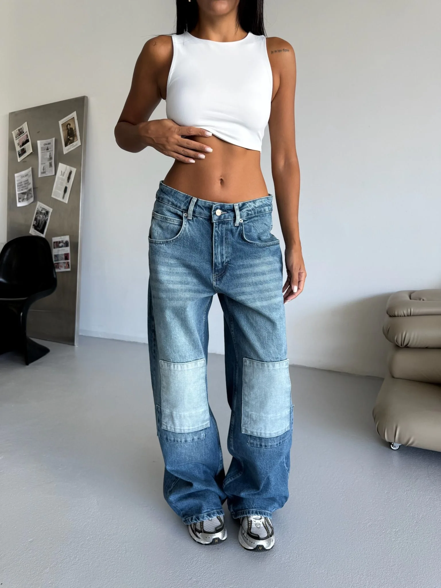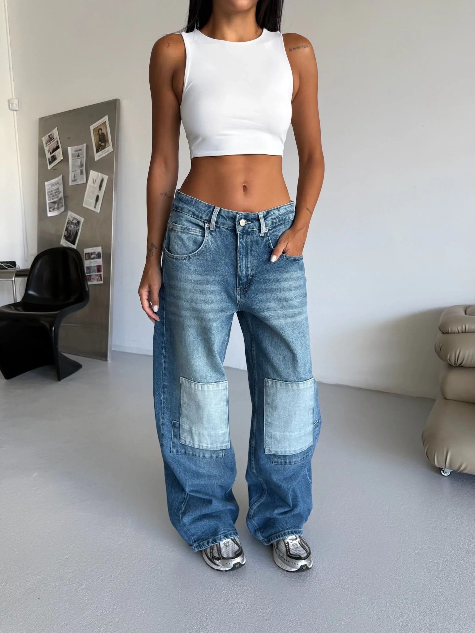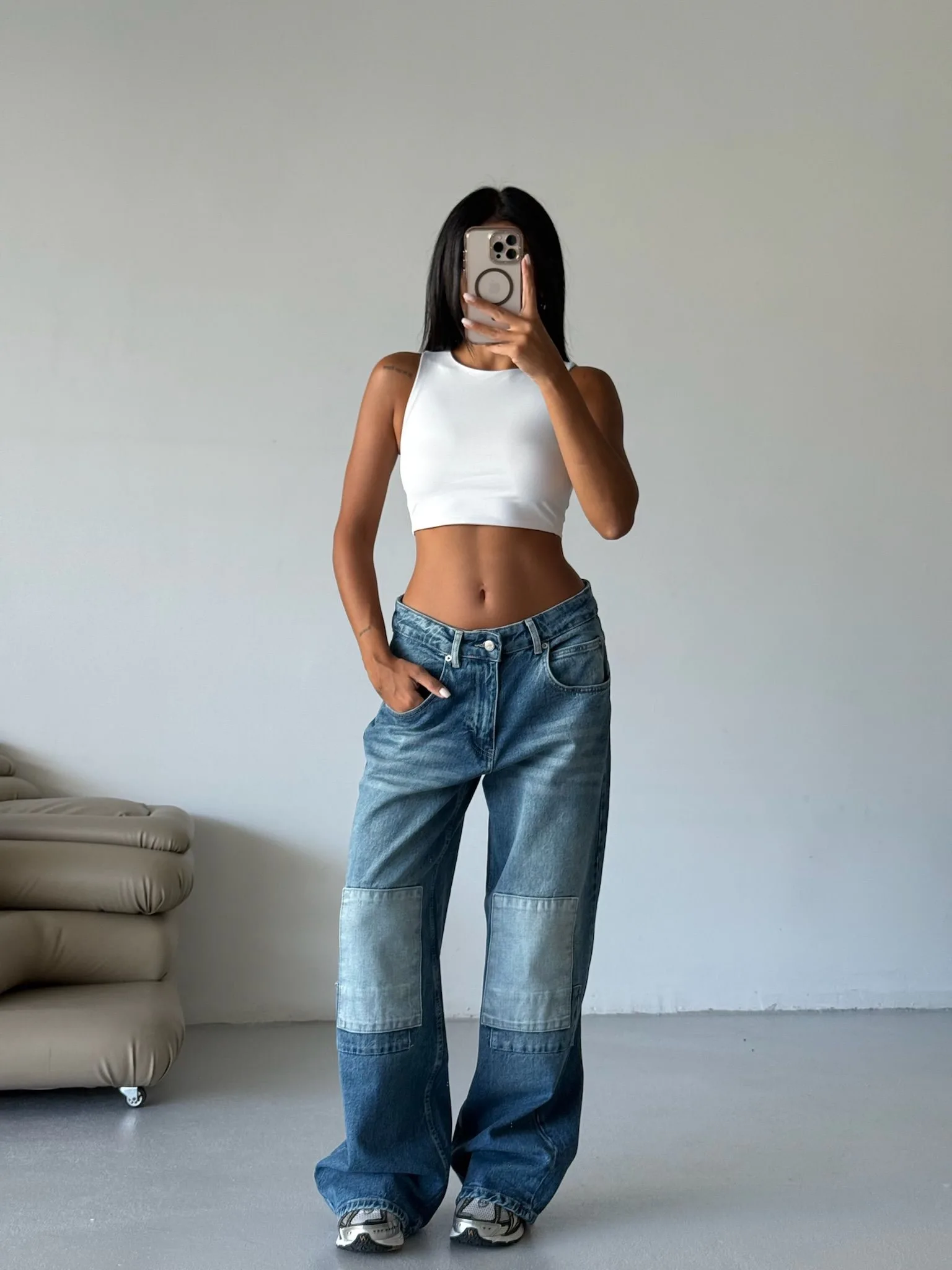 Mavi Dizi Yamalı Retro Yıkamalı Baggy Geniş Paça Yüksek Bel Oturtmalı Jean Kot Pantolon