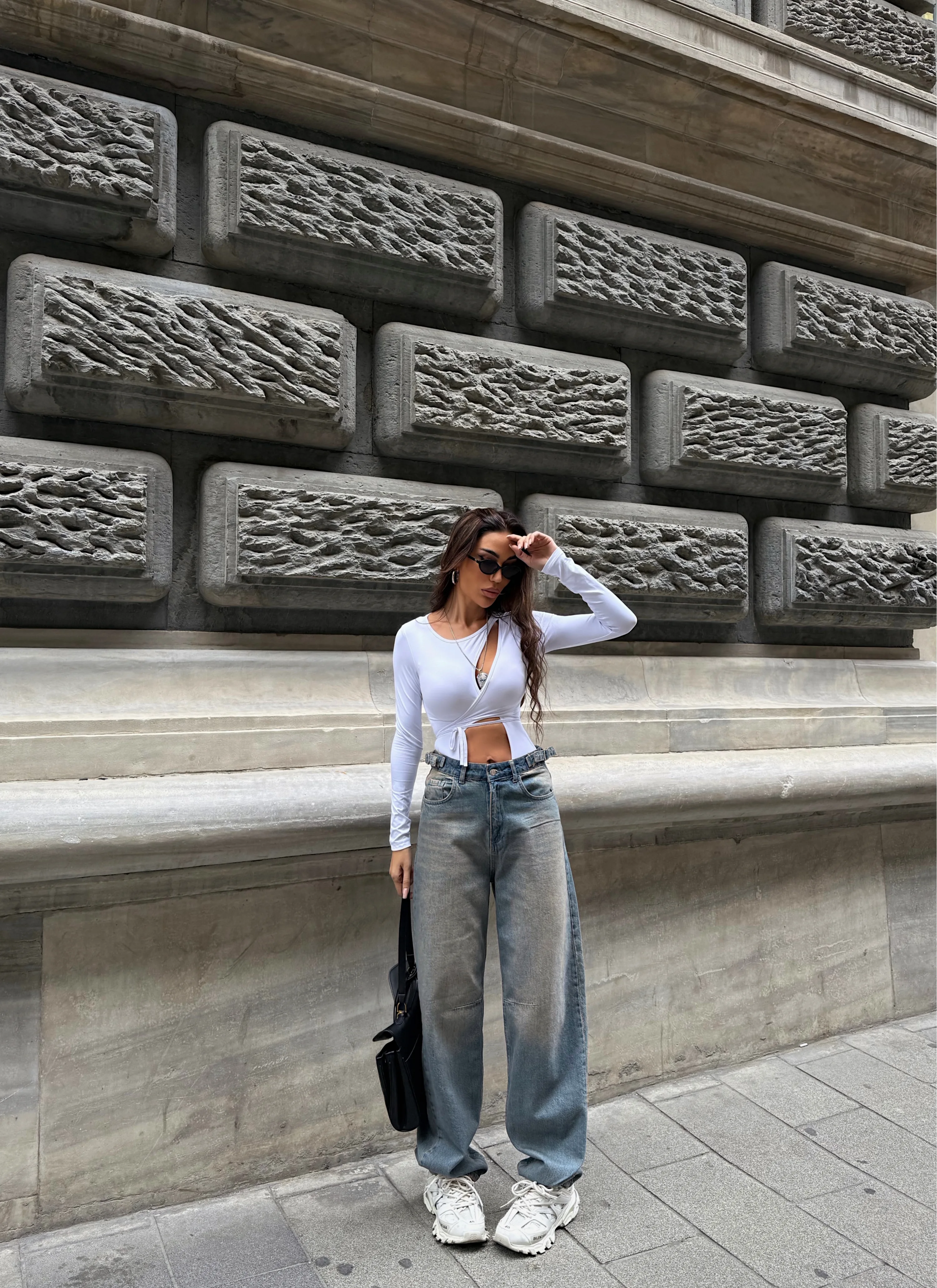 Mavi Kemerinde Tokalı Yeşil Yıkamalı Baggy Geniş Paça Yüksek Bel Oturtmalı Jean Kot Pantolon