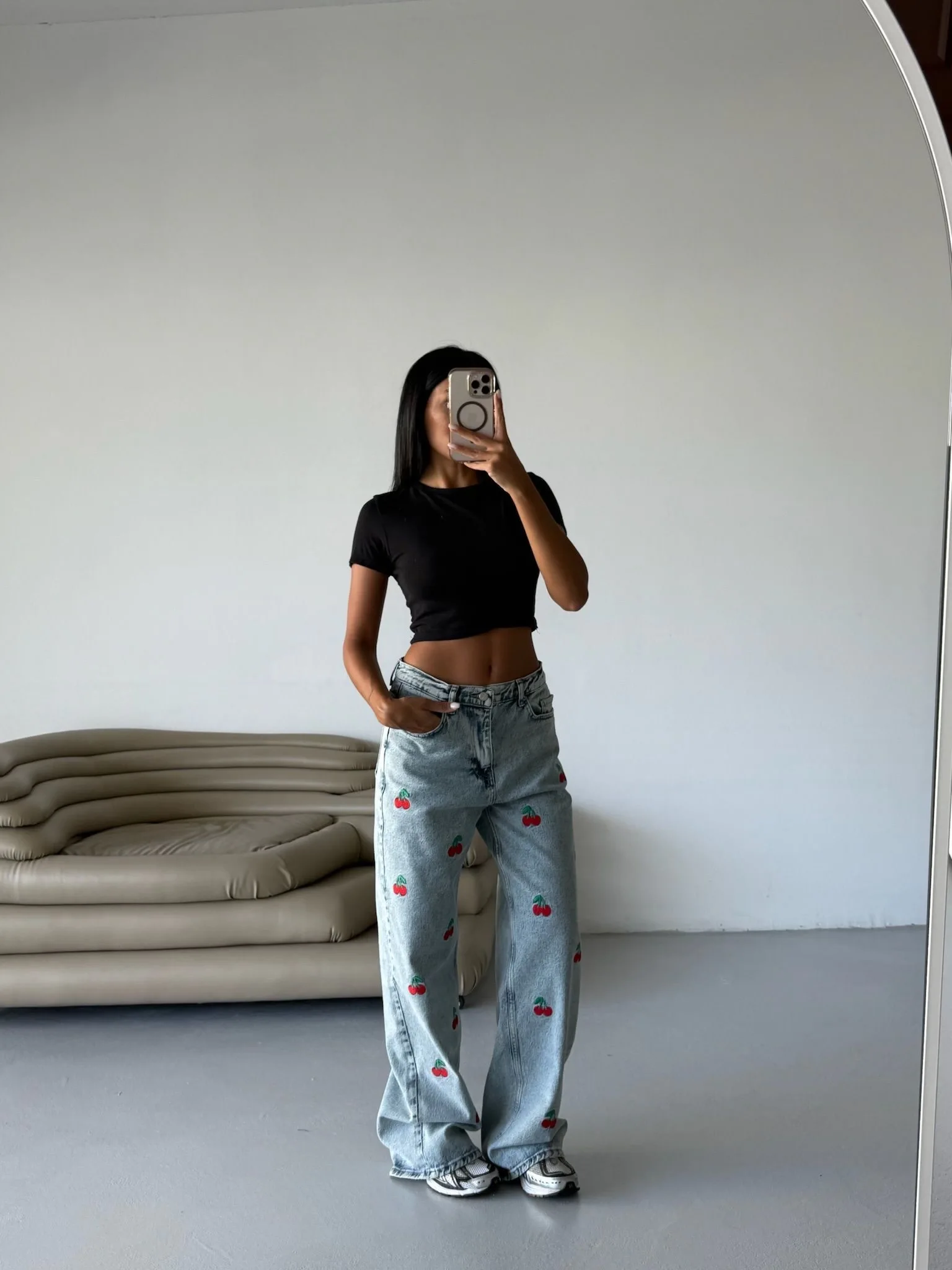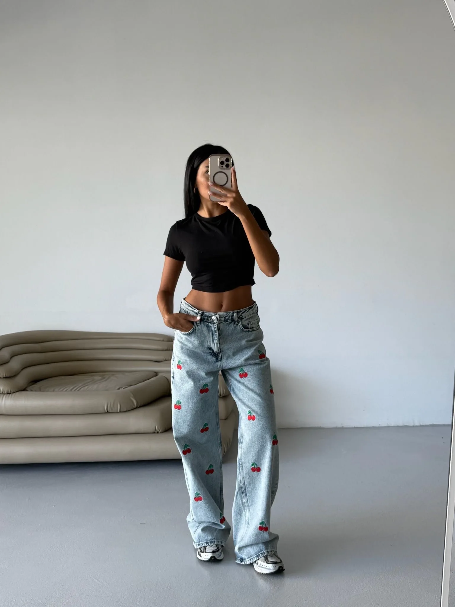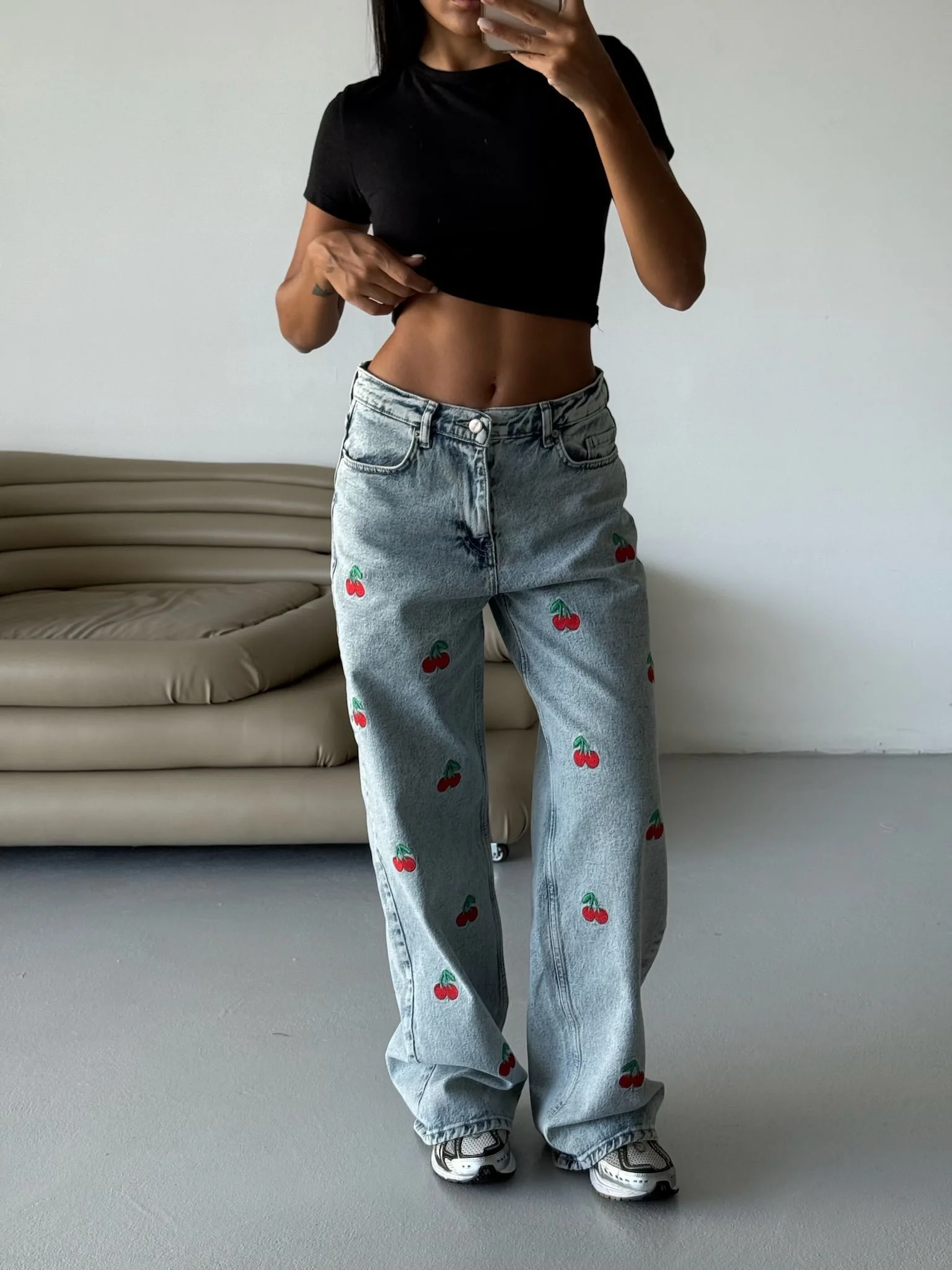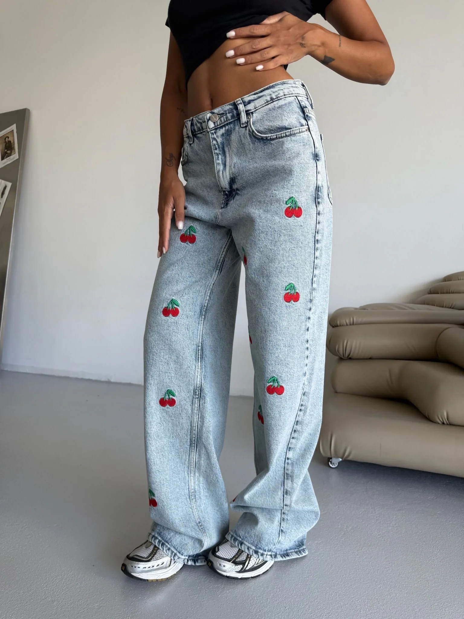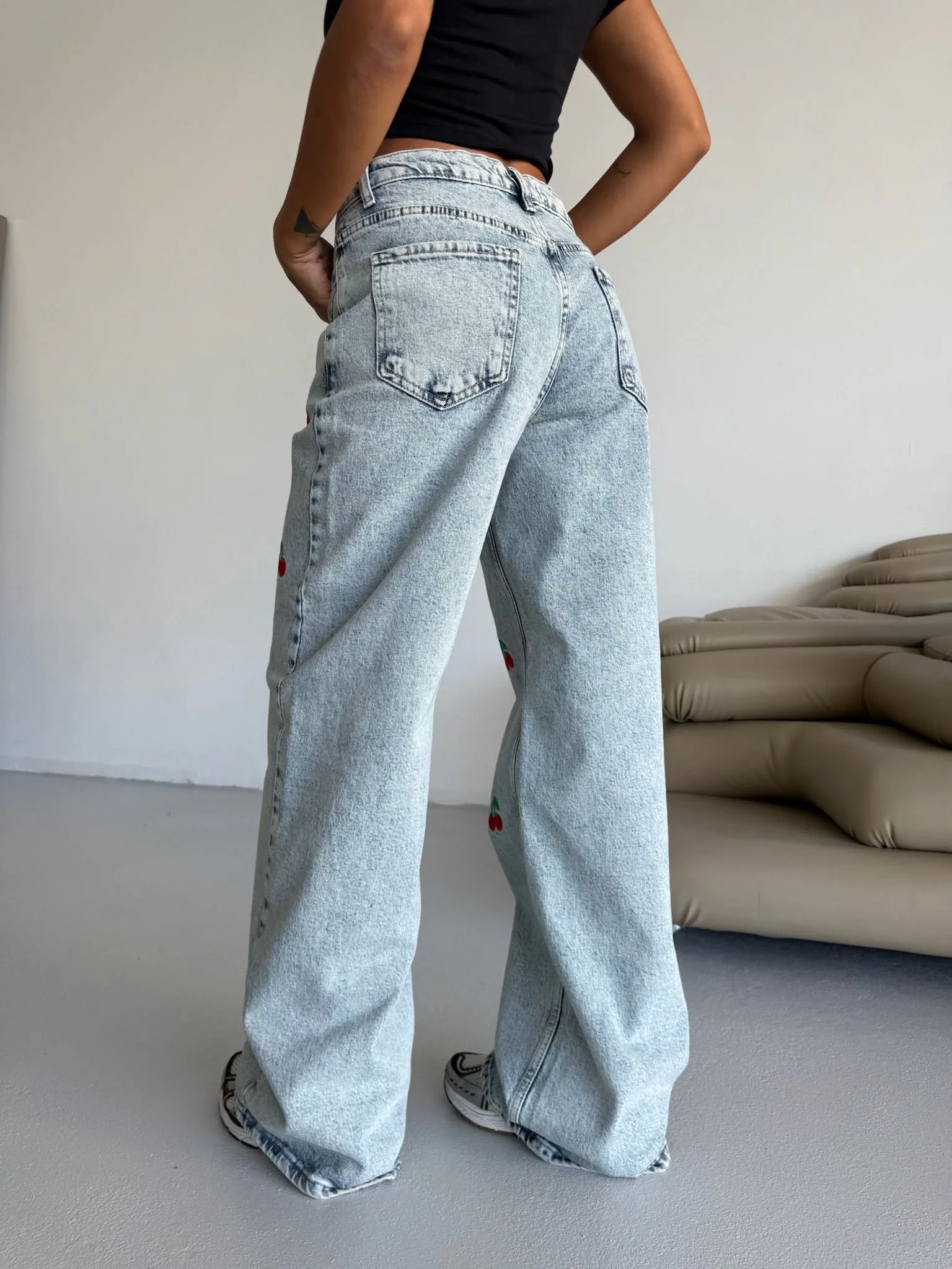 Mavi Kiraz İşlemeli Yıkamalı Baggy Geniş Paça Yüksek Bel Oturtmalı Jean Kot Pantolon