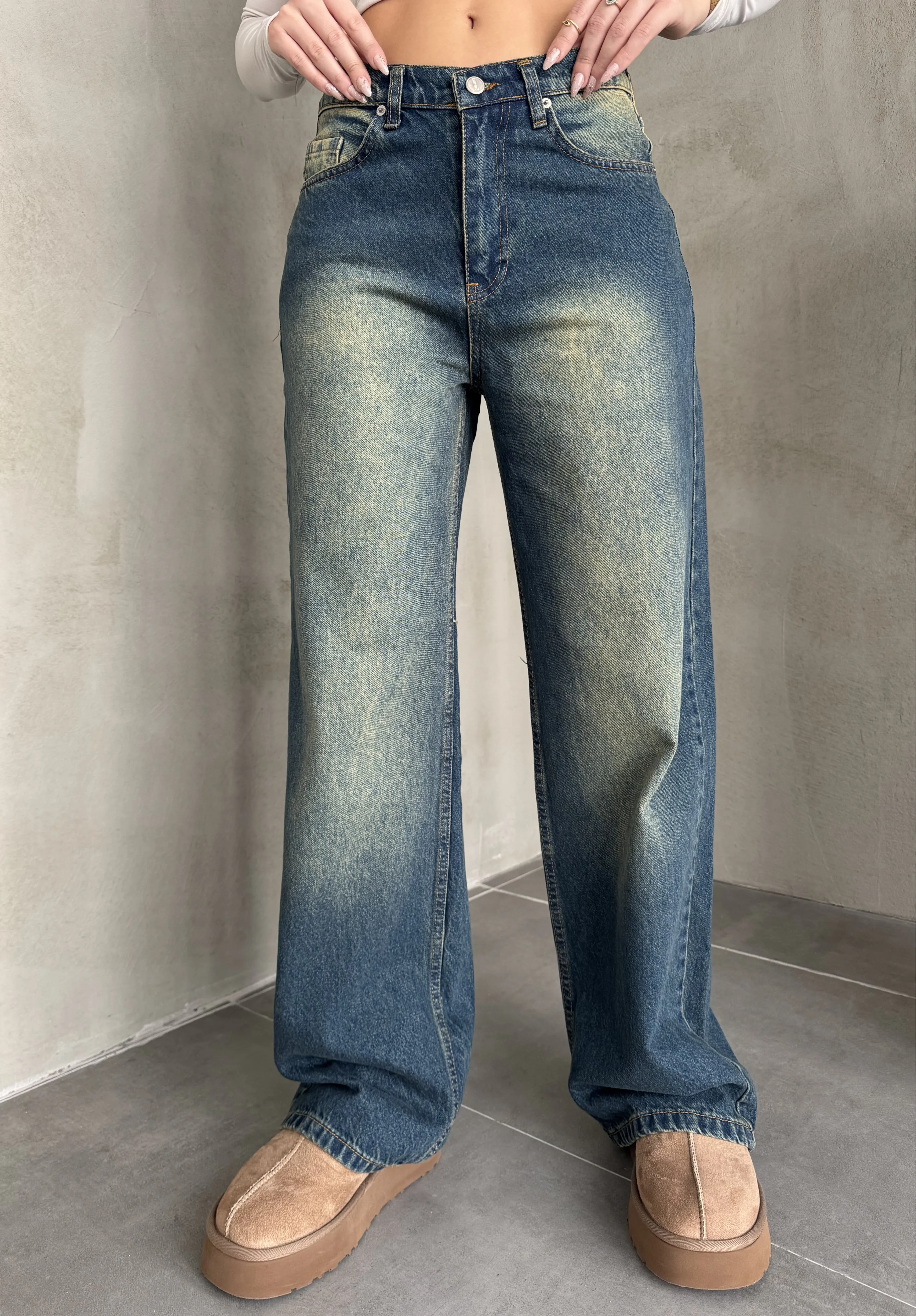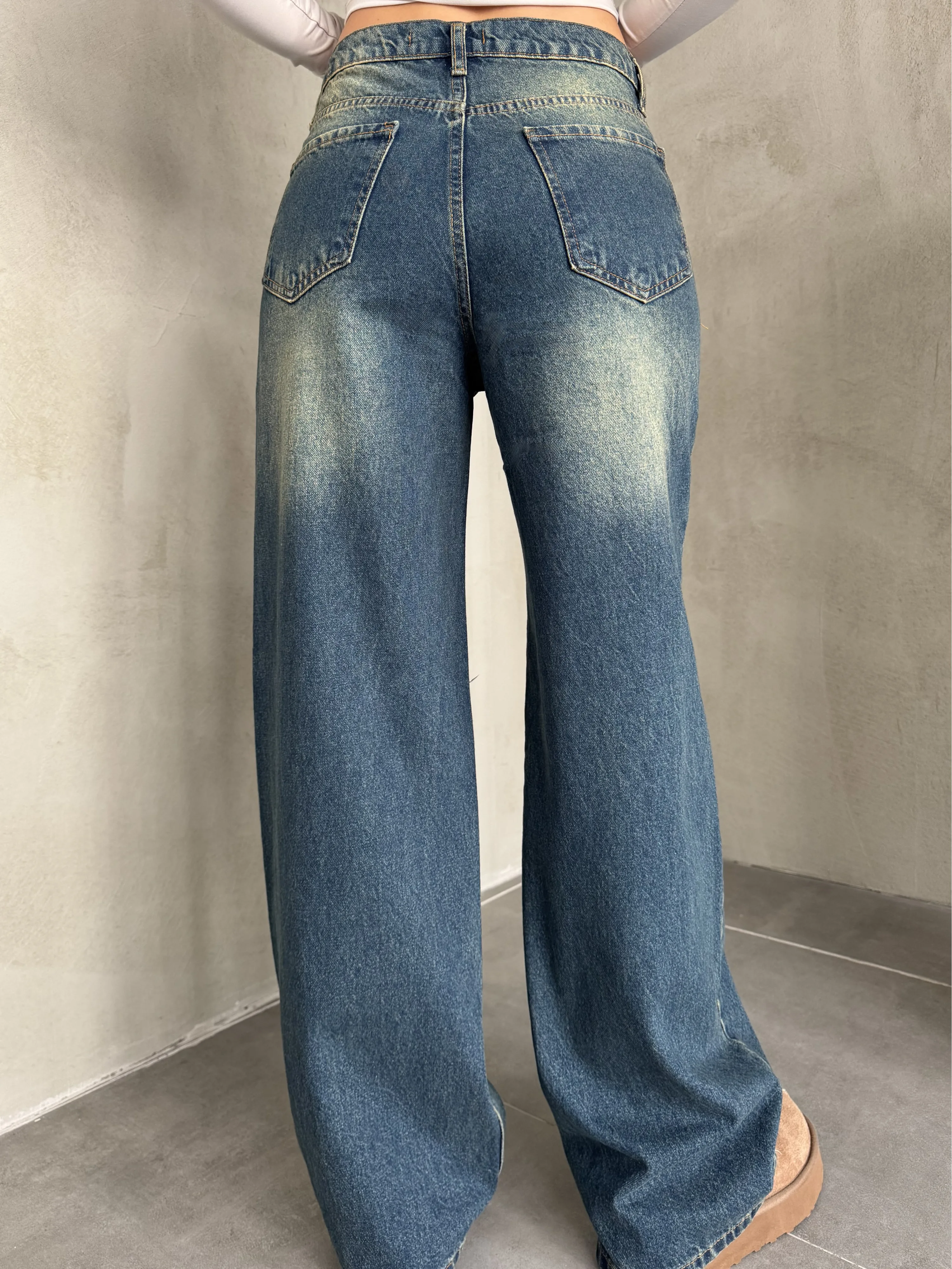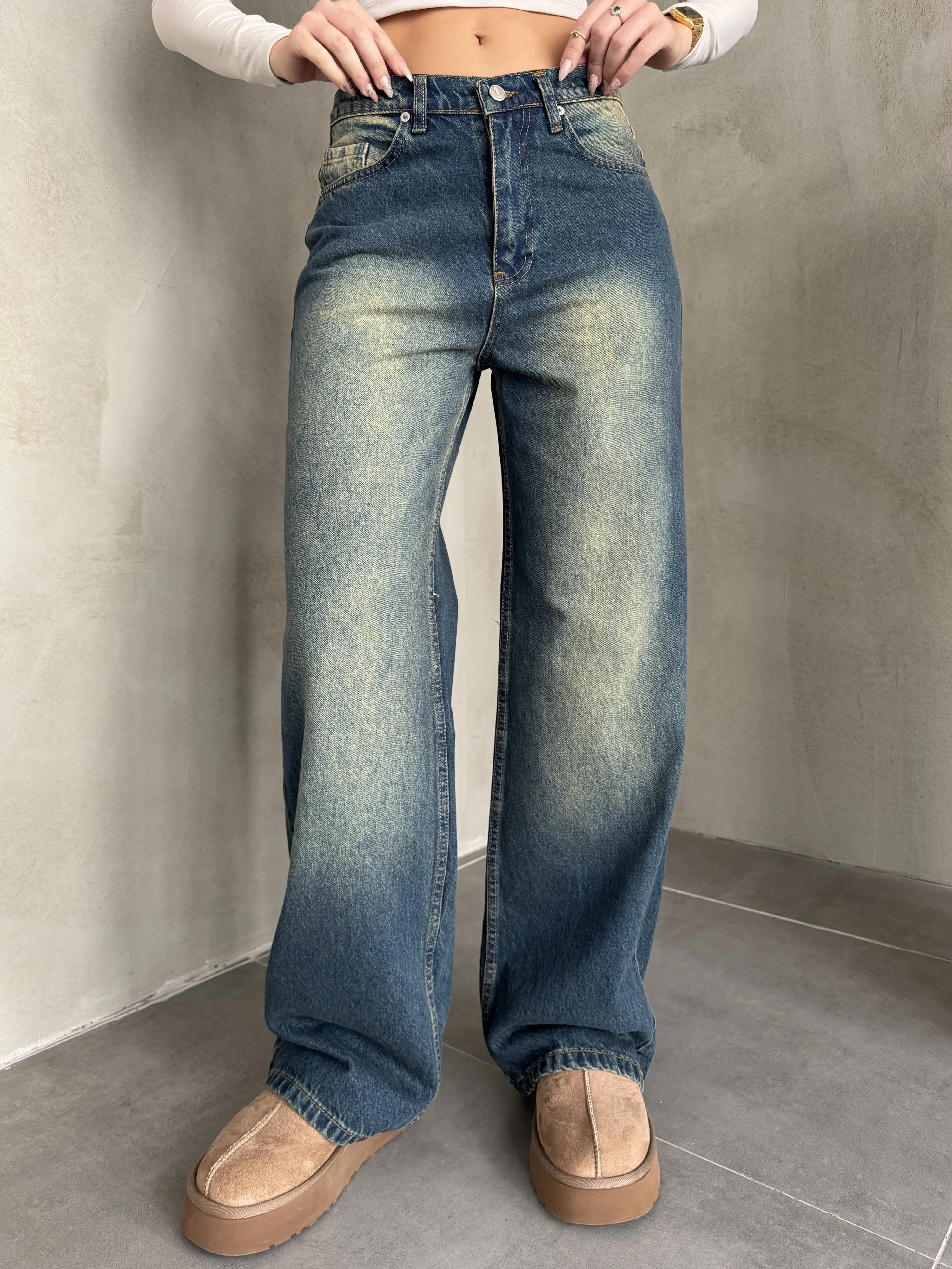 Yıkamalı Baggy Geniş Paça Yüksek Bel Wide Leg Jean Kot Pantolon