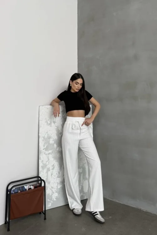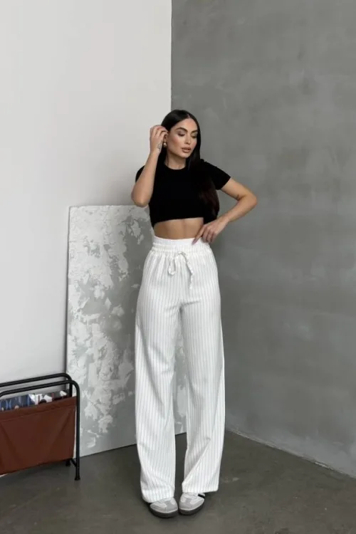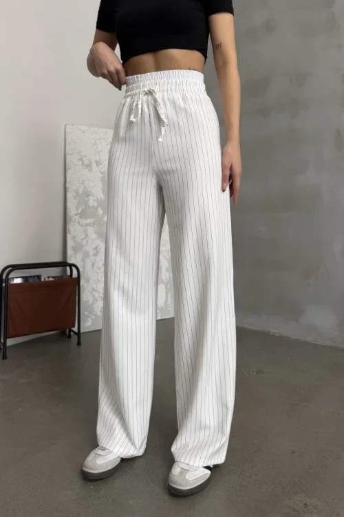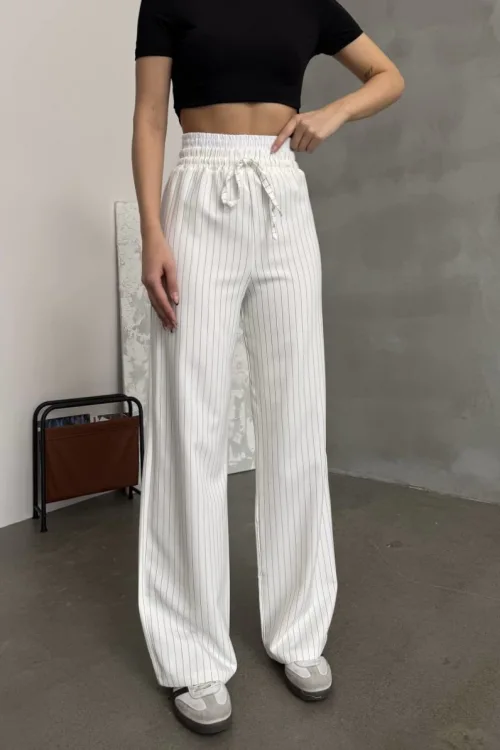 Beyaz Çizgili Çift Bel Detaylı İp Bağlamalı Palazzo Pantolon