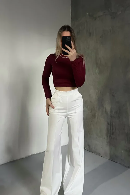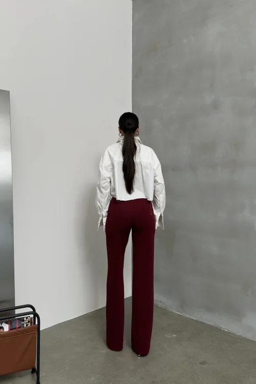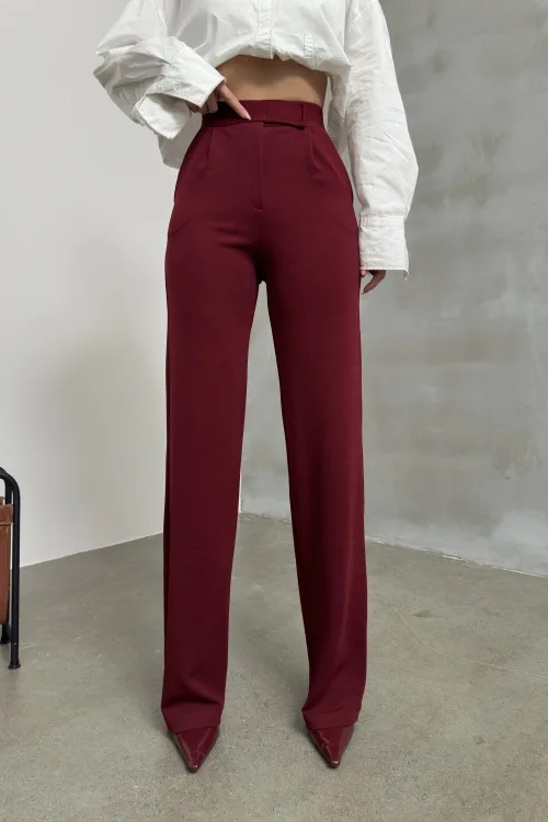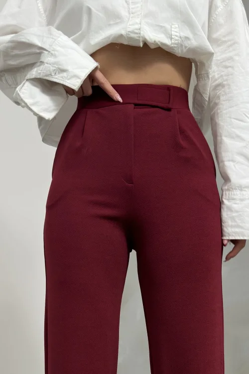 Bordo Yüksek Bel Cırtlı Bel Oturtmalı Palazzo Pantolon